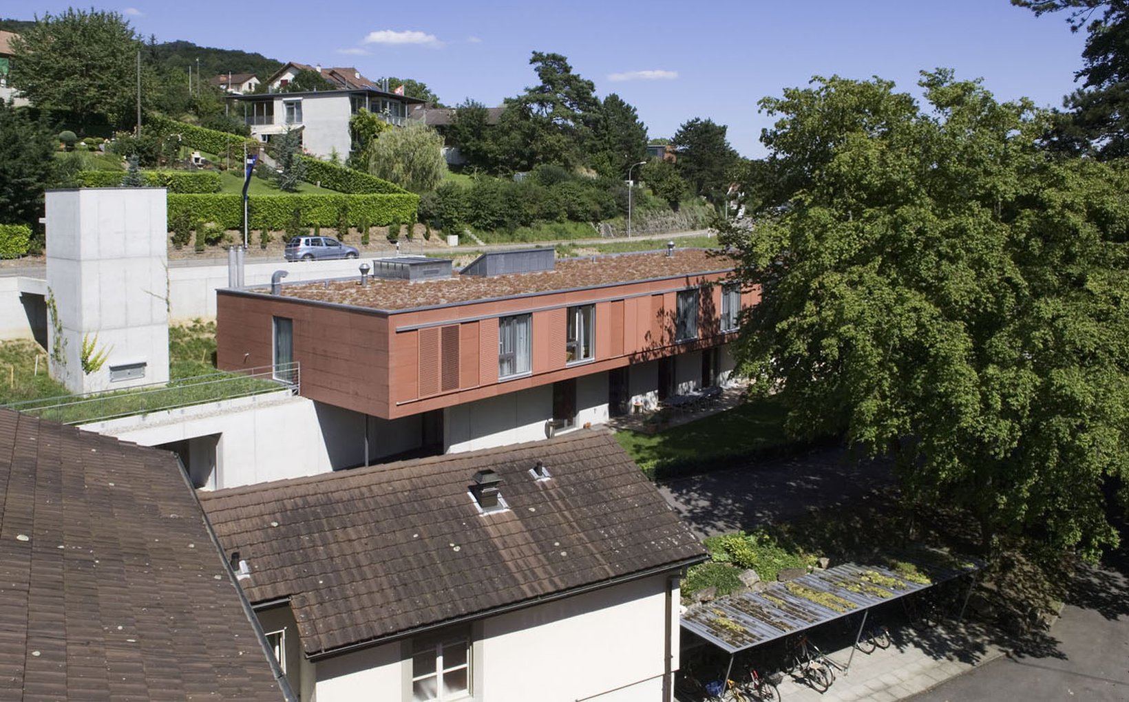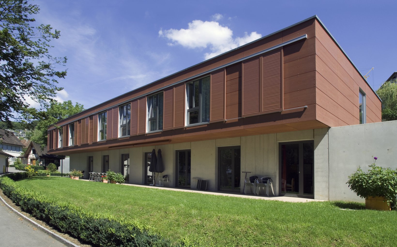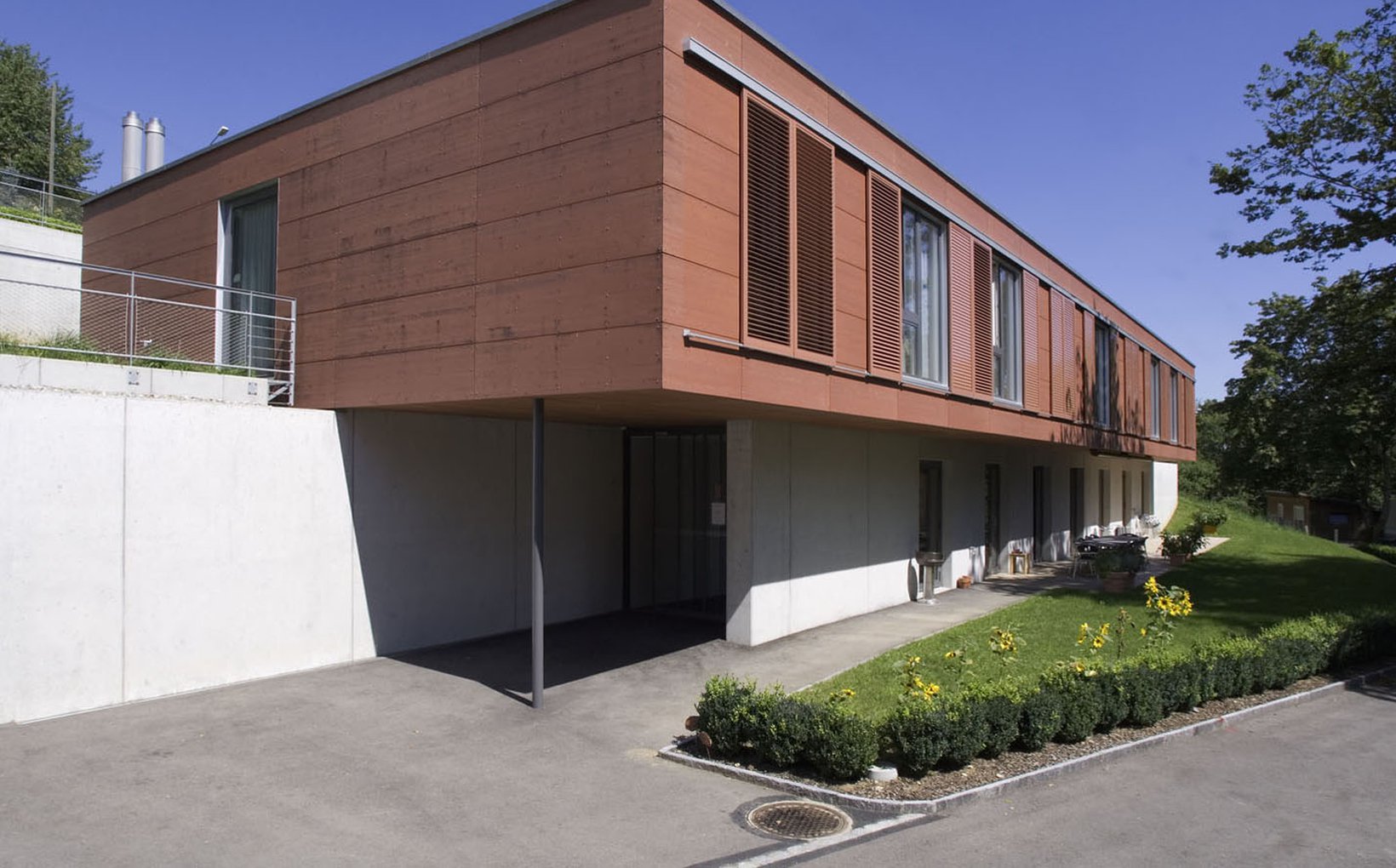 fsp: Der Neubau gliedert sich harmonisch in die bestehende Topografie ein. Durch seine Anordnung entsteht vor dem Eingang des Neubaus und der Turnhalle ein Vorplatz – ein Thema, das innerhalb des Schlossareals von zentraler Bedeutung ist. Die Platzierung des Neubaus bewirkt einen Wegfall der sehr hohen Stützwand. Aus der bisher beengenden räumlichen Situation entsteht ein sich öffnender, Bereich, der einen Ausblick vom Backhaus bis an das östliche Grundstücksende gewährt. Durch die bloss zweigeschossige Bauweise bleiben die Sichtbezüge von der Kantonsstrasse in Richtung Schloss und Schlosspark erhalten. Der Neubau bietet grosszügige Einzelzimmer, die verschiedene Möblierungsvarianten erlauben. Raumhohe Fensterelemente mit Südwest- Orientierung und Aussicht belichten die gesamte Raumtiefe natürlich. Die offene Familienküche mit grossem Ess- und Wohnbereich und dem direkten Anschluss an den Beschäftigungsraum eröffnen vielfältige Nutzungsmöglichkeiten.