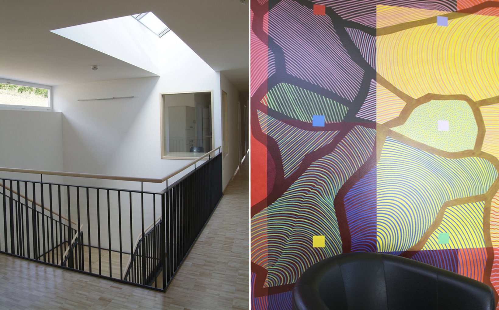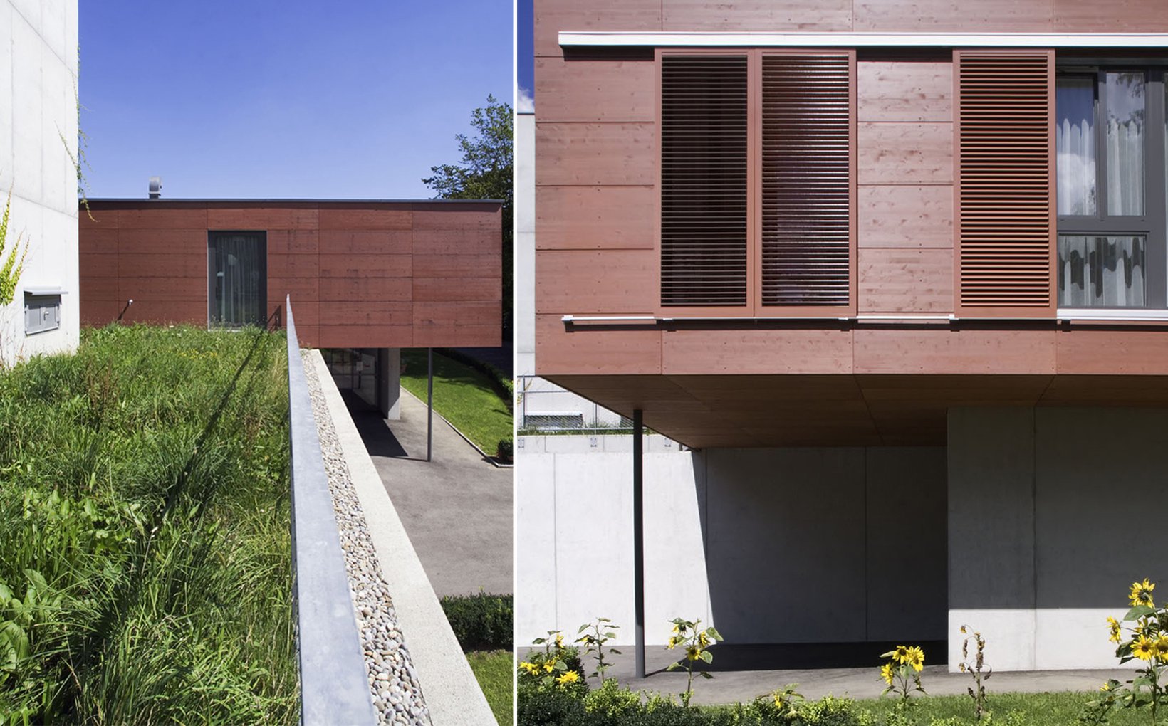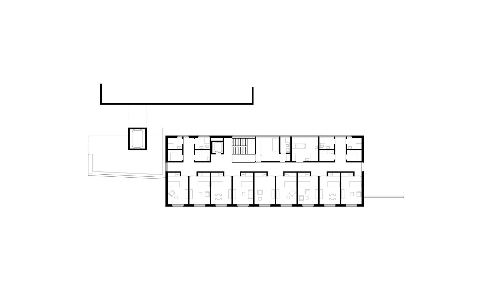 fsp: Der Neubau gliedert sich harmonisch in die bestehende Topografie ein. Durch seine Anordnung entsteht vor dem Eingang des Neubaus und der Turnhalle ein Vorplatz – ein Thema, das innerhalb des Schlossareals von zentraler Bedeutung ist. Die Platzierung des Neubaus bewirkt einen Wegfall der sehr hohen Stützwand. Aus der bisher beengenden räumlichen Situation entsteht ein sich öffnender, Bereich, der einen Ausblick vom Backhaus bis an das östliche Grundstücksende gewährt. Durch die bloss zweigeschossige Bauweise bleiben die Sichtbezüge von der Kantonsstrasse in Richtung Schloss und Schlosspark erhalten. Der Neubau bietet grosszügige Einzelzimmer, die verschiedene Möblierungsvarianten erlauben. Raumhohe Fensterelemente mit Südwest- Orientierung und Aussicht belichten die gesamte Raumtiefe natürlich. Die offene Familienküche mit grossem Ess- und Wohnbereich und dem direkten Anschluss an den Beschäftigungsraum eröffnen vielfältige Nutzungsmöglichkeiten.