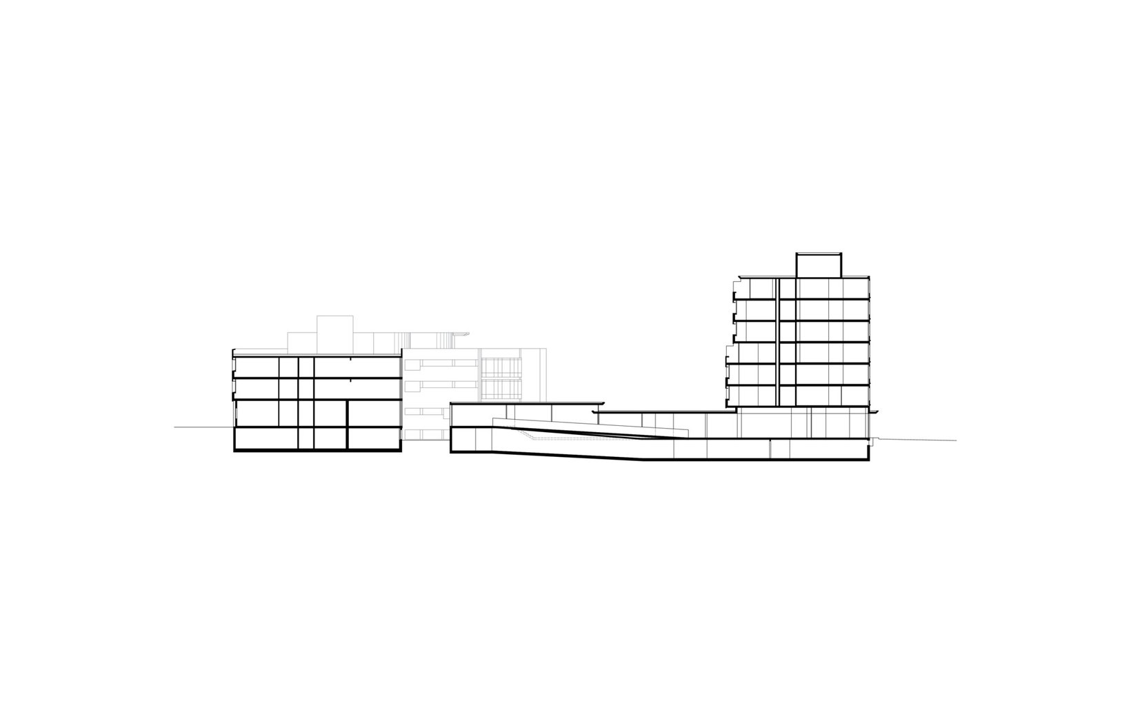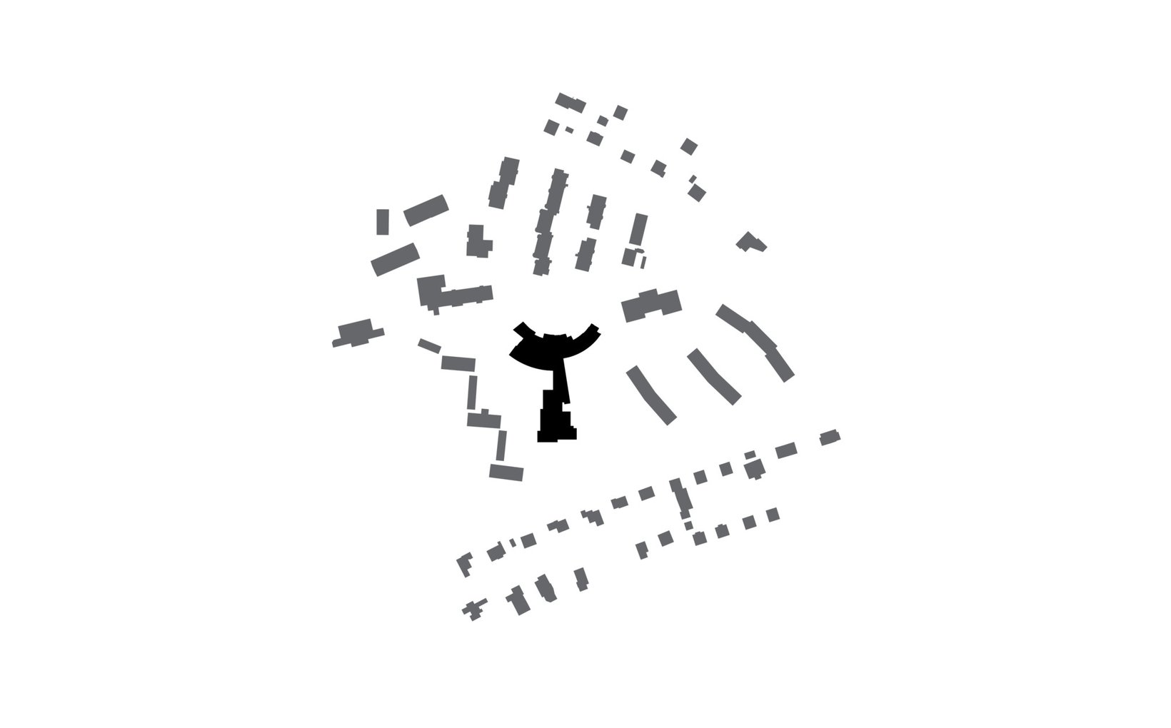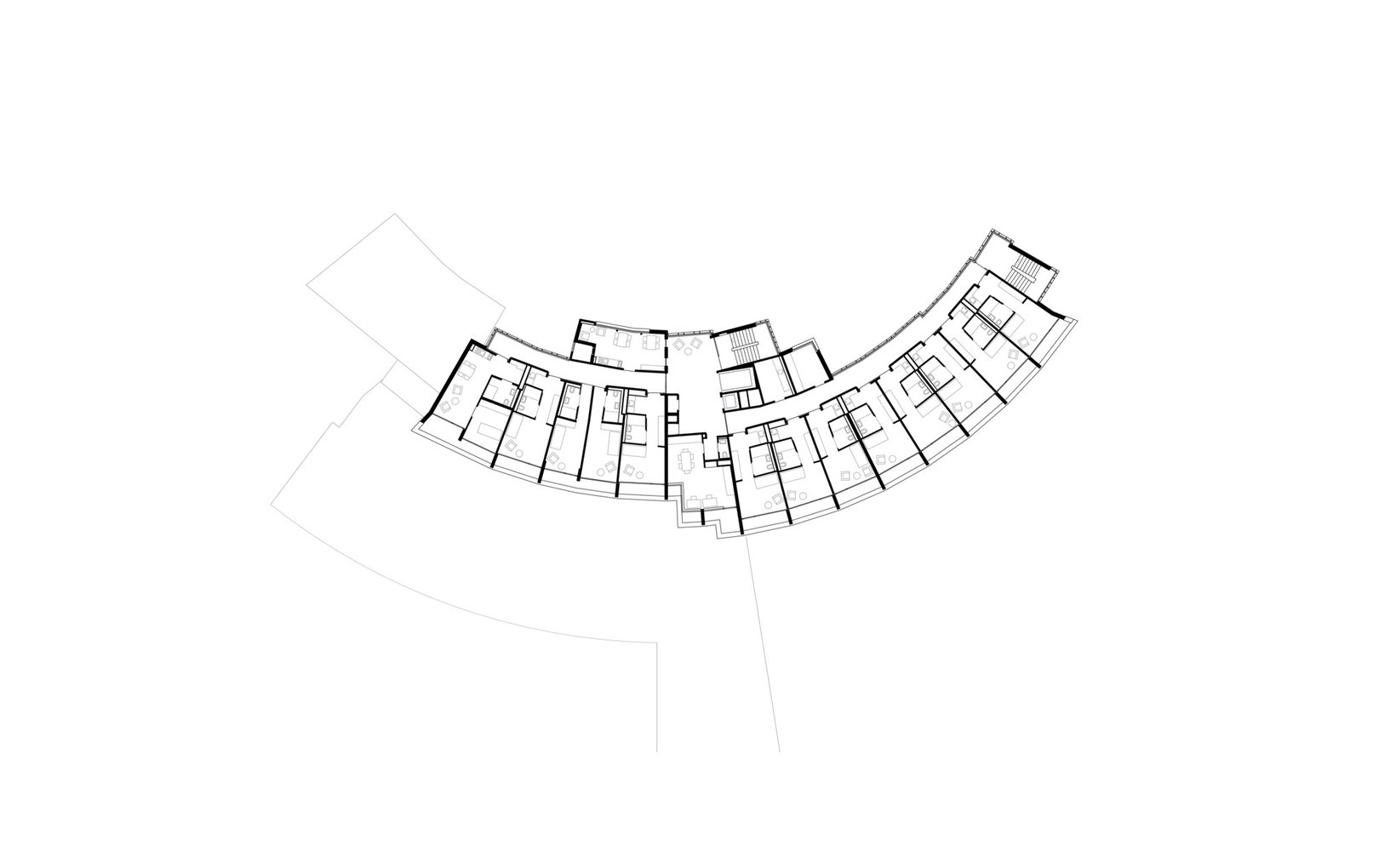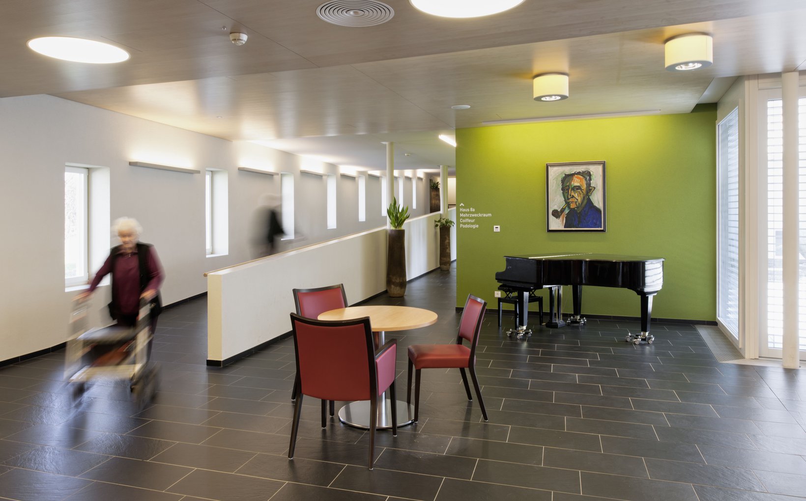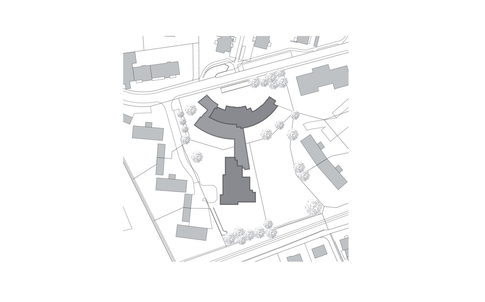 Problemstellung: Aufnahme der vorhandenen Raumstrukturen, sorgfältige Weiterführung der auf konzentrischen Raumschichten basierenden radialen Geometrie sowie Sicherstellung der räumlichen Beziehung zwischen Altersheim und Pflegeheim.
