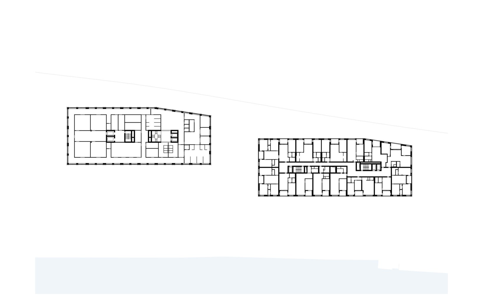 fsp: Zwischen dem Flussbett der Aare und den Gleisanlagen wurde der Neubau des Baufeld 2 geformt. Die Geometrie entlang der zukünftigen Geleise lässt das Volumen leicht schleifen. Die Auskragungen des Gebäudes führen den Besucher entlang des Boulevards. Die Frontseite des Klinikgebäudes bildet den Auftritt. Hier befindet sich der grosszügige Haupteingang für das gesamte Gebäude. Er lädt ein, das Gebäude zu betreten. Vorbei an dem Café und Restaurant, dem eigentlichen Treffpunkt des Gebäudes, und der Concierge gelangt man in alle verschiedenen Räume der Obergeschosse. Die verschiedenen Praxen und Büros, aber auch die neue Pallas Klinik.