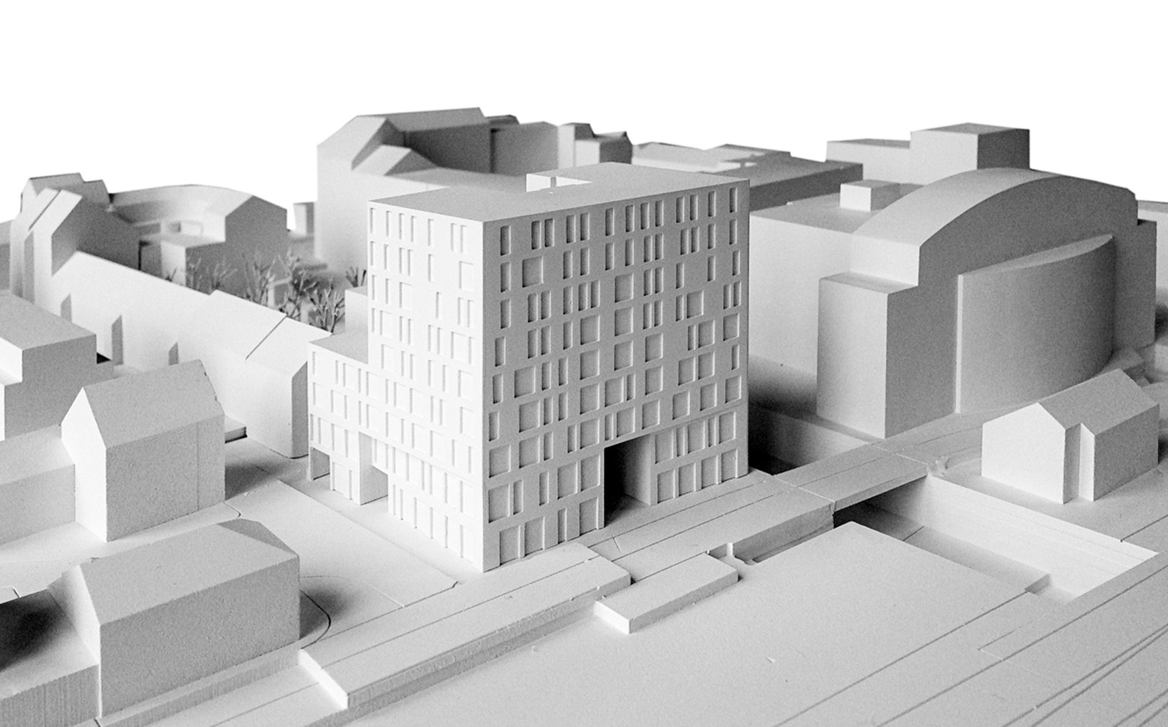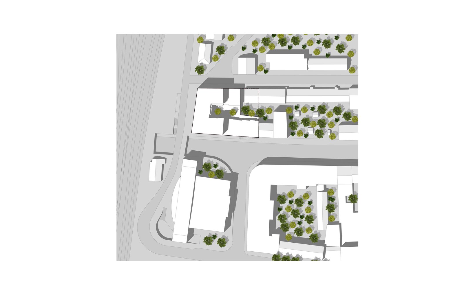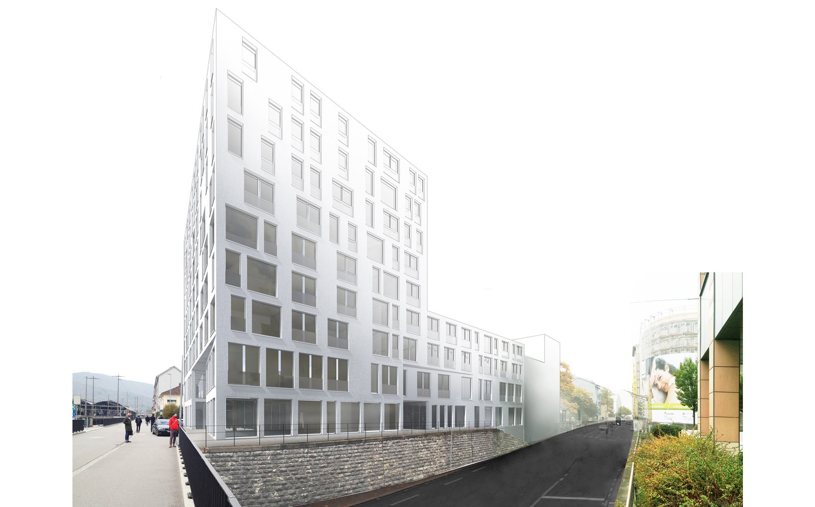 Ziel: Die vielfältigen und teils widersprüchlichen Rahmenbedingungen bilden die Basis für ein starkes und eigenständiges Konzept. Die (noch) unvollständige Hofrandbebauung zwischen Unterführungsstrasse und Rosengasse wird als „Rumpf“ betrachtet welcher in Richtung des Gleisfeldes einen prägnanten „Kopf“, ein Gesicht erhält.