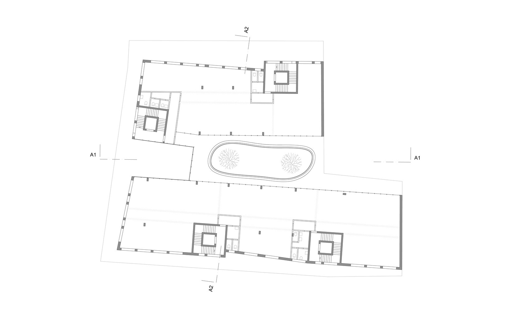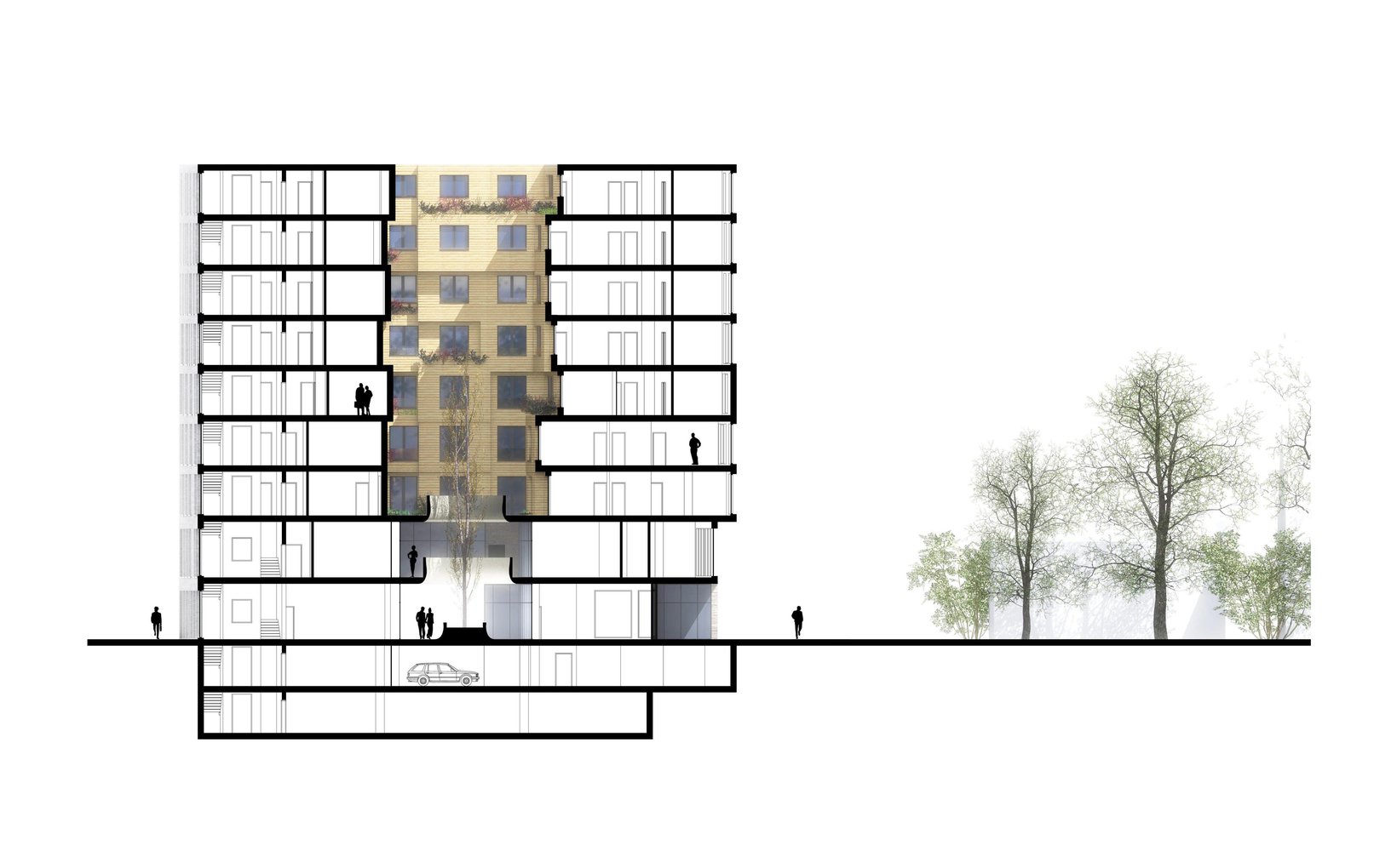 fsp: Der gedeckte Aussenraum ist mit einer Freitreppe auch an die tieferliegende Unterführungsstrasse angebunden. Das erste Obergeschoss lässt sich einerseits über die zentrale Treppe an der Hauptfront und den halböffentlichen ringförmigen Raum im ersten Obergeschoss erschliessen, anderseits funktioniert der Zugang ebenso über die internen Treppenhäuser. Ab dem zweiten Obergeschoss aufwärts sind die Wohnungen organisiert: Piano nobile.