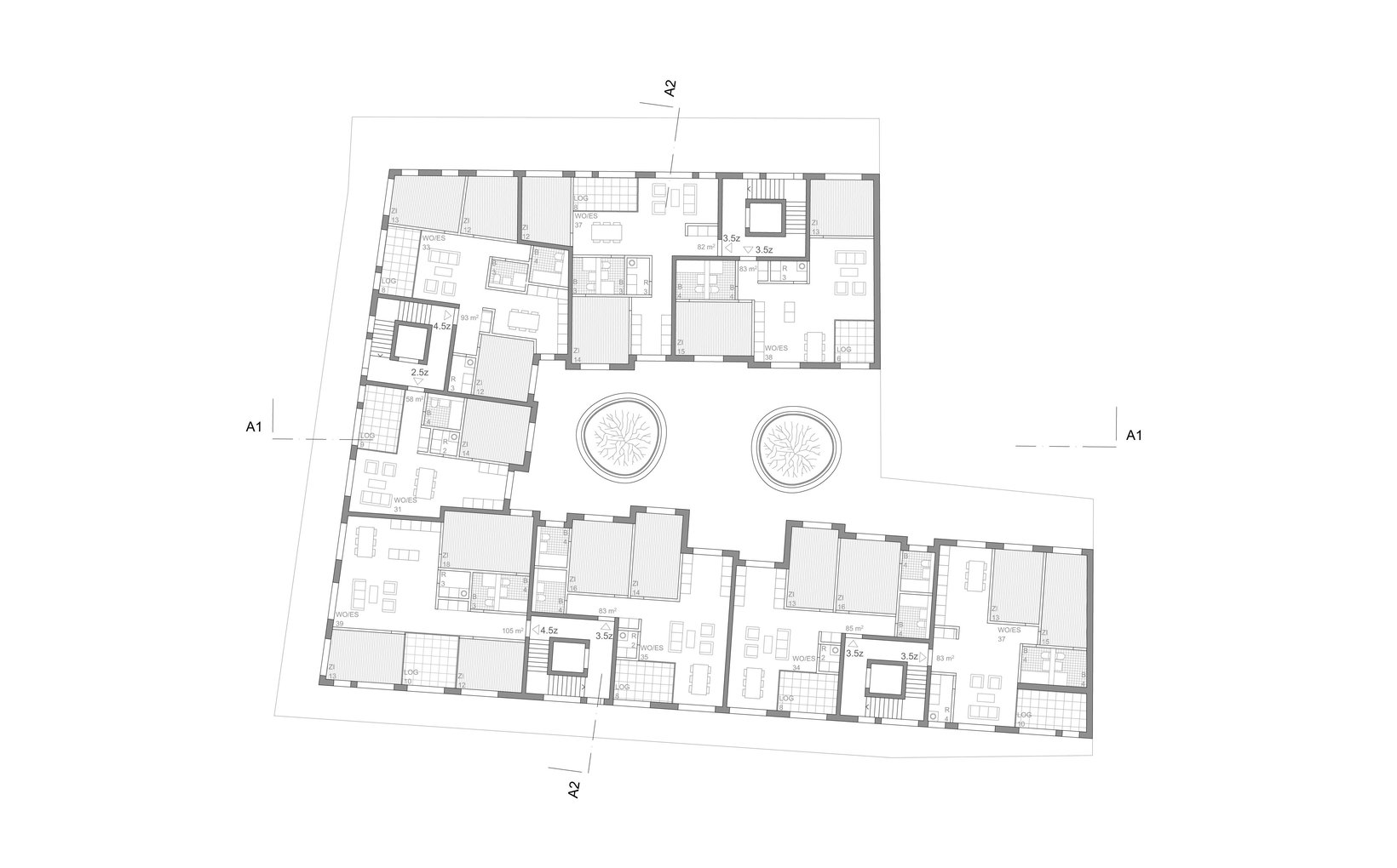 Problemstellung: Einerseits ist die Lage bezüglich Erschliessung und Ausblick hervorragend, anderseits bezüglich Lärmimmissionen kritisch, daher liegen die Schlafräume auf der lärmabgewandten Hofseite, von welcher her die Wohnräume natürlich belüftet werden können.