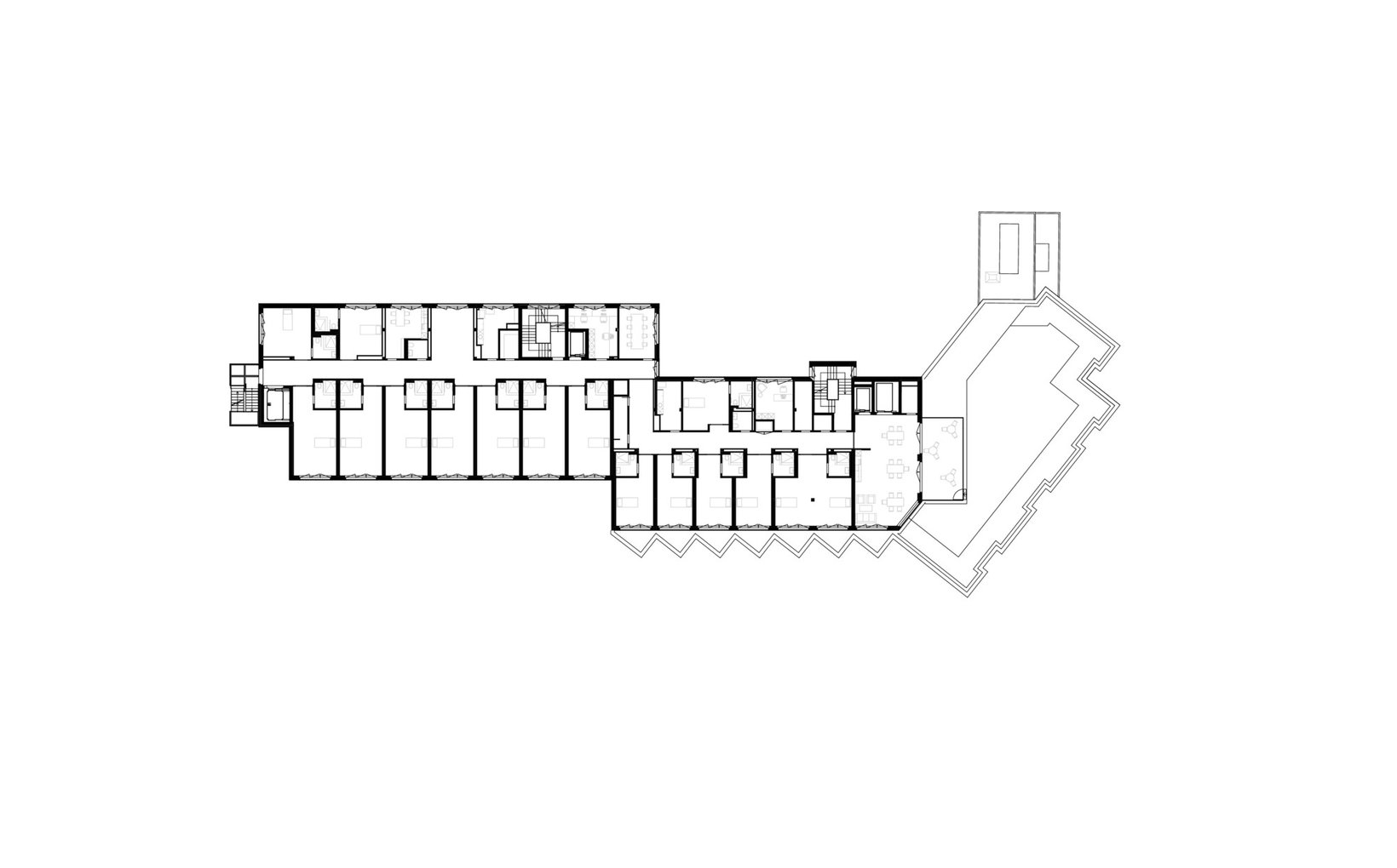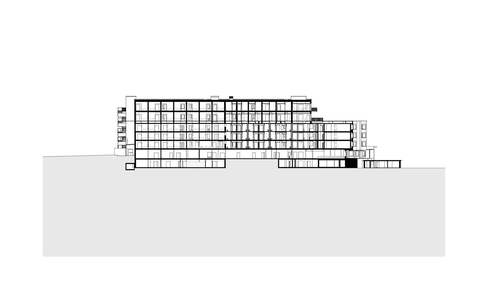 fsp: Für die neuen Pflegegeschosse wurden die Grundrisse aus den darunterliegenden Geschossen übernommen und auf die heutigen Normen angepasst. Die 32 neuen Pflegezimmer weisen auf zwei Pflegestationen grosszügige Boden- und Fensterflächen aus. Die Räume wurden für den technischen Ablauf des Personals optimiert und umstrukturiert. Die Holzbaukonstruktion ermöglich die Aufstockung über zwei Vollgeschosse trotz der alten Bausubstanz des Bestandes Baus. Über einen Hohlboden kann die Leitungsverteilung in die Aufstockung ohne grosse Eingriffe in den Bestand und dem laufenden Betrieb erfolgen. Die vertikal und horizontal gegliederte, vorvergraute Holzfassade gibt dem bestehenden Gebäude auch von aussen eine neue Leichtigkeit. Auf der Südlichen Dachfläche sind für die Bewohner und Mitarbeitenden eine grosszügige Dachterrasse vorgesehen. Der neue Schutzraum mit 60 Pflegebetten kann im Zwischenbereich zum Verpflegungstrakt an den bestehenden Schutzraum angegliedert werden und die erforderliche Bettenzahl aufnehmen.