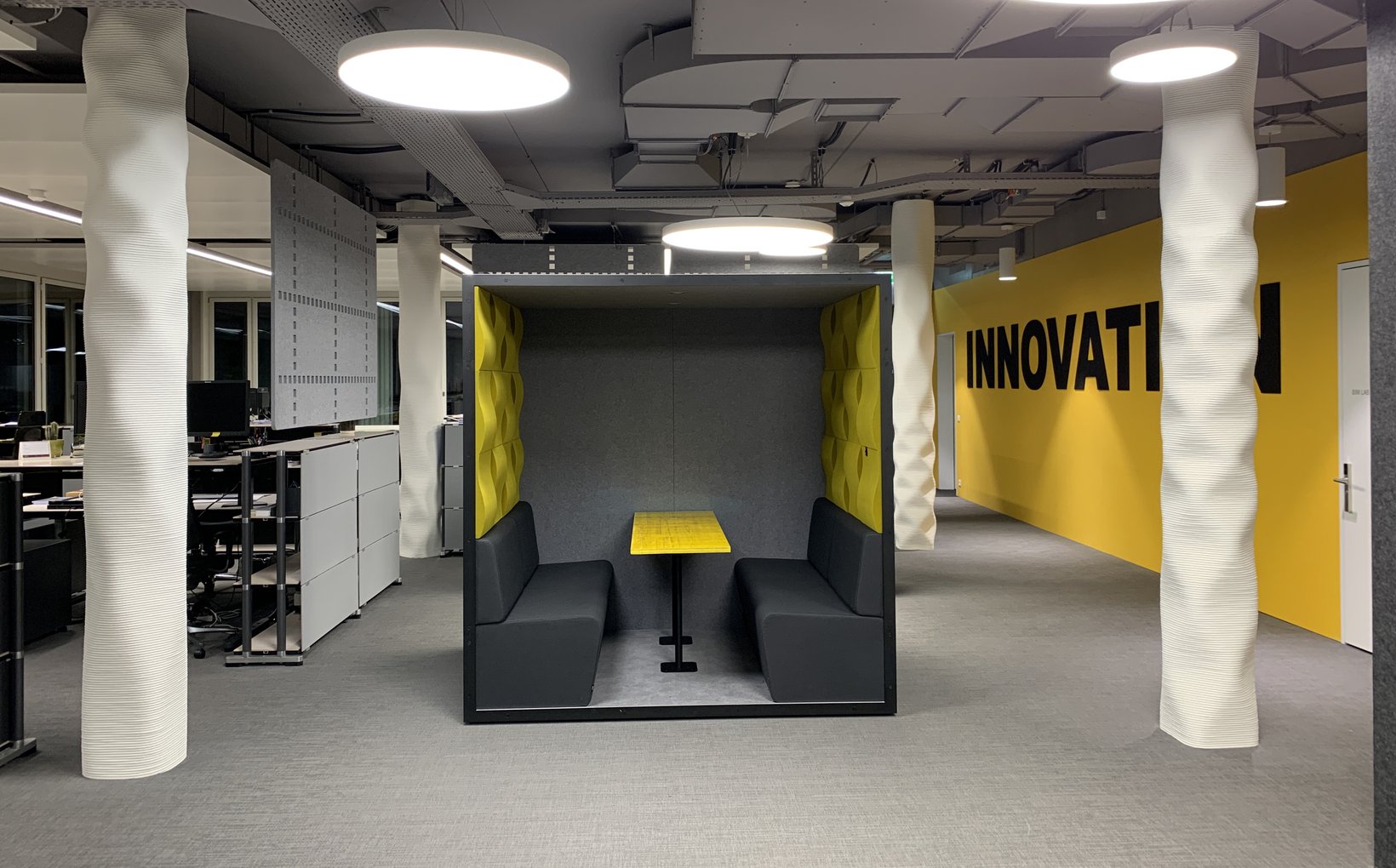 entwickelt, mit Zonen für Arbeit, Besprechungen, informellen Austausch, Rückzug