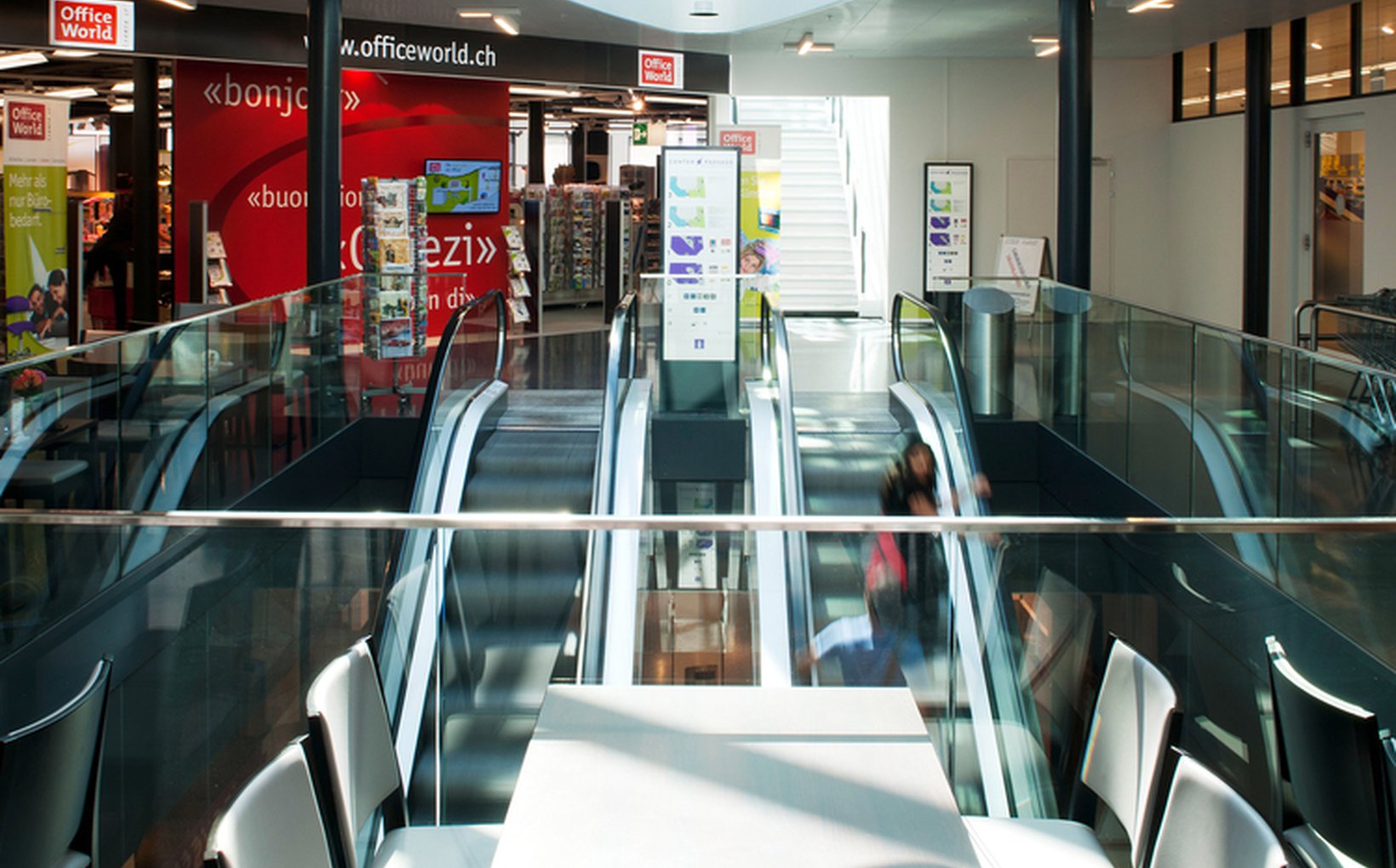 Ziel: Die überschwenglich inszenierte, symmetrische Gestik der Center Passage zielte ins Leere. Trotz ihrer Dimension gab sie dem Gebäude keinen Halt, es fand weder zur Landstrasse noch zur Zwyssigstrasse eine klare Stellung. Mit einem gezielten Eingriff wurde die Position des Gebäudes geklärt und gestärkt.