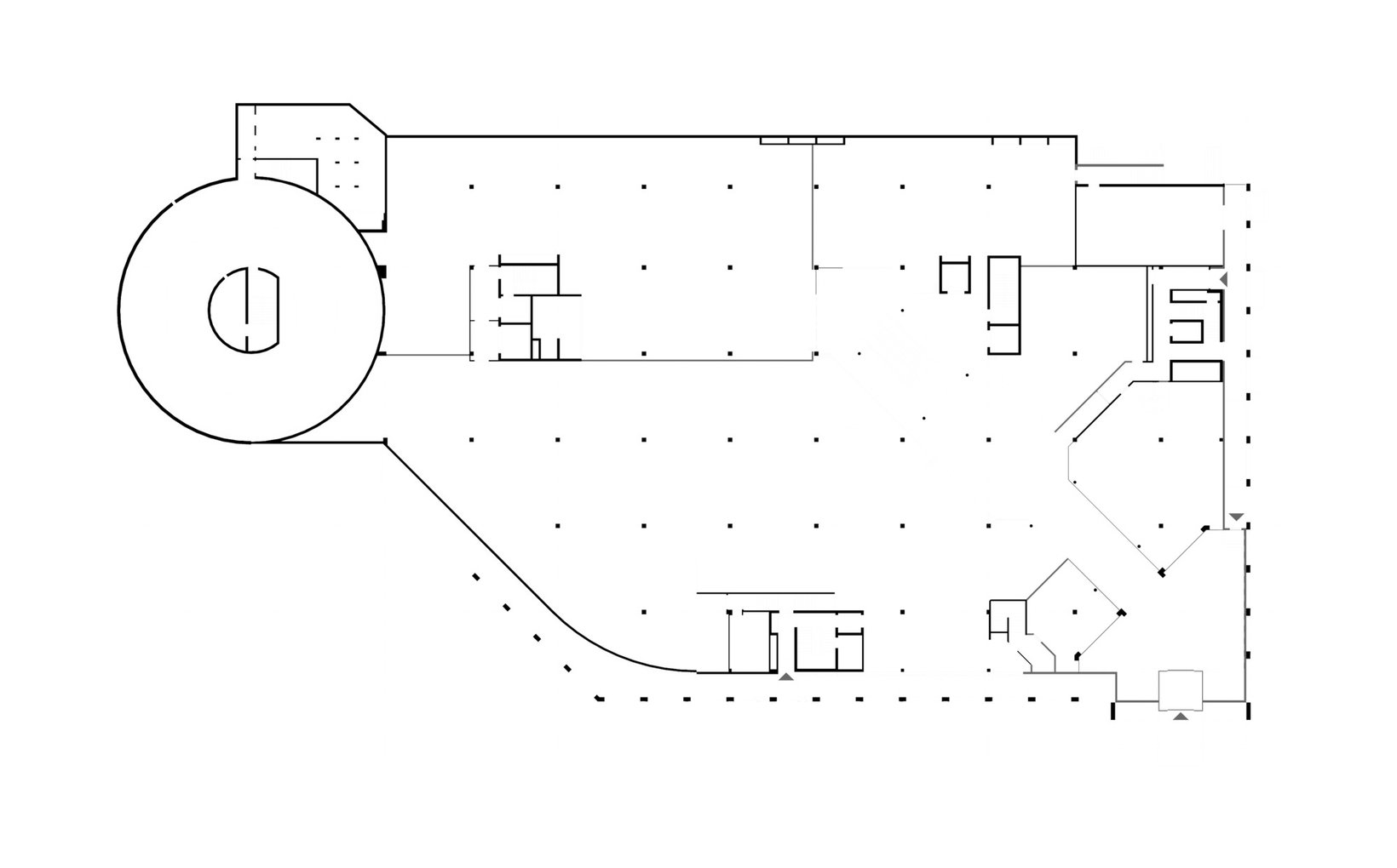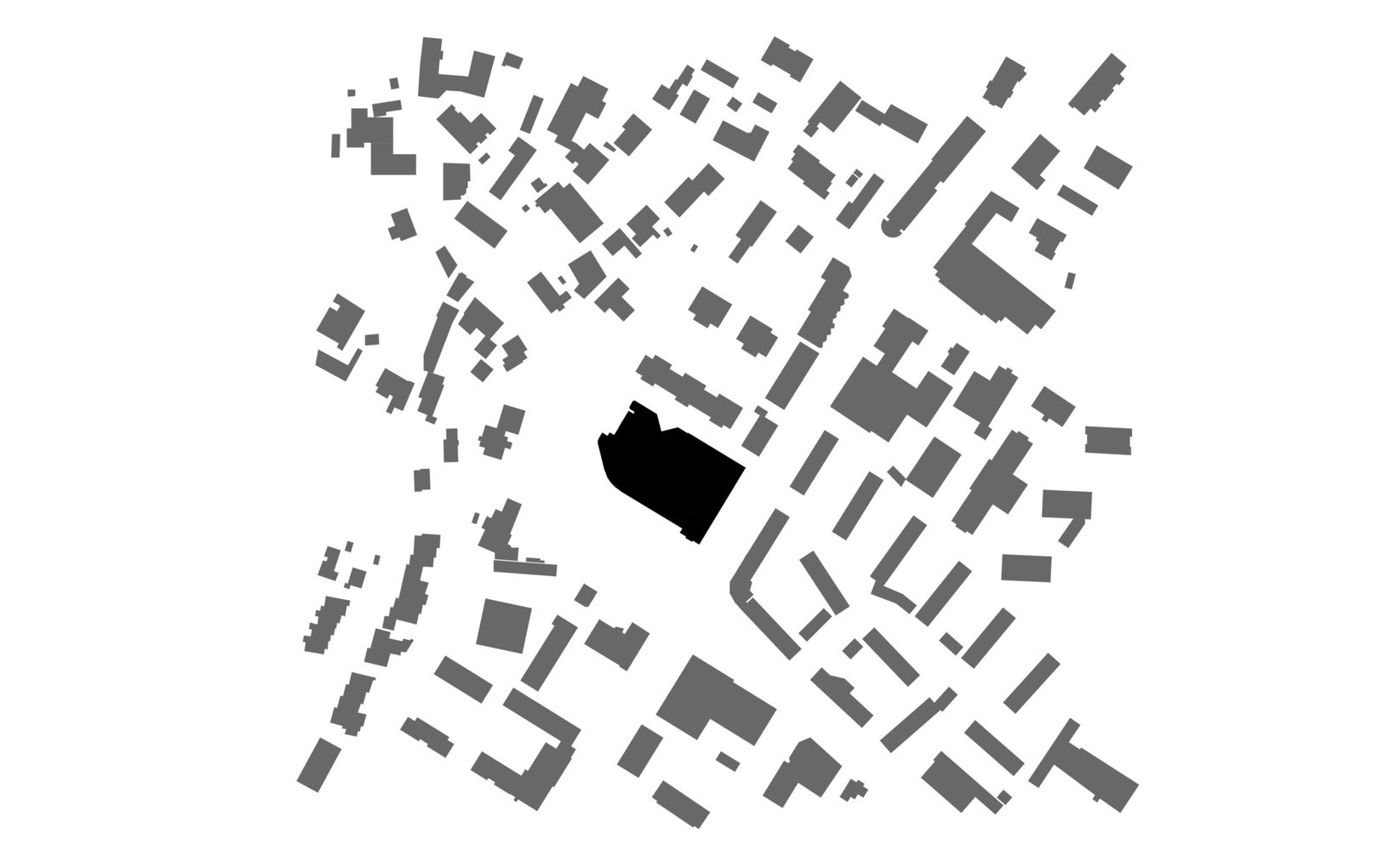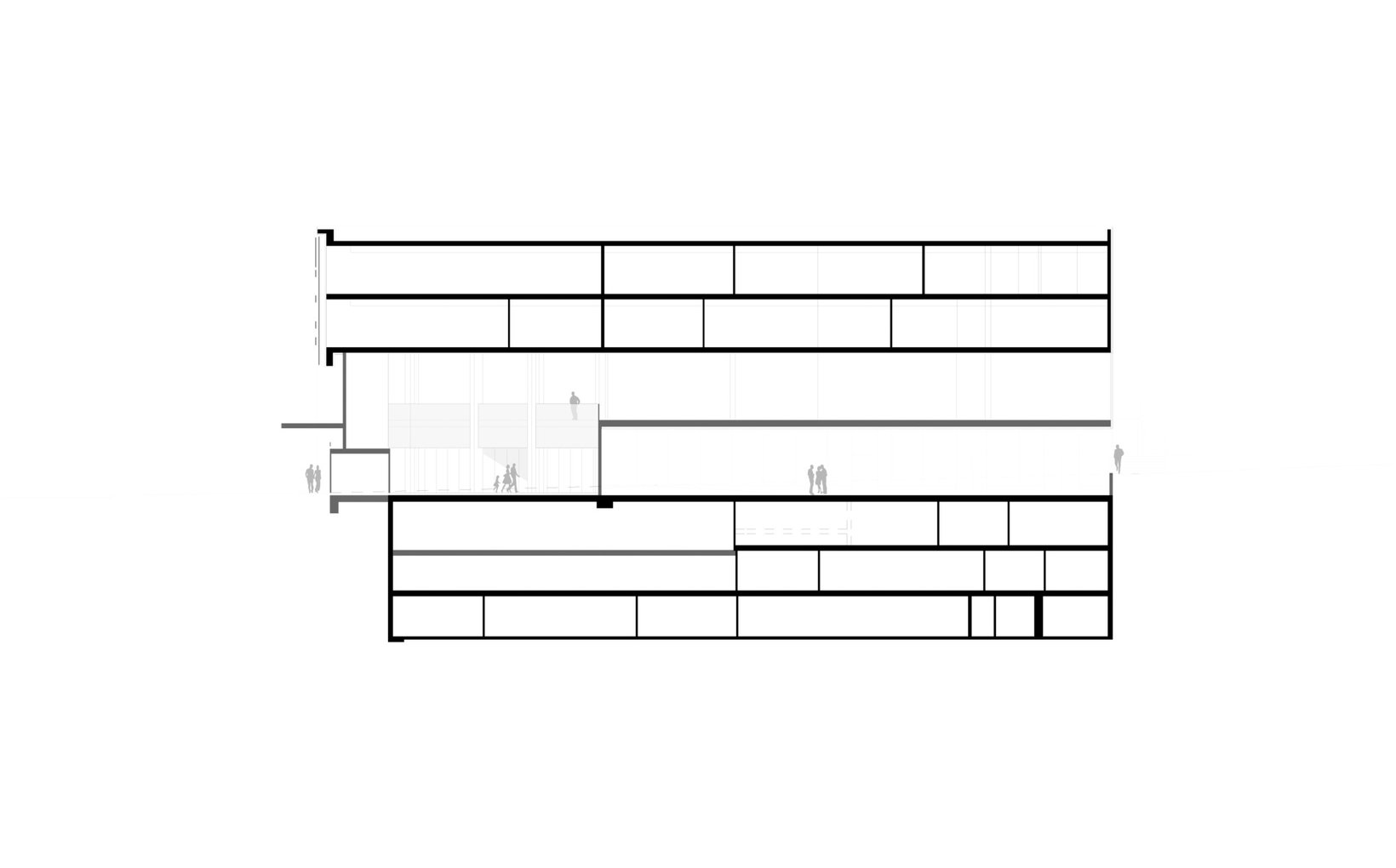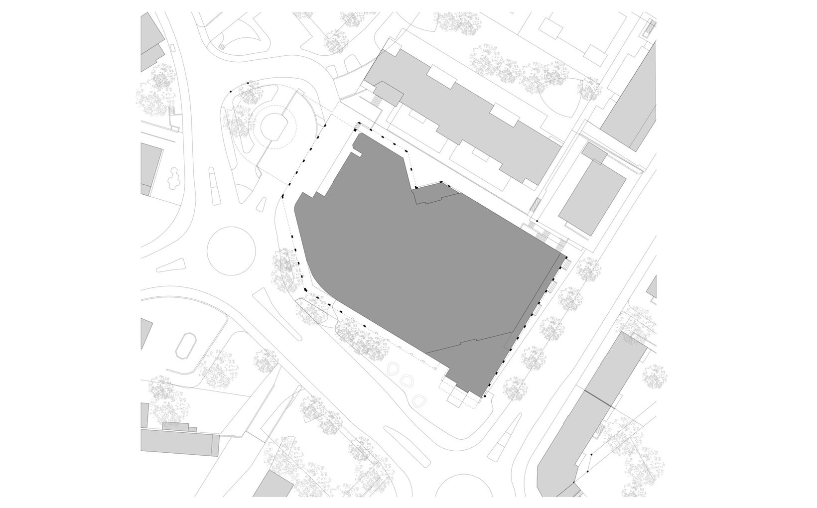 fsp: Die vertikale Struktur des Gebäudes mit den zwei verglasten Ladengeschossen, und den auf Stützen ruhenden mural ausgebildeten zwei Geschossen, wurde beibehalten. Durch die Verlängerung des Gebäudes entlang der Landstrasse wurde die oktogonale, richtungslose Grundrissorganisation aufgebrochen: Es entstanden präzise Richtungsbeziehungen. Der Bau markiert seine Präsenz nun deutlich und linear entlang der Landstrasse. Die neu entstandene Front des verlängerten Gebäudeprofils bildet das „Vis à Vis“ zum EW-Gebäude. Der nun überdachte Vorplatz funktioniert als prägender Auftakt und attraktiver Aussenbereich.
