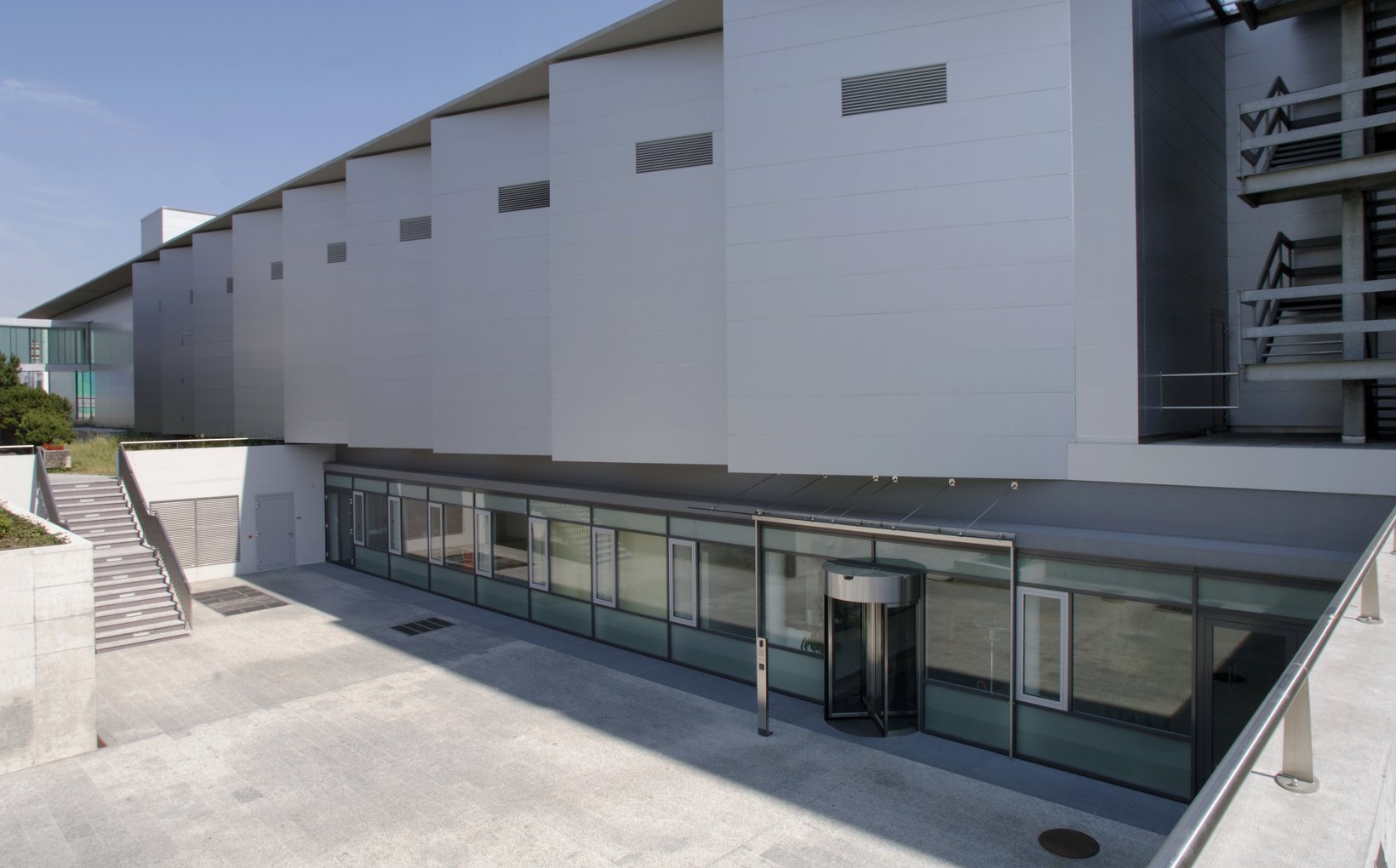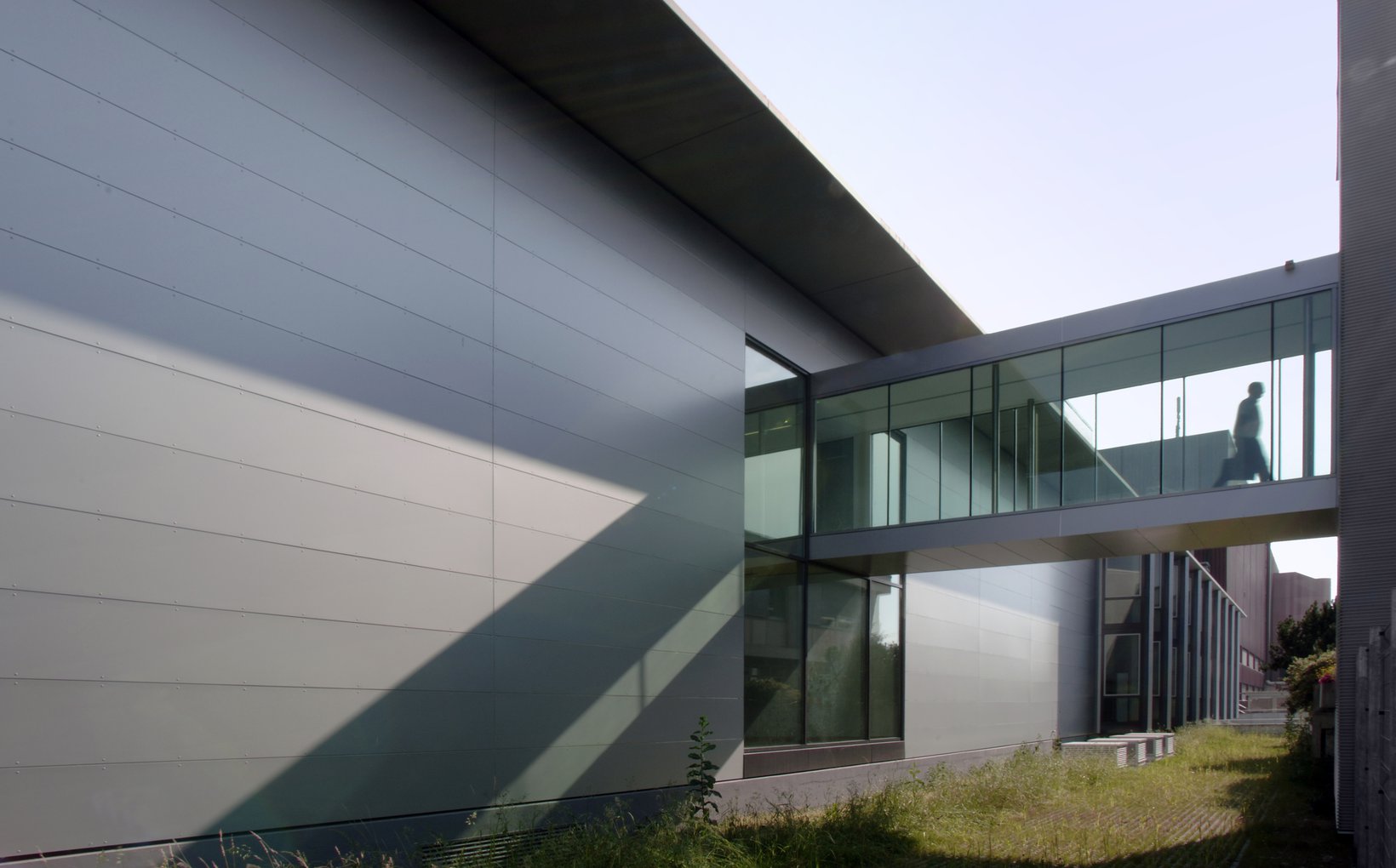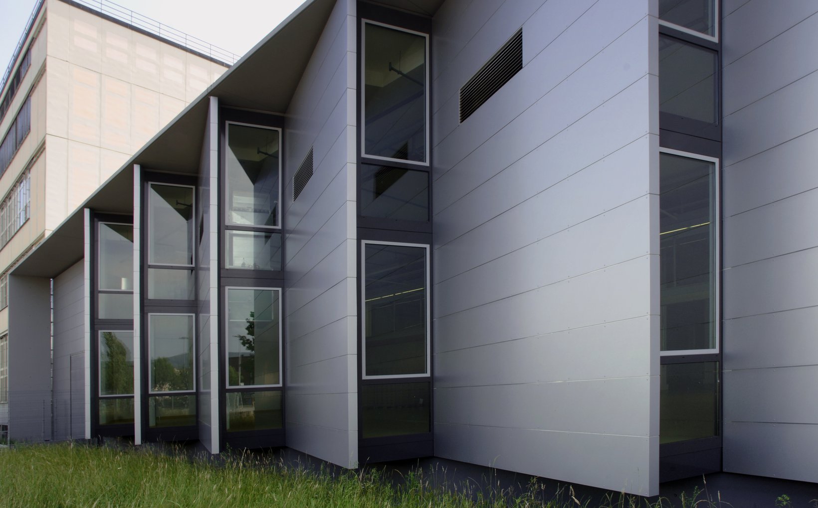 fsp: Die betont technische Gestaltung legt Wert auf präzise Detailausbildung und industriell geprägte Ästhetik. Das wesentliche Gestaltungselement bilden die vertikalen, ausgedrehten Fassadenflügel. Sie betonen die Senkrechte, die Lesbarkeit der Geschosse tritt in den Hintergrund. Der Neubauteil vermittelt seine Eigenständigkeit zwischen den anliegenden Bauten. Der Rhythmus der Elemente ergibt eine einprägsame Fernwirkung und aus der Nähe dynamische Perspektiven. Die Fassadenflügel ergeben eine optimale Belichtung, bei geringer Energieeinstrahlung. Eine grosszügige ausgebildete Terrassierung schafft interessante Bezüge zwischen Strasse und Eingang.