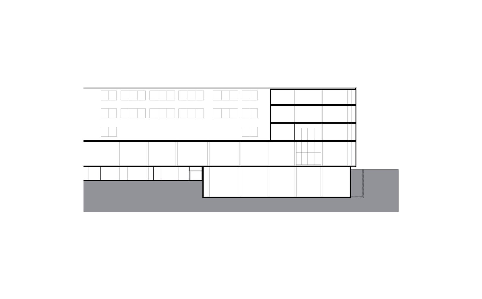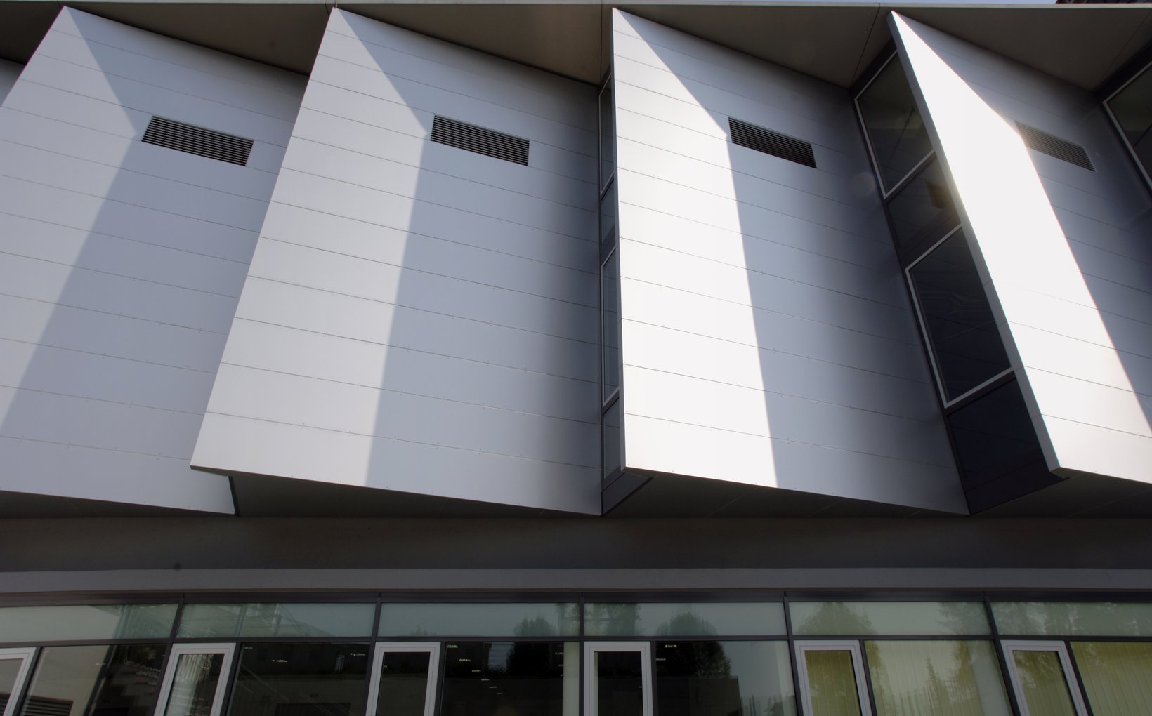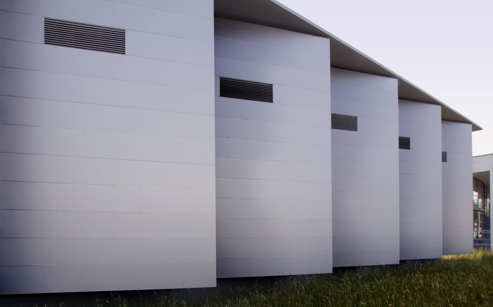 fsp: Die betont technische Gestaltung legt Wert auf präzise Detailausbildung und industriell geprägte Ästhetik. Das wesentliche Gestaltungselement bilden die vertikalen, ausgedrehten Fassadenflügel. Sie betonen die Senkrechte, die Lesbarkeit der Geschosse tritt in den Hintergrund. Der Neubauteil vermittelt seine Eigenständigkeit zwischen den anliegenden Bauten. Der Rhythmus der Elemente ergibt eine einprägsame Fernwirkung und aus der Nähe dynamische Perspektiven. Die Fassadenflügel ergeben eine optimale Belichtung, bei geringer Energieeinstrahlung. Eine grosszügige ausgebildete Terrassierung schafft interessante Bezüge zwischen Strasse und Eingang.