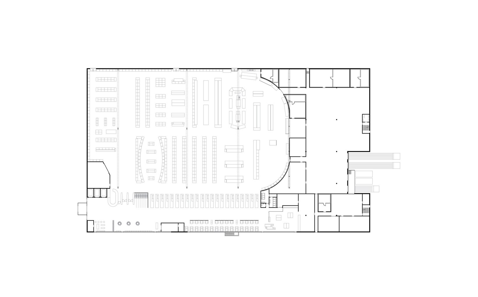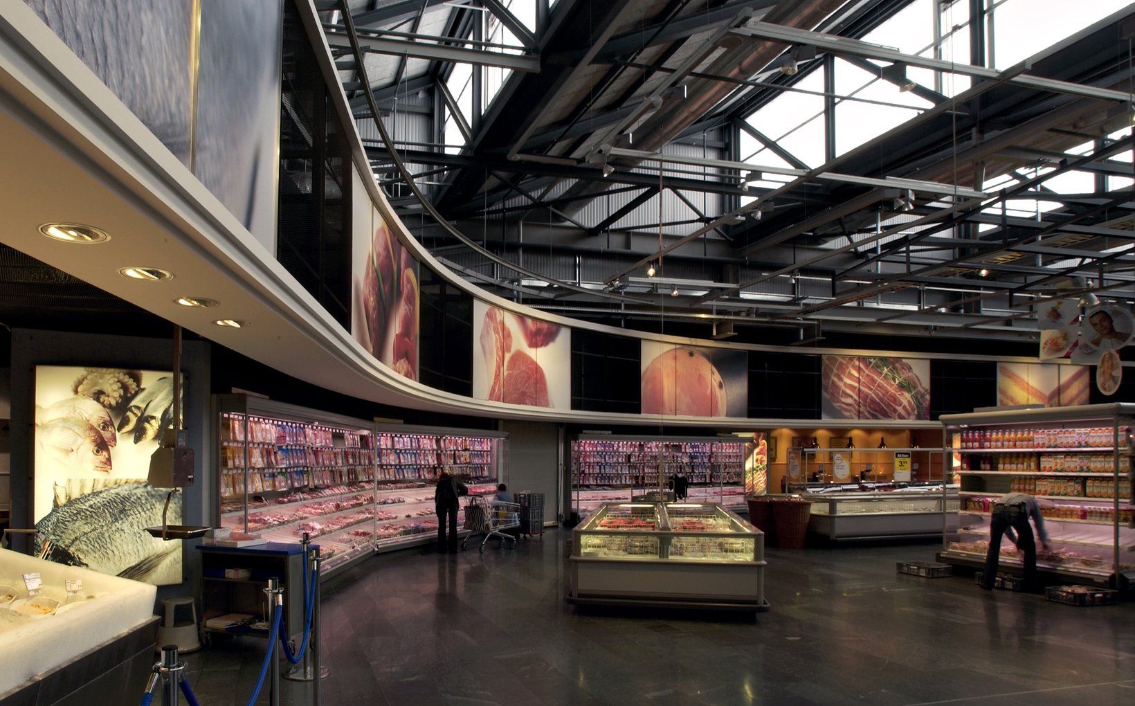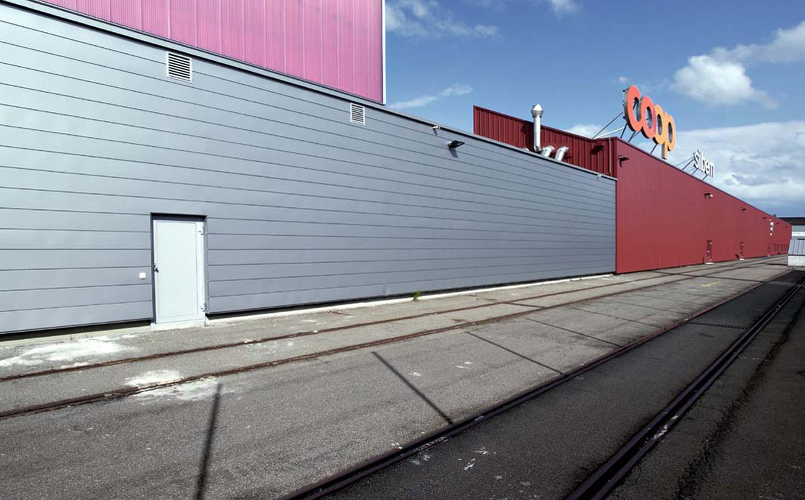 fsp: Eingangsdach, die Mall mit Restaurant, die Diensträume und die Anlieferung mit den Umschlagsräumen bilden die sichtbaren neuen Elemente. Die umgenutzte Halle dient nun dem Verkauf entsprechend dem Megastore-Konzept von Coop. Die bestehenden Oblichtbänder, erzeugen ein angenehmes Tageslicht. Bei der Umnutzung und Erweiterung der „Pestalozzi-Halle„ war es fsp ein grosses Anliegen, die bestehenden räumlichen Qualitäten und den Industriecharakter am Geleise zu erhalten, die Neubauvolumen als kubische Elemente anzufügen und dabei die Shedhalle als städtebaulichen Akzent zu erhalten. Aus bestehender Substanz wurde damit ein signifikanter Mehrwert geschaffen.