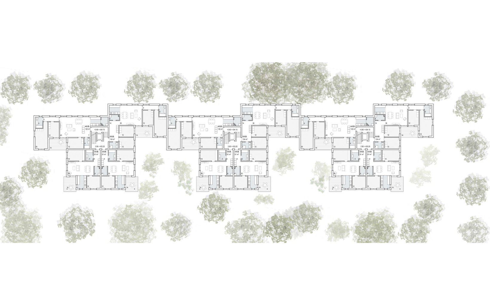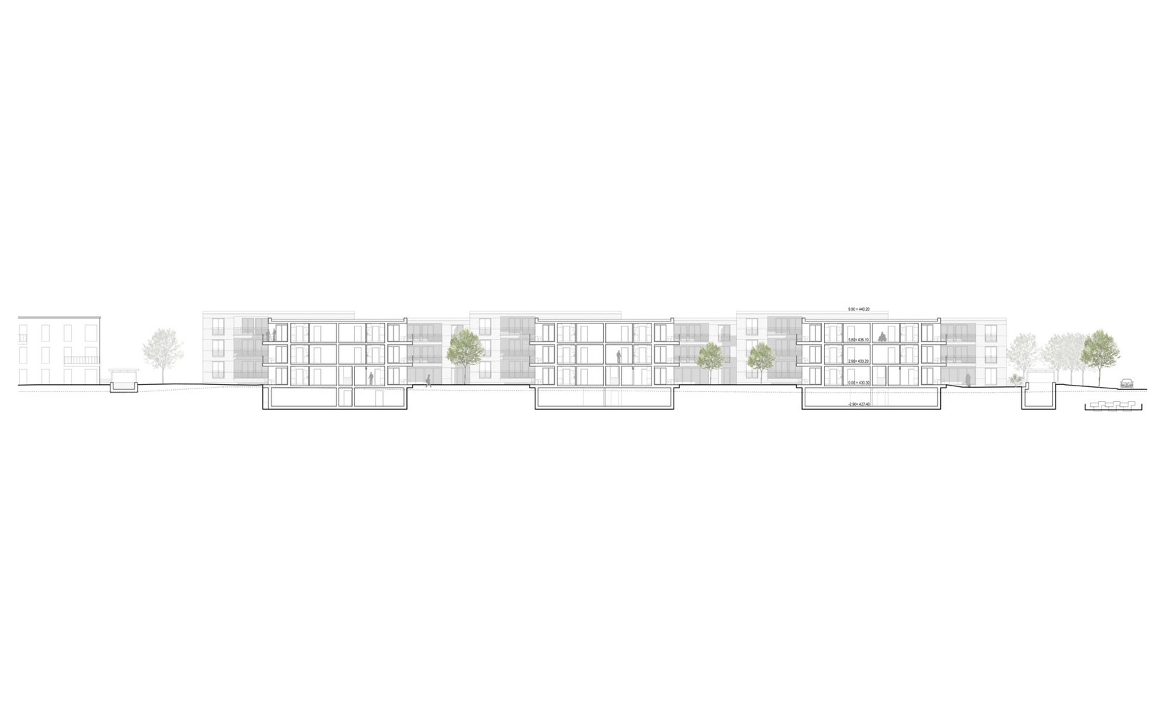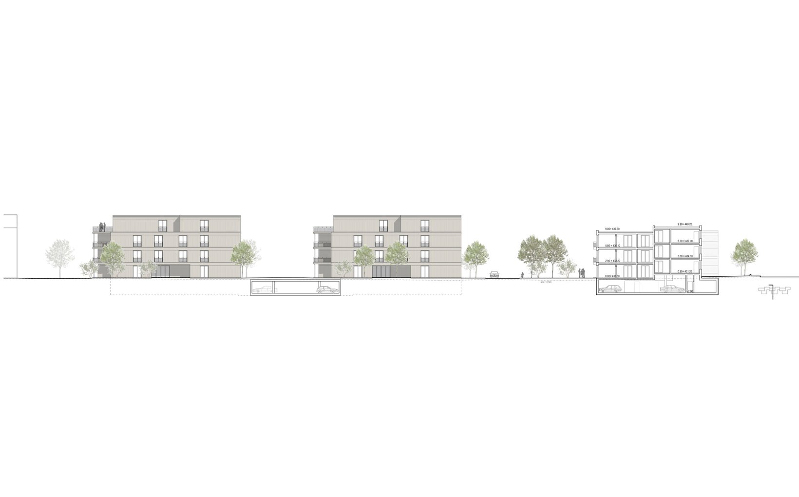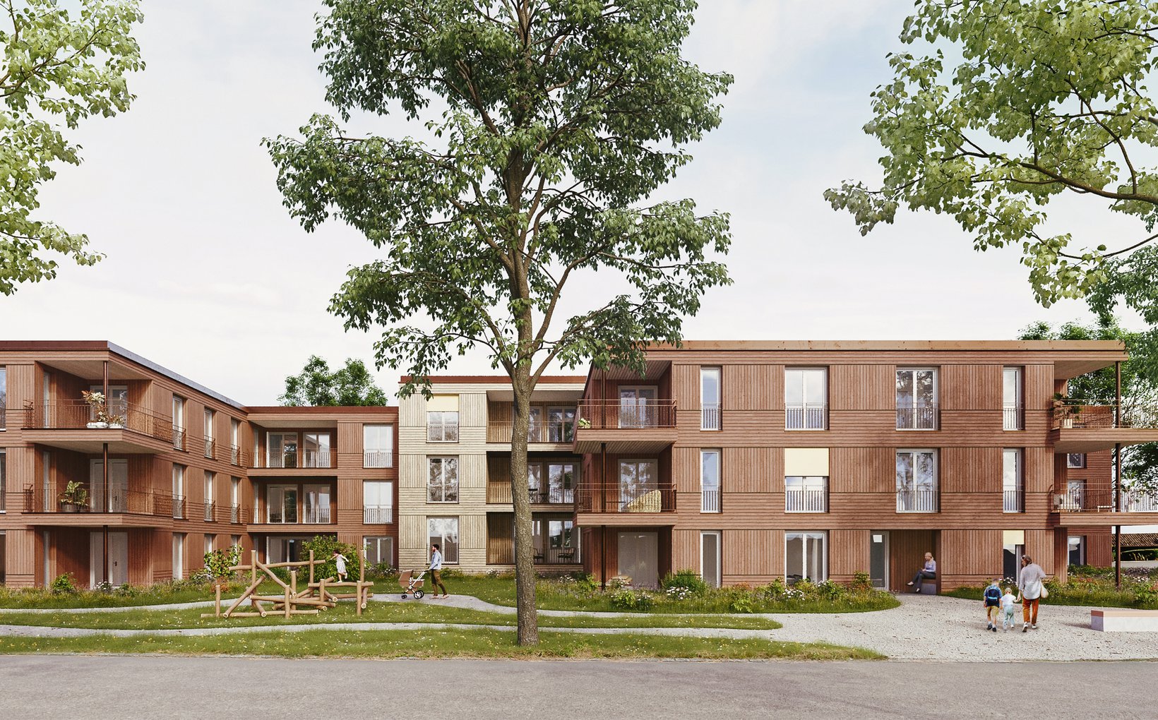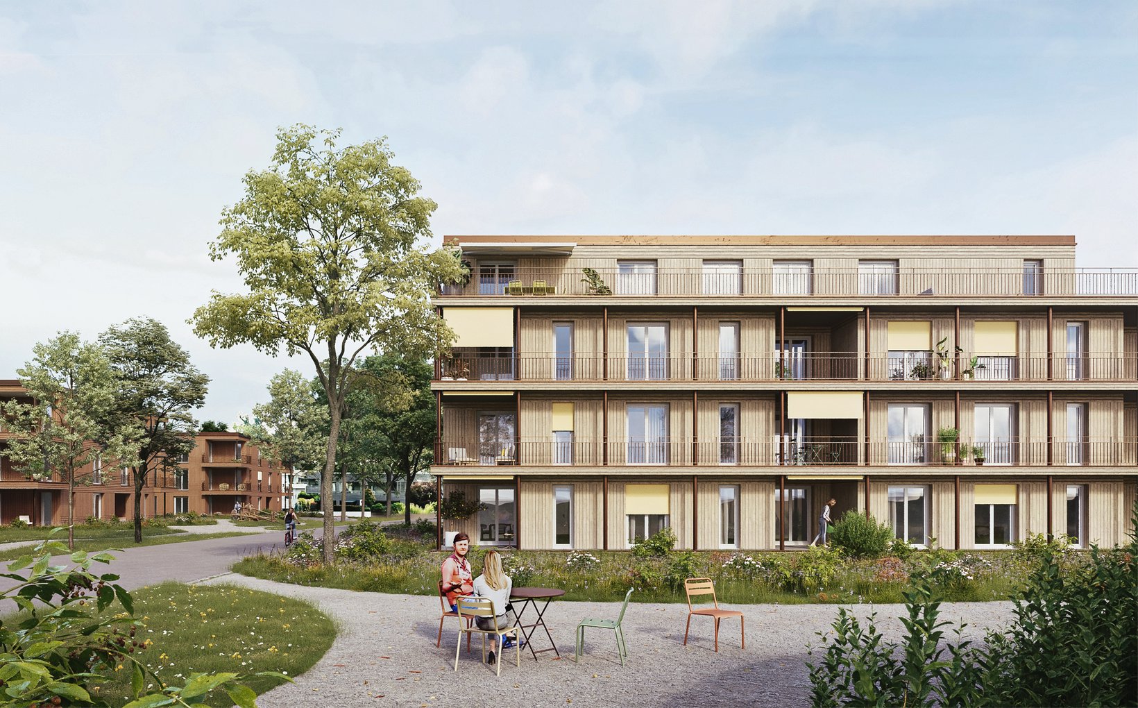Architektonisches Konzept: In Baufeld A sind die Gebäude als 4-Spänner um ein zentrales, im Split-Level organisiertes Treppenhaus angeordnet, das Lärmschutz durch erhöhte Wohnungsanordnung bietet. Die Wohnungen sind von der Lärmquelle abgewandt und haben Loggien als private Aussenräume. Die Fassadengestaltung mit einheitlicher Holzverkleidung und farblicher Differenzierung unterstreicht die Volumengliederung und schafft eine visuelle Verbindung zu Baufeld B. Dort sind die Gebäude ähnlich konzipiert, mit Balkonen als Sonnenschutz und privaten Aussenräumen durch Fassadenrücksprünge. Bodentiefe Fenster und differenzierte Holzlattungen prägen das Erscheinungsbild und fördern die Integration in das Umfeld.