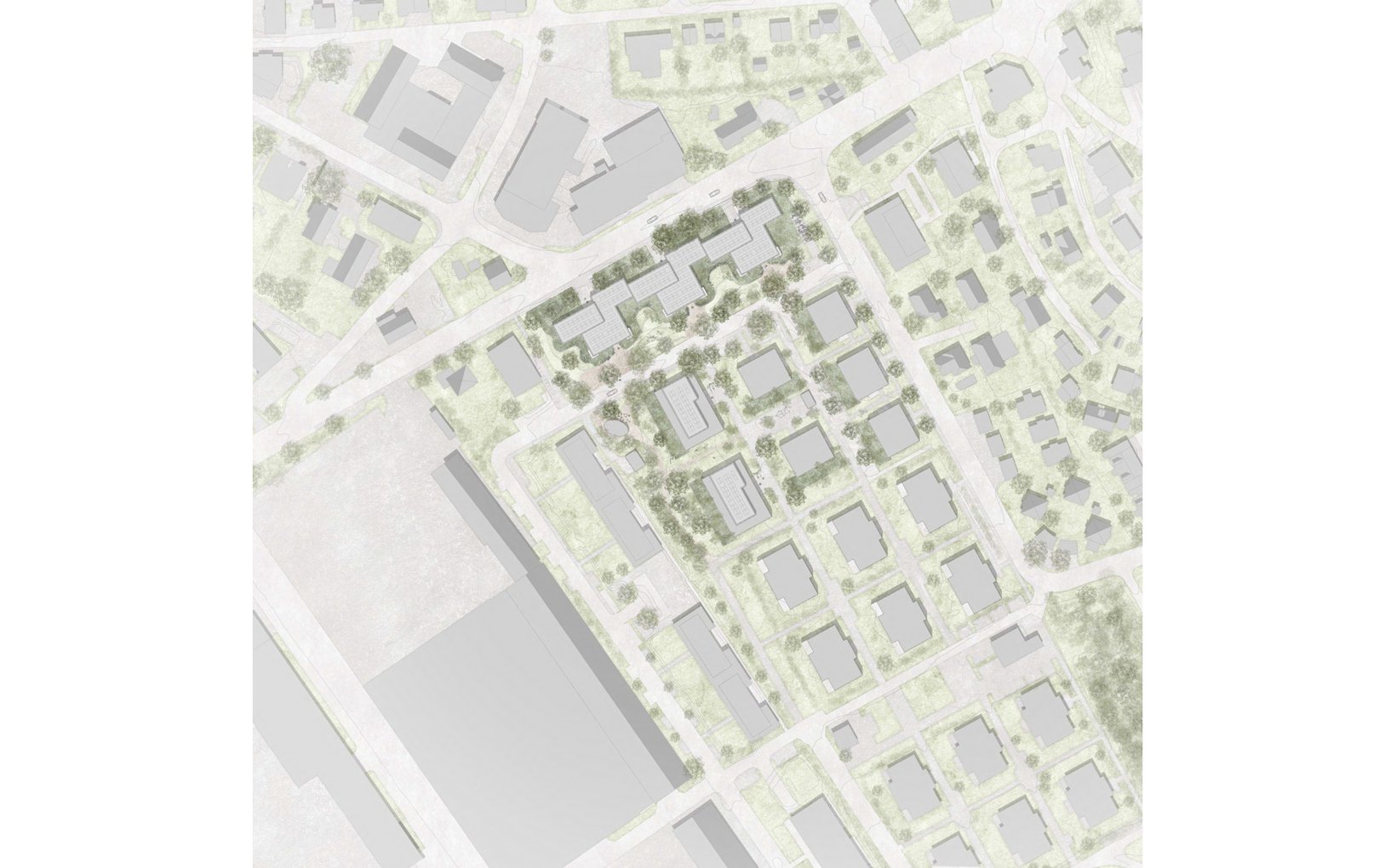 Städtebauliches Konzept: Das städtebauliche Konzept für das Eichmatt-Areal in Villmergen basiert auf einem orthogonalen Raster gleichförmiger, kubischer Bauvolumen. Besonders wichtig ist das Baufeld A, das als Lärmschutz dient und eine Verbindung zum Ortszentrum schafft. Ein "städtebaulicher Riegel" entlang der Wohlerstrasse wird in drei Teile gegliedert, um die Bebauung an das benachbarte Quartier anzupassen. Diese Massnahme verbessert die Wohnqualität und erhält die Freiräume. Historische Vorgartenstrukturen werden integriert, um Privatheit zu erhöhen, und ein Gemeinschaftspavillon bildet den neuen Quartiersmittelpunkt.