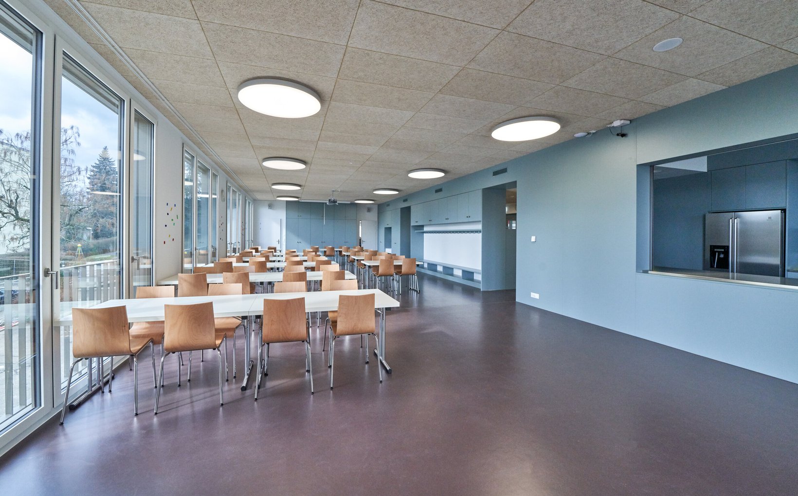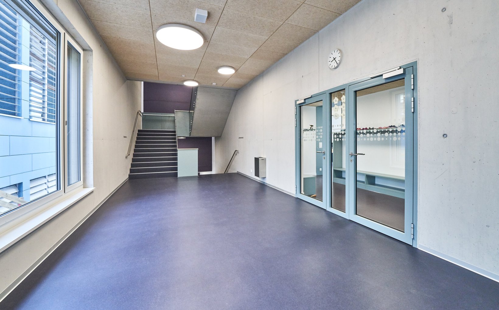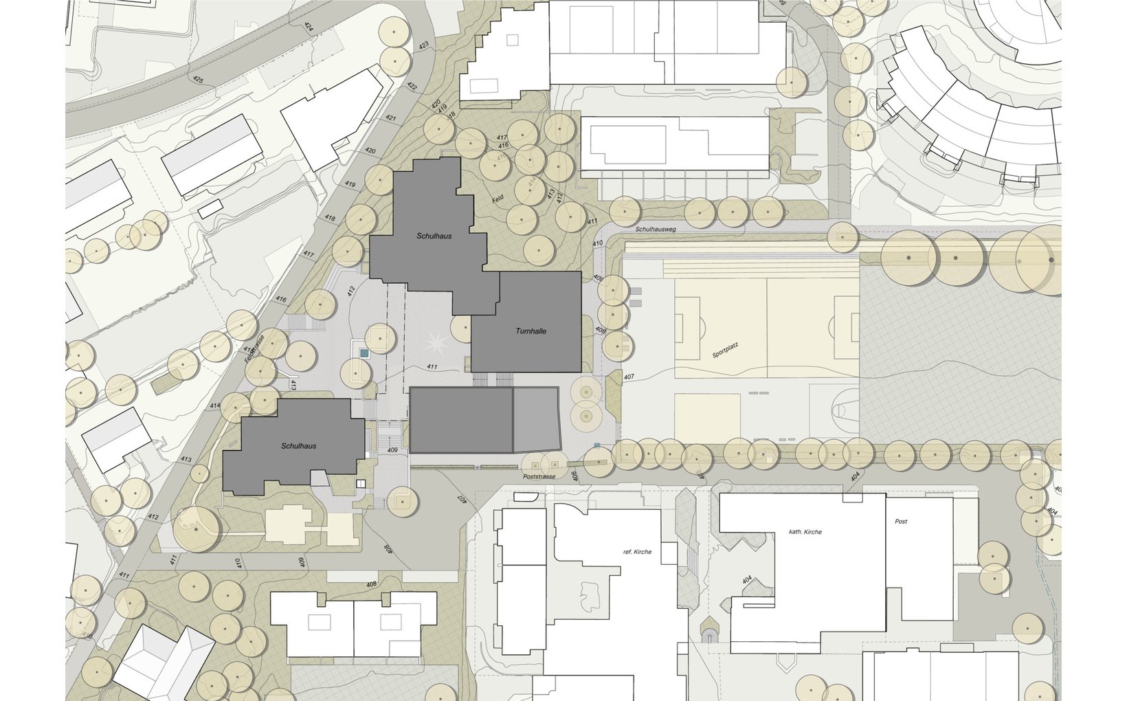 fsp: Der Neubau ist als einfaches, klar zoniertes Gebäudevolumen gestaltet. Das Gebäude versteht sich dabei als Bindeglied zwischen den verschiedenen Höhenniveaus des Areals. Der Mehrzwecksaal ist im Sockelgeschoss verortet und öffnet sich mit einem eigenen Eingang zum Ortszentrum hin wohingegen der Mittagstisch mit der Terrasse auf dem Erdgeschossniveau der Schulanlage liegt. Die Hauptadressbildung und Anbindung desNeubaus an das bestehende Erschliessungssystem der Schule erfolgt damit im Erdgeschoss an der Stelle des alten Eingangsbereichs. Das räumliche Konzept des Neubaus ist vom Motiv der Bewegung im Raum geprägt. Dabei wird die Treppenanlage zum zentralen Bindeglied, welches die verschiedenen Eingänge und Plätze innerhalb des Volumens miteinander in Beziehung setzt und verknüpft.