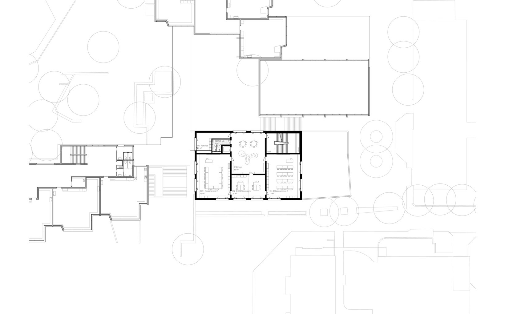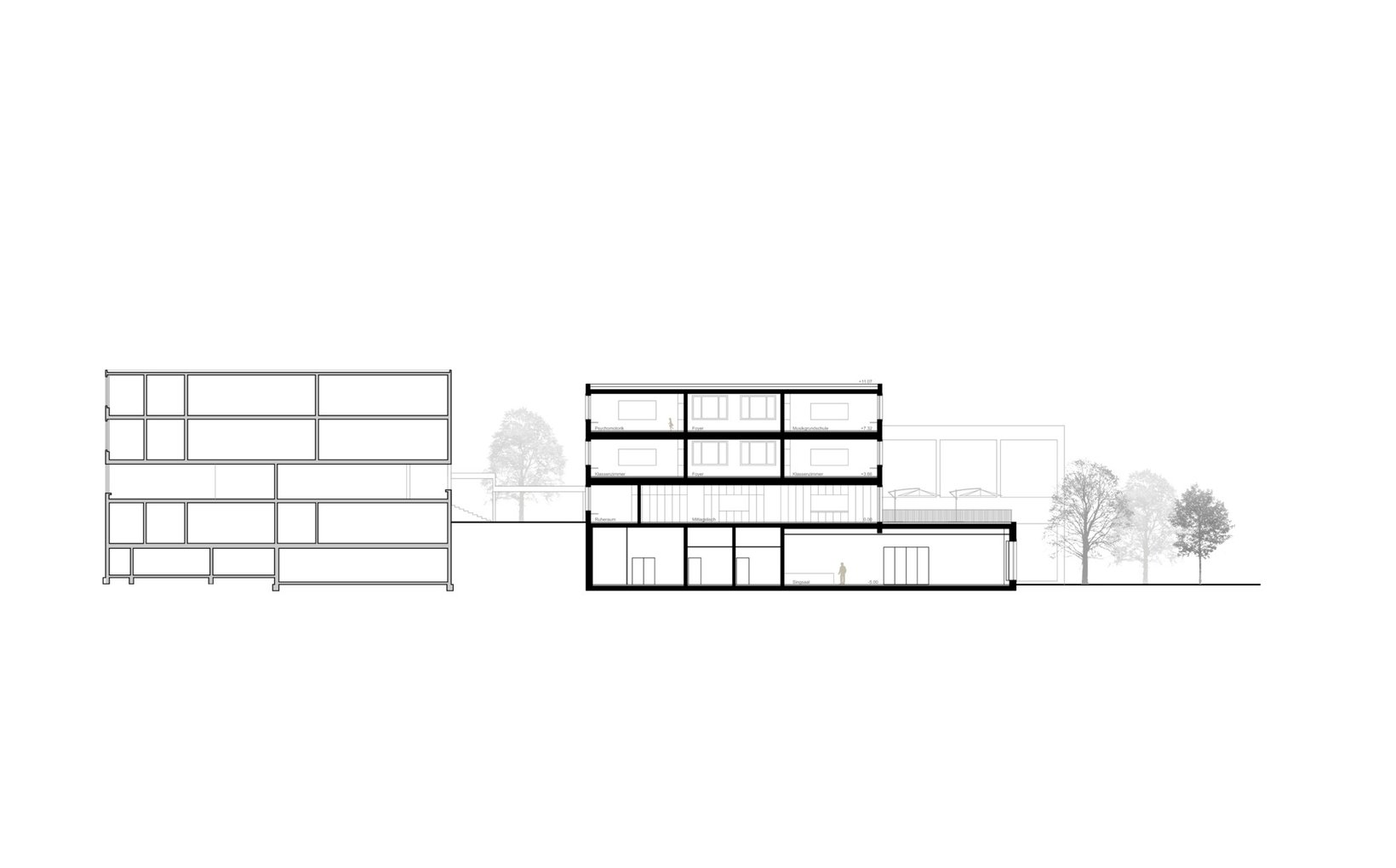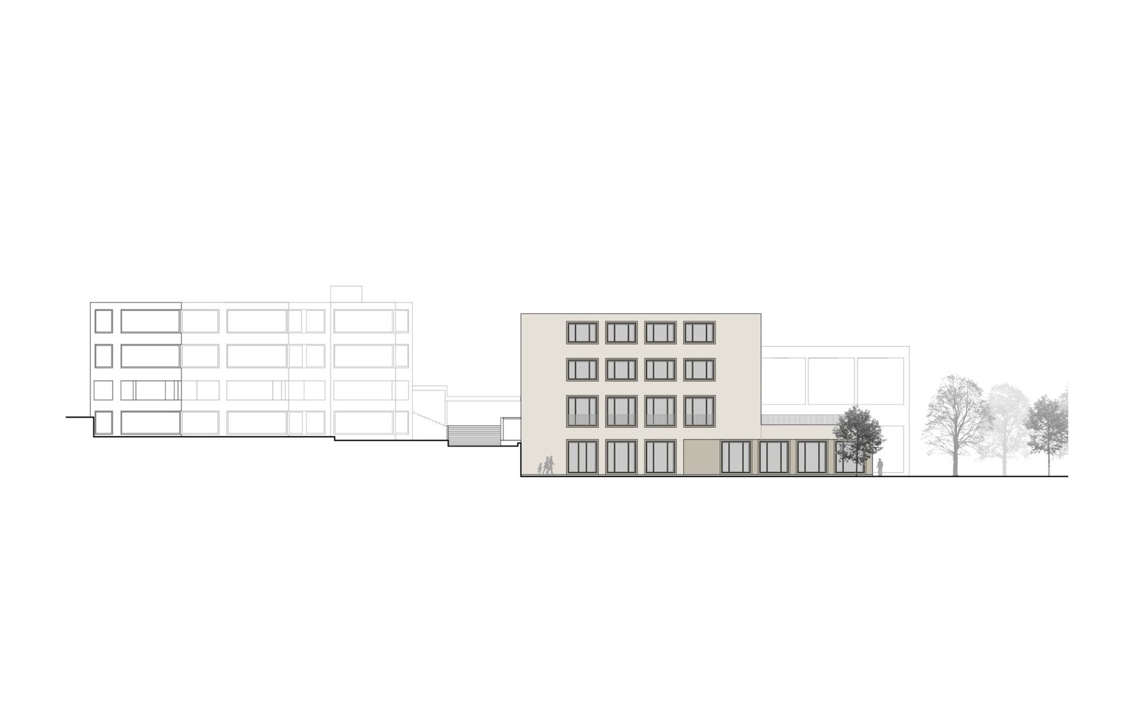 fsp: Der Neubau ist als einfaches, klar zoniertes Gebäudevolumen gestaltet. Das Gebäude versteht sich dabei als Bindeglied zwischen den verschiedenen Höhenniveaus des Areals. Der Mehrzwecksaal ist im Sockelgeschoss verortet und öffnet sich mit einem eigenen Eingang zum Ortszentrum hin wohingegen der Mittagstisch mit der Terrasse auf dem Erdgeschossniveau der Schulanlage liegt. Die Hauptadressbildung und Anbindung desNeubaus an das bestehende Erschliessungssystem der Schule erfolgt damit im Erdgeschoss an der Stelle des alten Eingangsbereichs. Das räumliche Konzept des Neubaus ist vom Motiv der Bewegung im Raum geprägt. Dabei wird die Treppenanlage zum zentralen Bindeglied, welches die verschiedenen Eingänge und Plätze innerhalb des Volumens miteinander in Beziehung setzt und verknüpft.