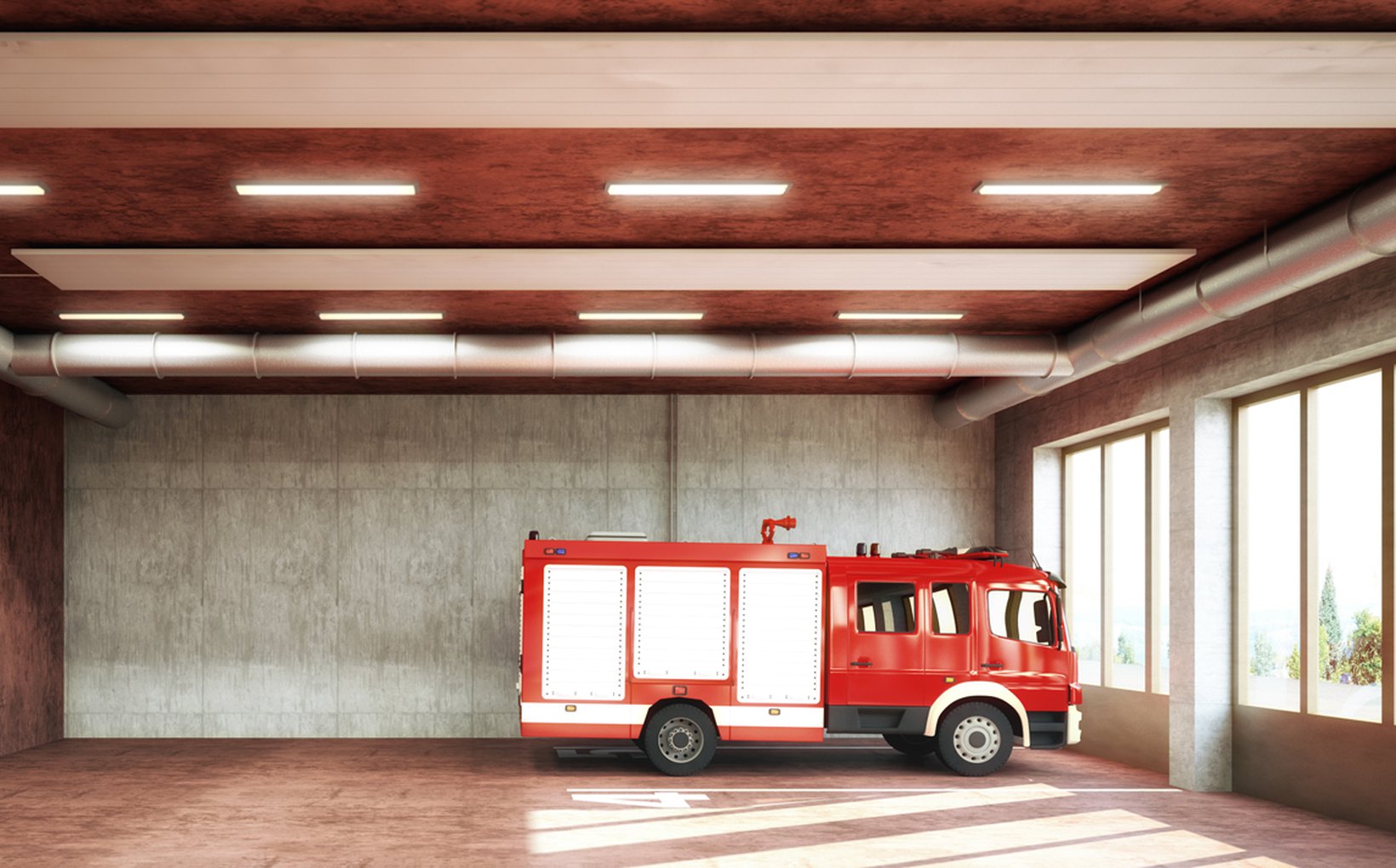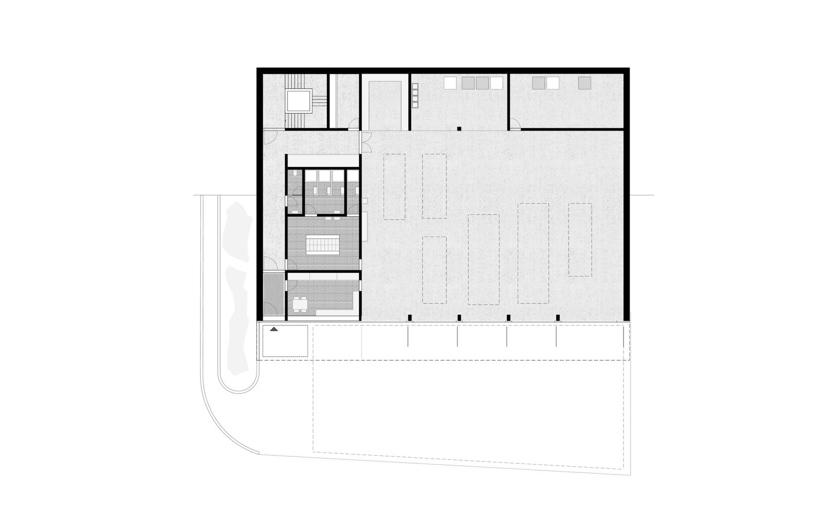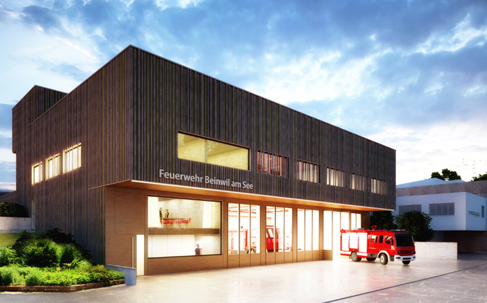 fsp: Entsprechend den funktionalen Anforderungen von Feuerwehr und Bauamt sind die jeweiligen Vorplätze als asphaltierte, befahrbare Vorplätze ausgeführt. Im Niveau EG der Feuerwehr grenzt dieser Vorplatz direkt an die Industriestrasse an. Im Gegensatz dazu steht der grosszügige Vorplatz und Aussenraum des Bauamts, welcher eingezäunt ist. Hier ist der Bereich von der Zufahrt bis zu Halle ebenfalls asphaltiert.