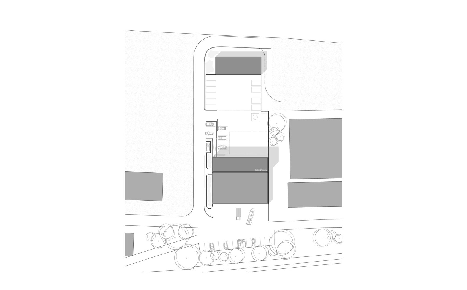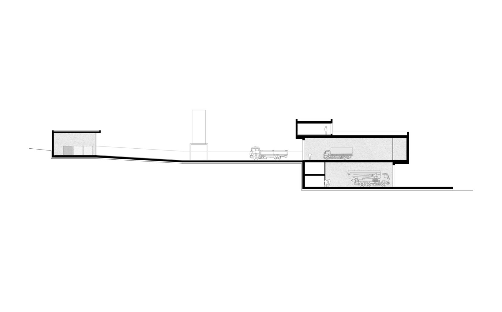 Problemstellung: Aufgrund der topographischen Situation und der verschiedenen Bedürfnisse von Feuerwehr und Bauamt schlagen wir vor, die unterschiedlichen Nutzungen vertikal übereinander zu stapeln und dabei die Neigung des Grundstücks zur Ausbildung der entsprechenden Vorplätze zu nutzen. Auf diese Weise wird das Grundstück in der Längsrichtung für die verschiedenen Nutzungen zoniert.