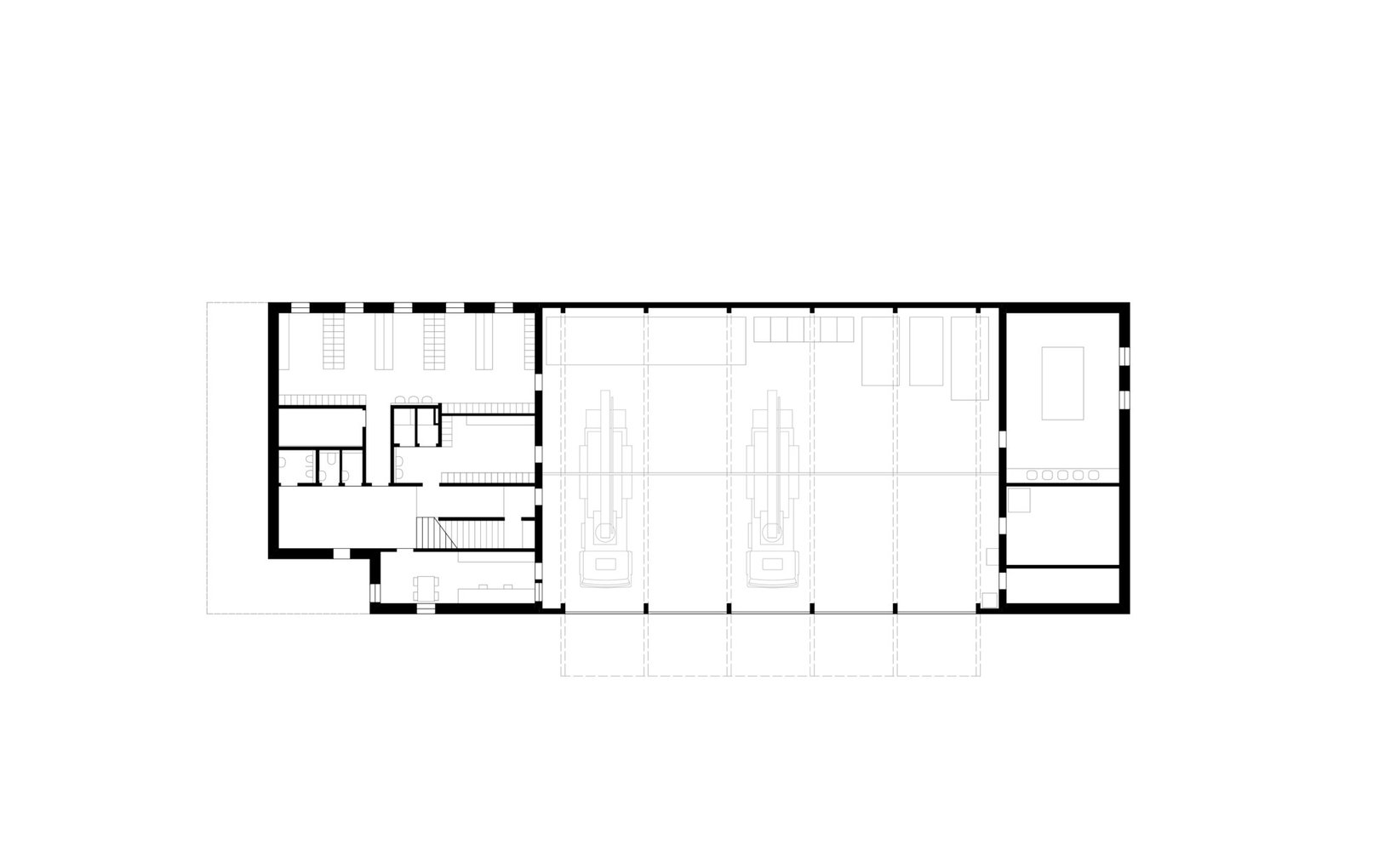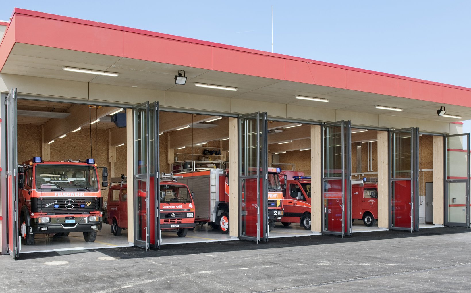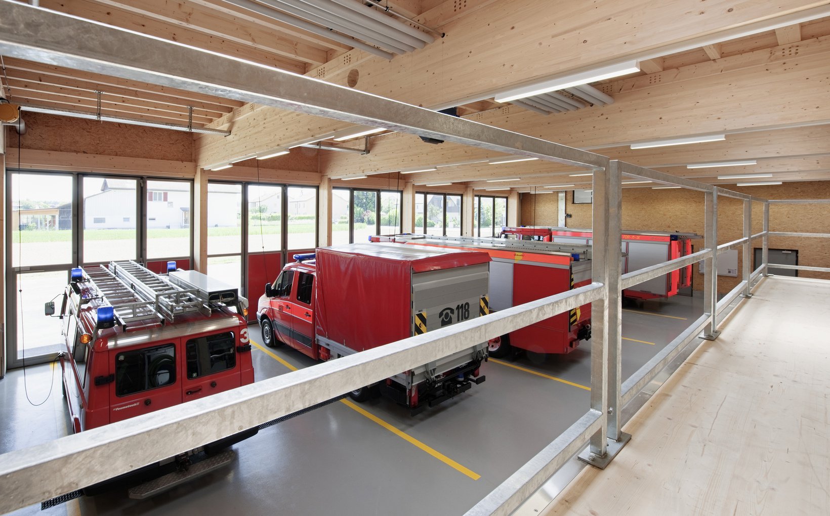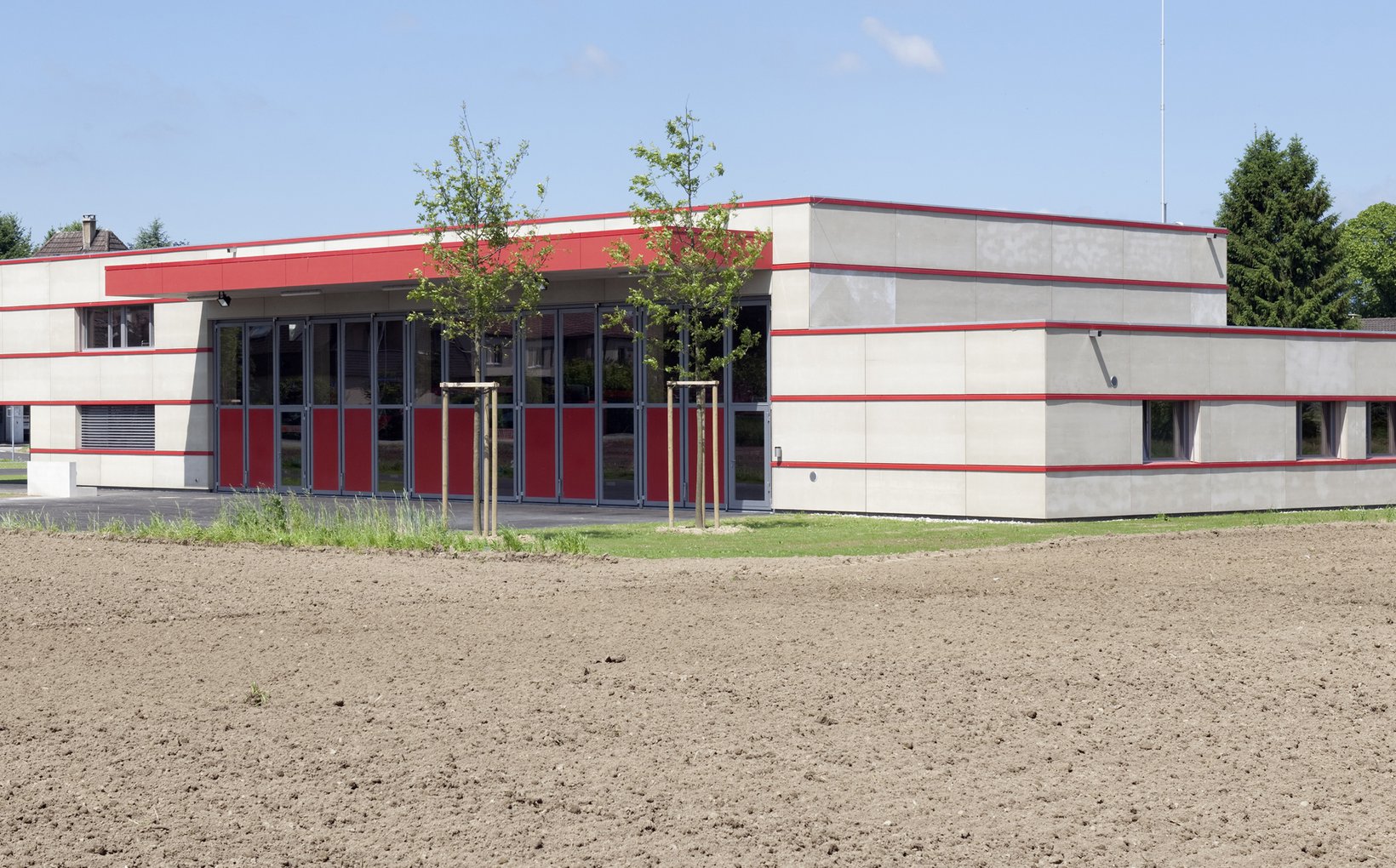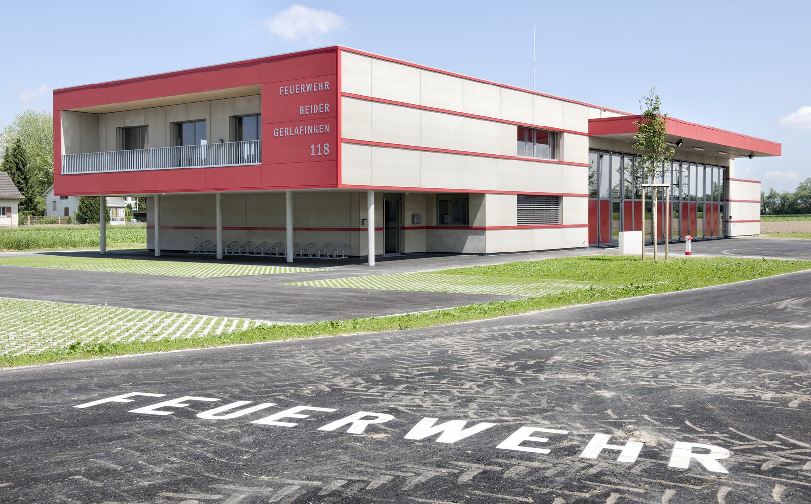 fsp: Das neue Feuerwehrgebäude ist als klar gestalteter Gebäudekörper konzipiert und wird parallel zur nördlichen Parzellengrenze angeordnet. Das Gebäude ist organisatorisch in drei Nutzungsgruppen aufgeteilt. Im Kopfbau auf der westlichen Hauptzugangsseite liegen die Garderoben und der Kommandoraum mit Blick in die Halle, im Obergeschoss darüber ist der Theorieraum plaziert. Angeschlossen an diesen Kopfteil ist die stützenfreie Fahrzeughalle, die von aussen über fünf grosse, teilweise verglaste Falttore erschlossen ist und rückseitig über Oblichter natürlich belichtet wird. Auf der Ostseite an die Fahrzeughalle angegliedert liegen die Werkstatträume. Es werden nachhaltige, einfache Materialien verwendet, welche sich funktional eignen und dem Gebäude trotzdem einen unverkennbaren Charakter geben. Grossflächige vorgehängte Duripanel?Fassadenplatten fassen die unterschiedlichen Nutzungsbereiche des Gebäudes zu einer Einheit zusammen. Die farbig gestaltete Eingangsfront, sowie dynamisch angeordnete Bandfenster ergänzen die Fassadengestaltung.
