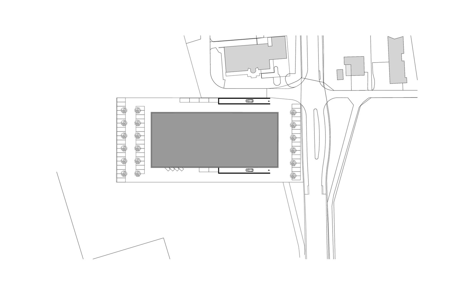 Problemstellung: Konsequentes Einbahnsystem aller Fahrtbewegungen als Basis für den betrieblichen Ablauf mit zwei Rampen zum Untergeschoss auf der Ost- und Westseite.