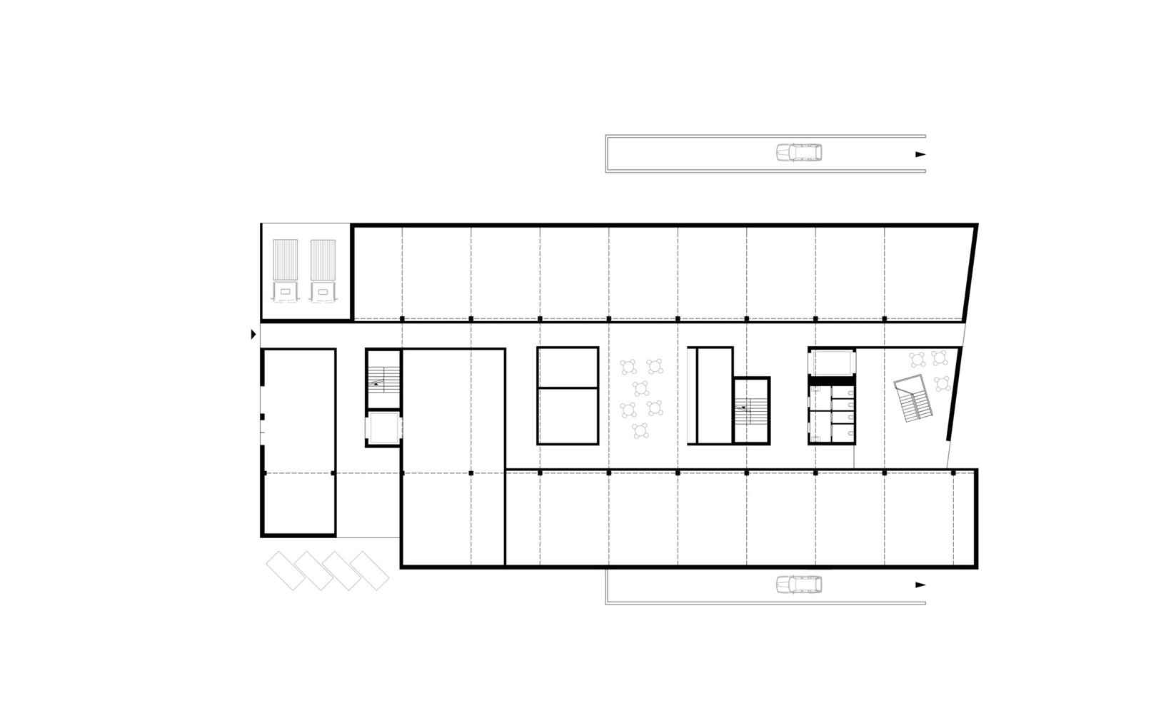 fsp: Im Erdgeschoss sind die wichtigsten betrieblichen Bereiche zusammengefasst. Die einfache, rechteckige Grundfigur ist in drei lineare Nutzungszonen mit zwei Erschliessungskorridoren gegliedert: Die mittlere Zone umfasst die Eingangsbereiche Kunden und Personal, diverse Diensträume, die vertikalen Erschliessungskerne und zwei Lichthöfe. Die zwei peripheren Funktionsbereiche sind durch ihre Lage optimal belichtet. Die zwei nördlich angeordneten Obergeschosse umfassen ca. ein Drittel der Grundfläche und funktionieren analog. Hier repräsentiert sich der Bau mit seinem Schwergewicht zur Kantonsstrasse am Ortseingang.