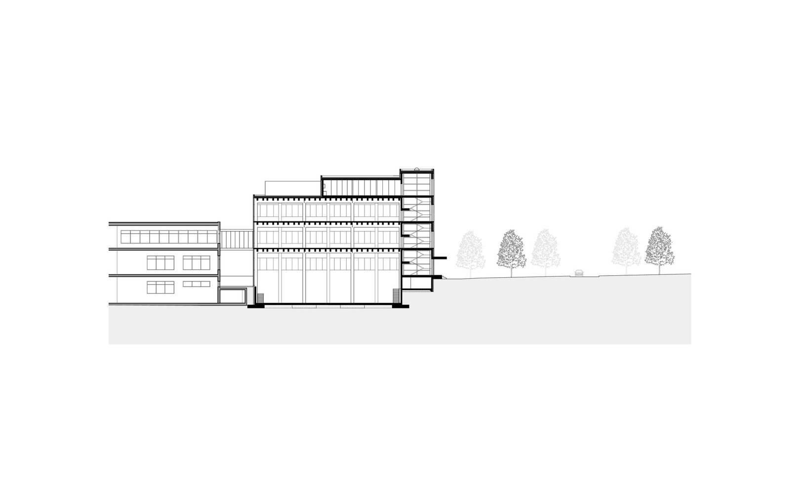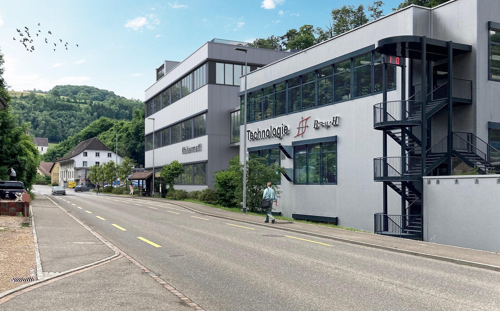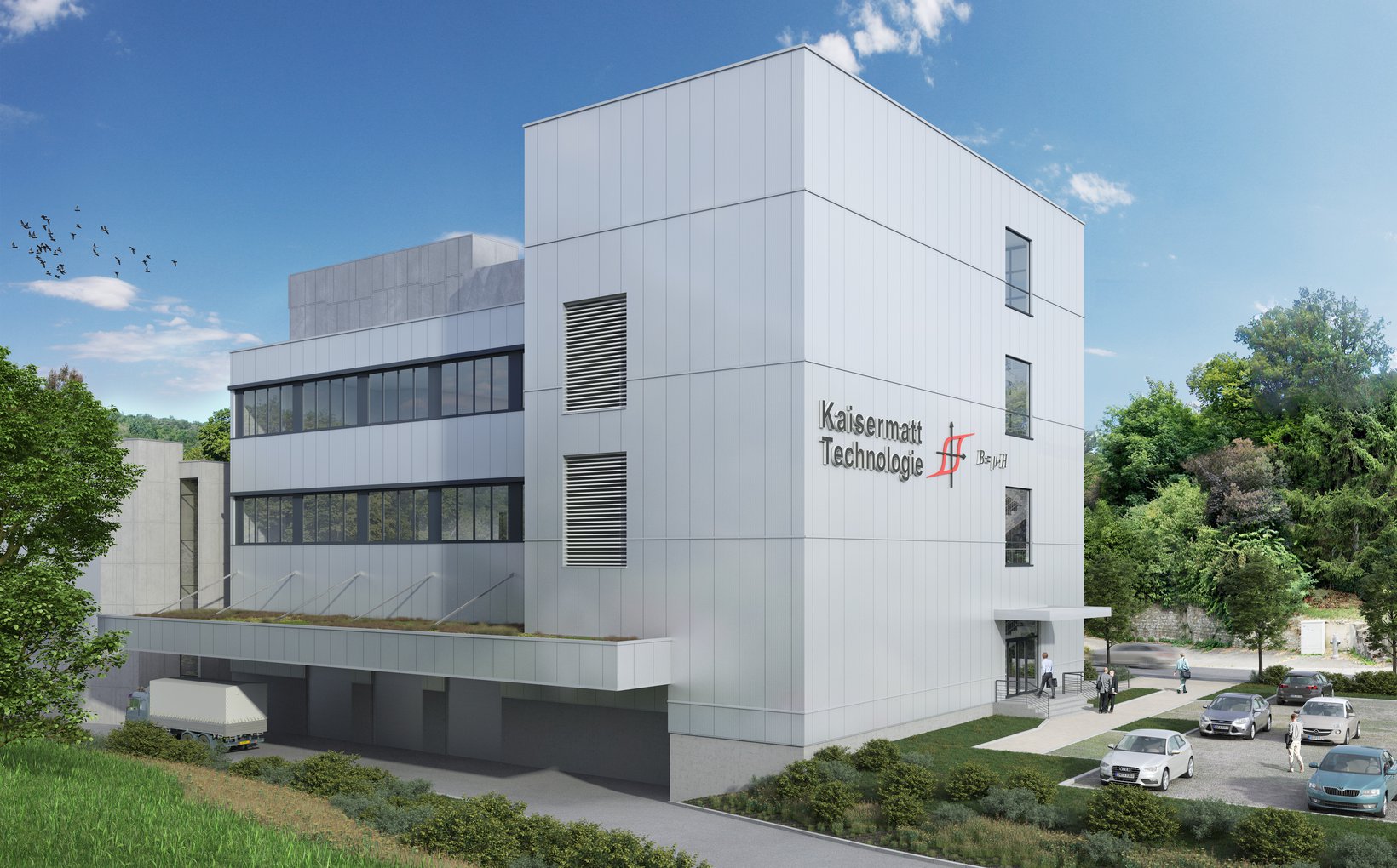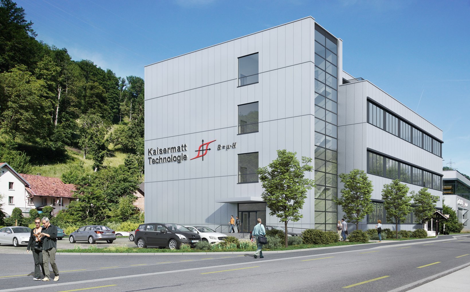 fsp: In Zusammenarbeit mit Goldbeck-Rhomberg als TU wurde das Gebäude in einer modularen Beton-Stahlbauweise entwickelt. Die Fassade ist in einer einfachen Bauweise an die angrenzenden Gebäude angeglichen, um sich in die Reihe der bestehenden Bauten einzuordnen. Der Lager- und Produktionsbereich grenzt an das bestehende Gebäude Kaisermatt 3 an und weist über die gesamte Gebäudehöhe drei Geschosse auf. Im angrenzenden südlichen Gebäudeteil entsteht ein Zwischentrakt der die Erschliessung, Nebenräume und zuoberst eine Mensa mit Terrasse beherbergt. Dieser Gebäudeteil gliedert sich in acht Geschosse resp. Zwischengeschosse und ermöglicht so den Zugang zu den unterschiedlichen Nutzungen, sowie die Erschliessung und Infrastruktur für einen zukünftigen angrenzenden Kopfbau im Süden.