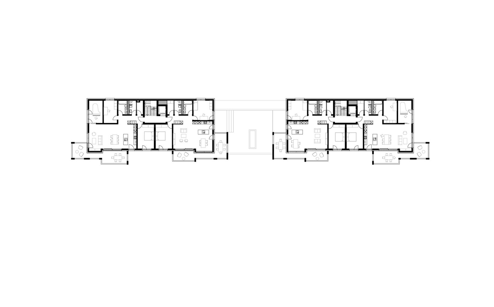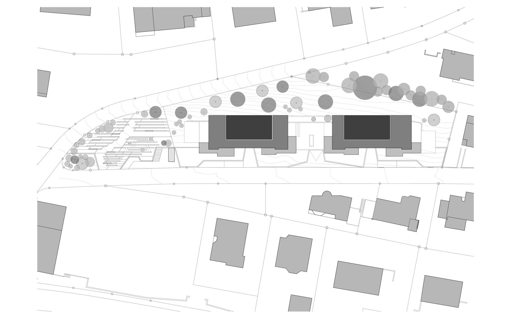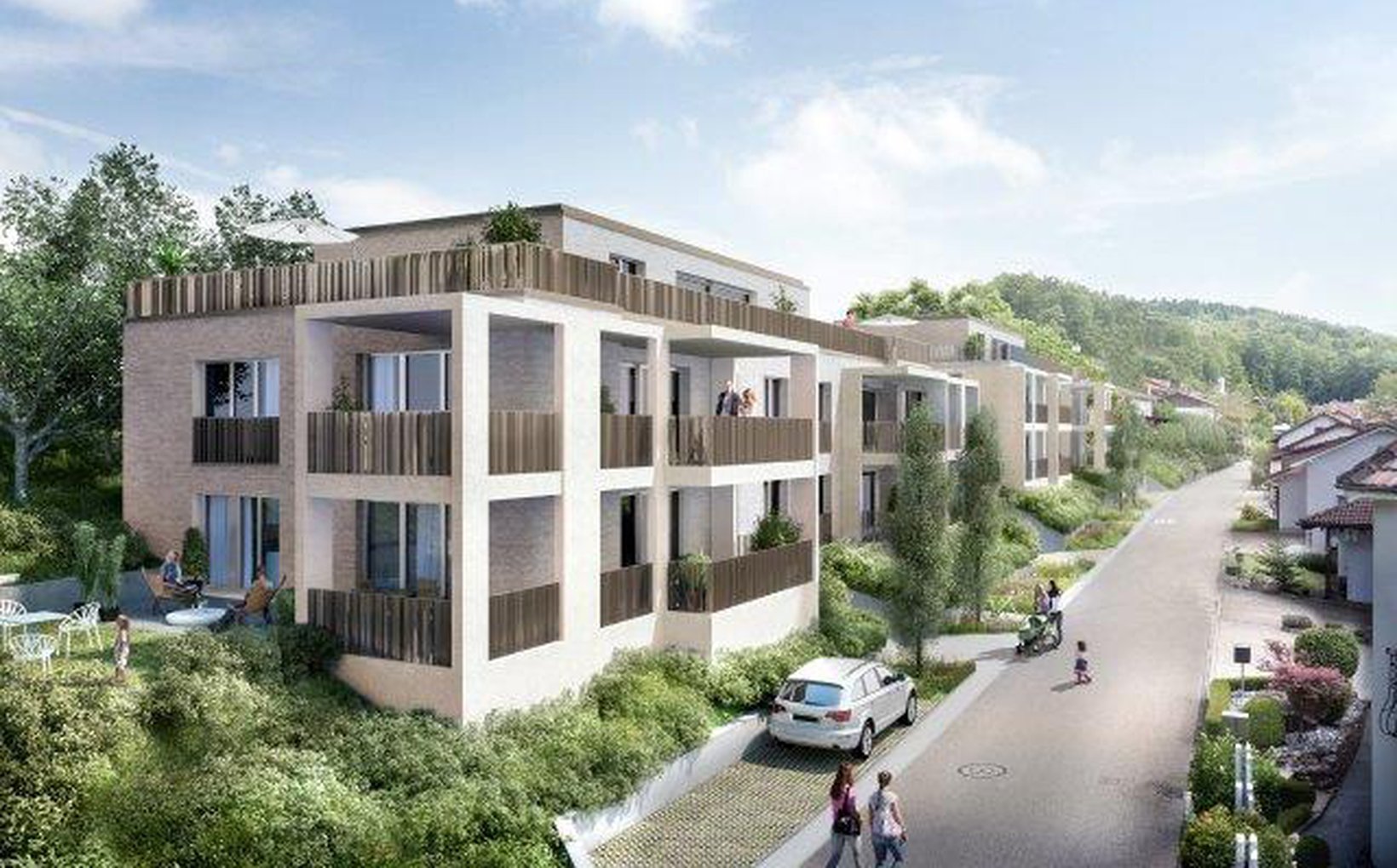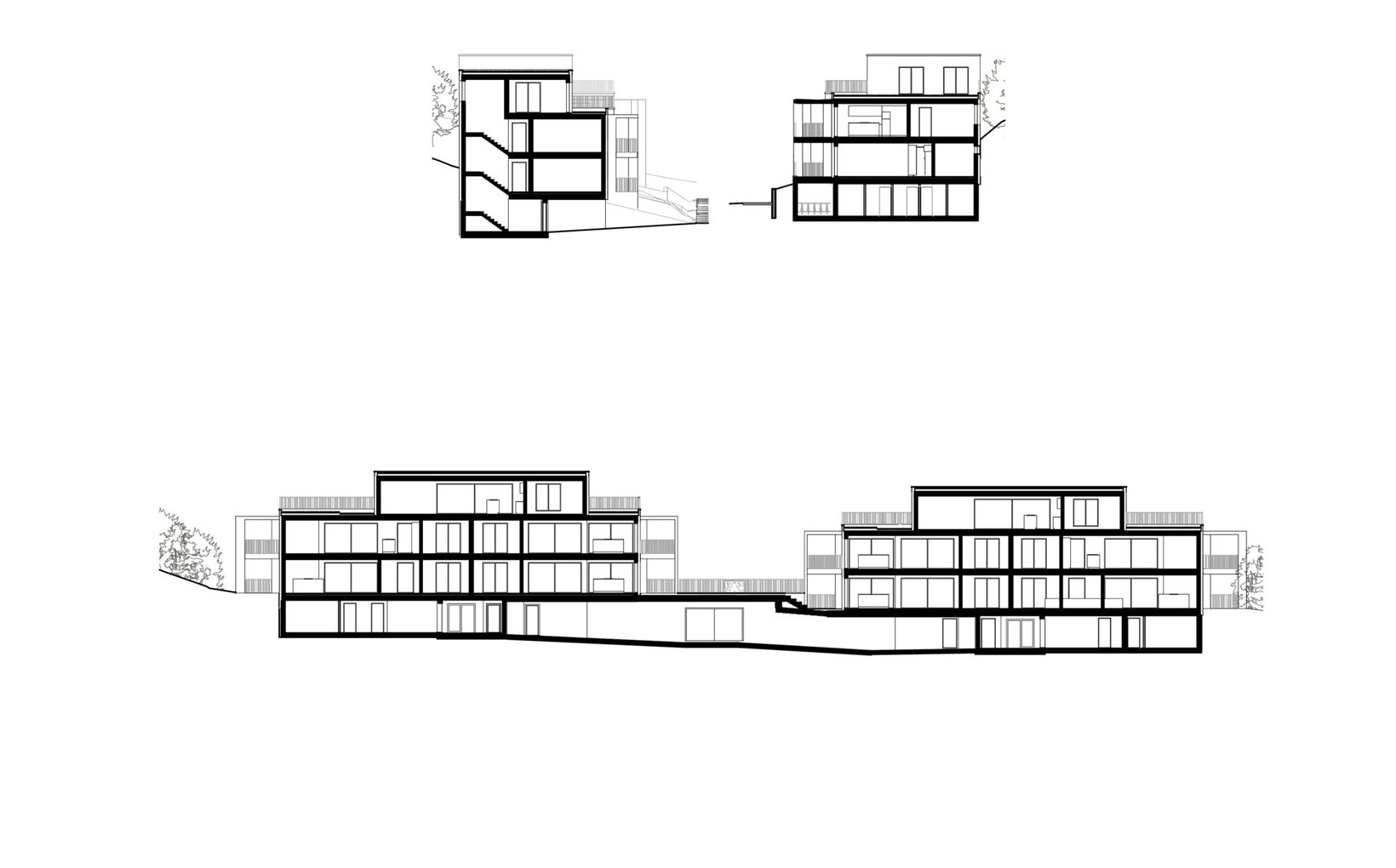 fsp: Zwei Baukörper mit identischer Volumetrie bilden eine Einheit und fügen sich wie selbstverständlich in den heterogenen städtebaulichen Kontext ein. Die Gebäude sind entlang der Parzellengrenzen angeordnet und fügen sich durch die Höhenstaffelung der Umgebung wie selbstverständlich in den Hang hinein. Es entstehen dadurch grosszügige und vielfältige Aussenräume die durch eine sanften Zonierung von privaten, halbprivaten bis hin zu öffentliche Bereichen auszeichnet. Die Loggien sind zweiseitig orientierte feste Körper, die sich als Volumen zur Richtung Süden richten.Die Bauvolumen sind mit klar gegliederten und dennoch mit abwechslungsreichen Grundrissen bestückt.
