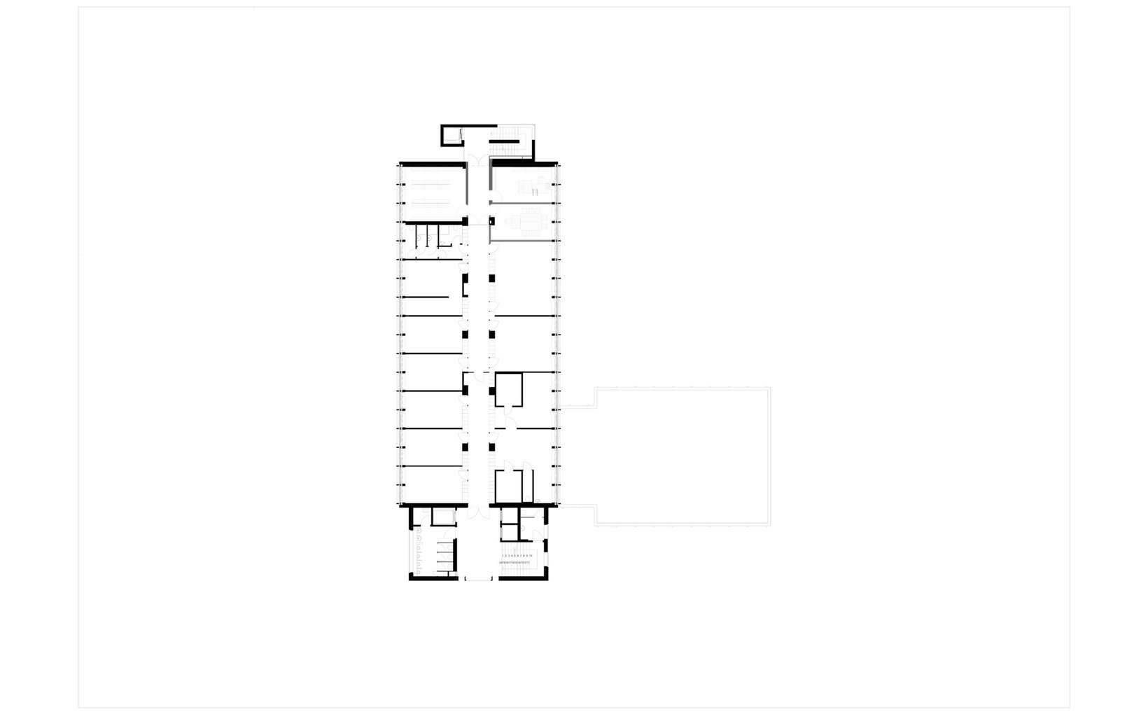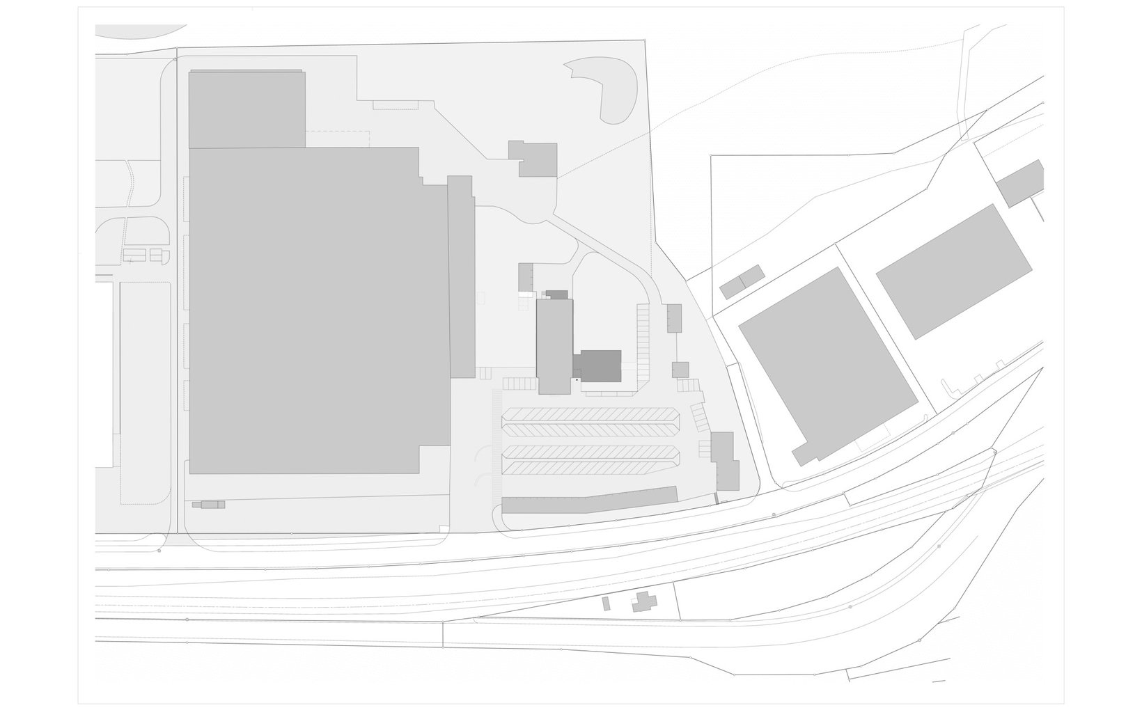 Problemstellung: Der bestehende Bau gliedert sich in den muralen Kopfteil mit Treppenkern / Infrastruktur und die anschliessende fein gegliederte Metallfassade der Büroflächen. Diese starke Identität wird beibehalten. Die Erweiterung erfolgt mit einem seitlichen Annexbau mit dem neuen Haupteingang, dem Polizeiposten und weiteren Nutzflächen.