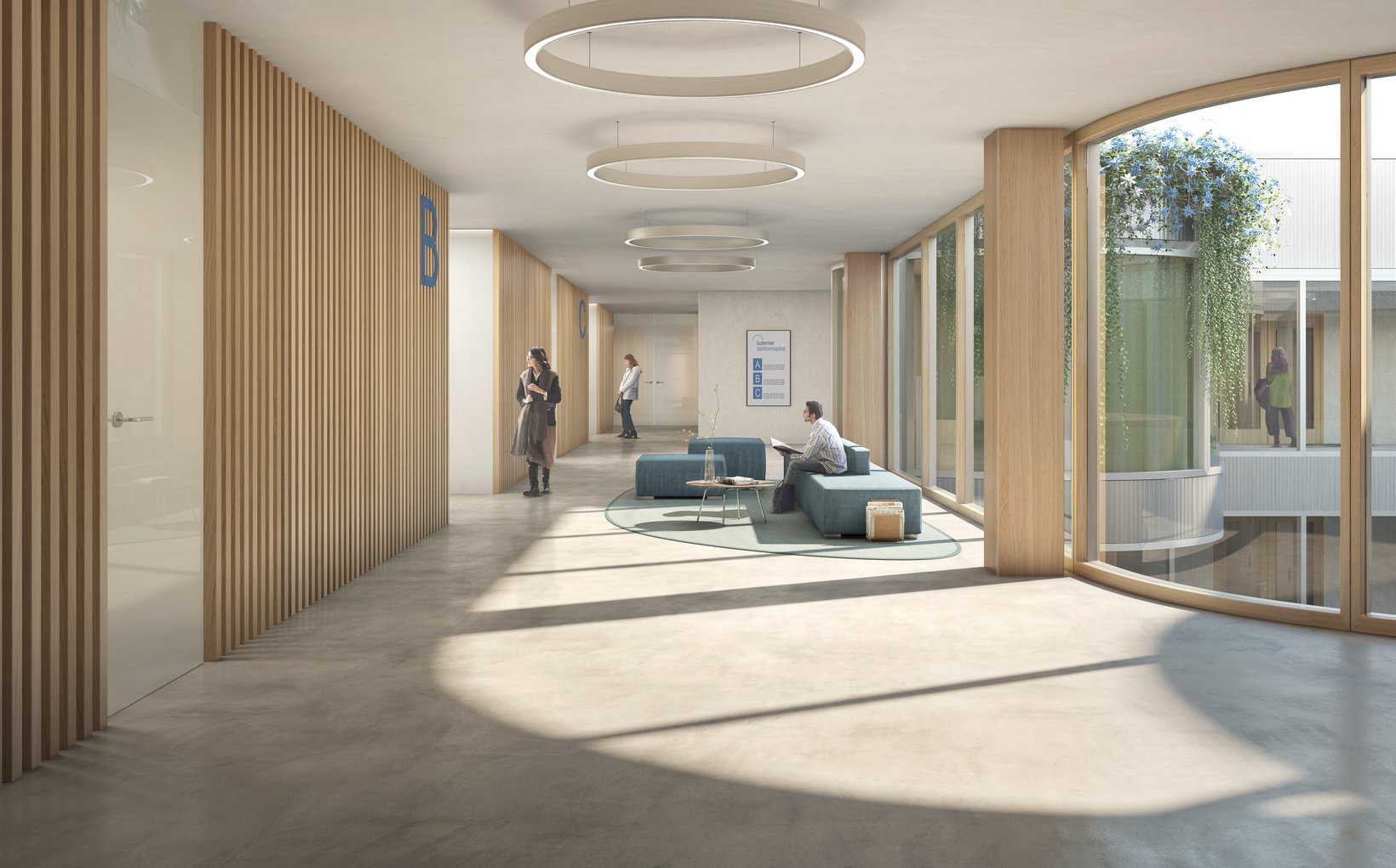 fsp: Der Neubau des Ambulanten Zentrums für das LUKS bildet zusammen mit dem Spitalplatz an der Schnittstelle zwischen Spitalareal und Stadt ein städtebauliches Bindeglied und ist zudem die erste Adresse des ortsbaulich neu strukturierten Areals. Das Volumen besteht aus einem teilweise unterirdischen Gebäudesockel, welcher die Höhe des Geländesprungs darstellt. Darüber werden zwei separate Körper mit spannungsvoller Höhendifferenz vorgeschlagen. Architektonisch wird gegen die Spitalstrasse die Eingangssituation mit einer Arkade und Fassadenrücksprung beim höheren Gebäudeteil markiert. Hier befindet sich zugleich der Haupteingang in das Zentrum und damit zu allen ambulanten Dienstleistungen. Daneben bildet die Cafeteria hier den zentralen Treffpunkt mit Aussenorientierung zum Spitalplatz hin. Auch an dieser Stelle befindet sich neu eine Arkade, welche den Spitalplatz flankiert und eine witterungsgeschützte und für Besucher gut lesbare Verbindung zur neu geplanten Vertikalerschliessung mit den Liften am Beginn der Freitreppe bildet. In beiden Gebäudeteilen sind zentral gelegene Innenhöfe vorgesehen. Diese dienen einerseits der räumlichen Gliederung der tiefen Gebäudekörper, der Orientierung für Patienten und Personal als auch der natürlichen Belichtung. Für den Sockelteil wird im Bereich der Promenade ein weiterer Innenhof zur Belichtung von Arbeitsplätzen und inneren Orientierung im Gebäude vorgesehen.