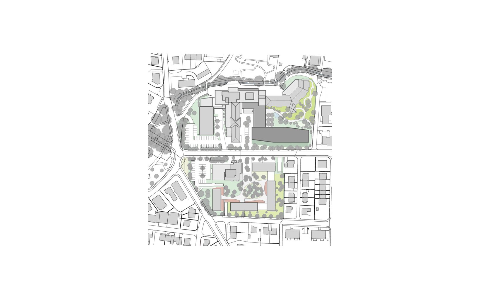 fsp: Die Spitalerweiterung wird durch Anbau auf der Seite Süssbach ermöglicht. Für den Neubau Pflegezentrum mit ca. 100 Zimmern wird ein vier- bis fünfgeschossiger Neubau an der Fröhlichstrasse den neuen Abschluss der Parkanlage bilden. Das bestehende Hochhaus wird für betreutes Wohnen umgebaut. Die vorhandene hofartige Wohnbebauung wird mit zeitgemässen Neubauten für ca. 50 Wohnungen ersetzt. Design to Value: Energetische optimale Aussenhüllen (Minergiestandard). Eine neugestaltete Umgebung welche alle Bauten zu einer Einheit vereint.