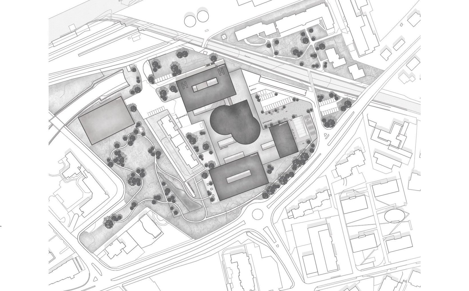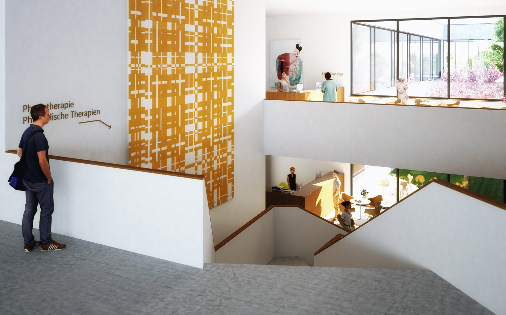 Problemstellung: Mit Focus auf die Effizienz der Betriebsabläufe werden Patienten- und Besucherströme sowie öffentliche und interne Bereiche durch eine zweispurige Erschliessungsmagistrale getrennt.