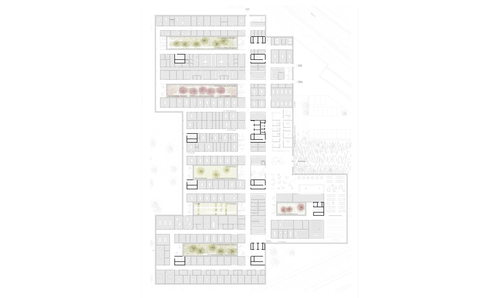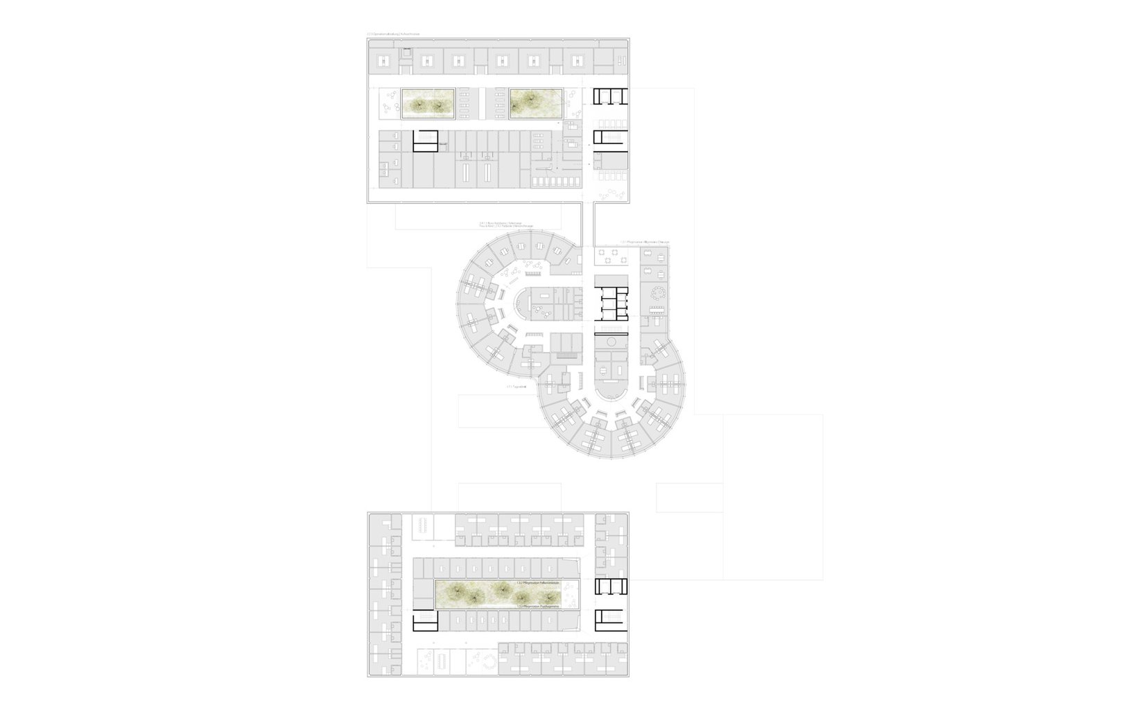 fsp: Es entsteht eine massstäbliche neue symmetrisch prägnante ortsbauliche Gesamtstruktur, die sich mit angenehmer Selbstverständlichkeit in den topografischen und räumlichen Kontext einpasst. Die klare Adressbildung mit einer mittig ausgerichteten Hauptzugangsachse von Osten wird beibehalten. Grosszügig eingeschnittene, verschieden gestaltete Innenhöfe mit Aussenbezug bringen Tageslicht in die Tiefe des Gebäudekomplexes, schaffen Sichtbezüge und dienen damit der Orientierung und Wegführung.