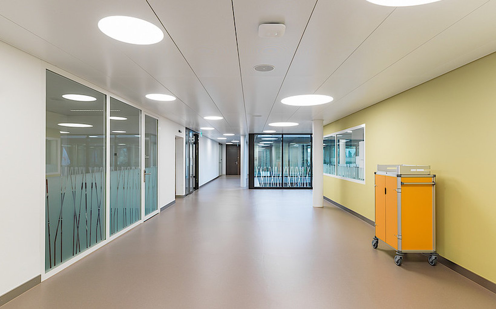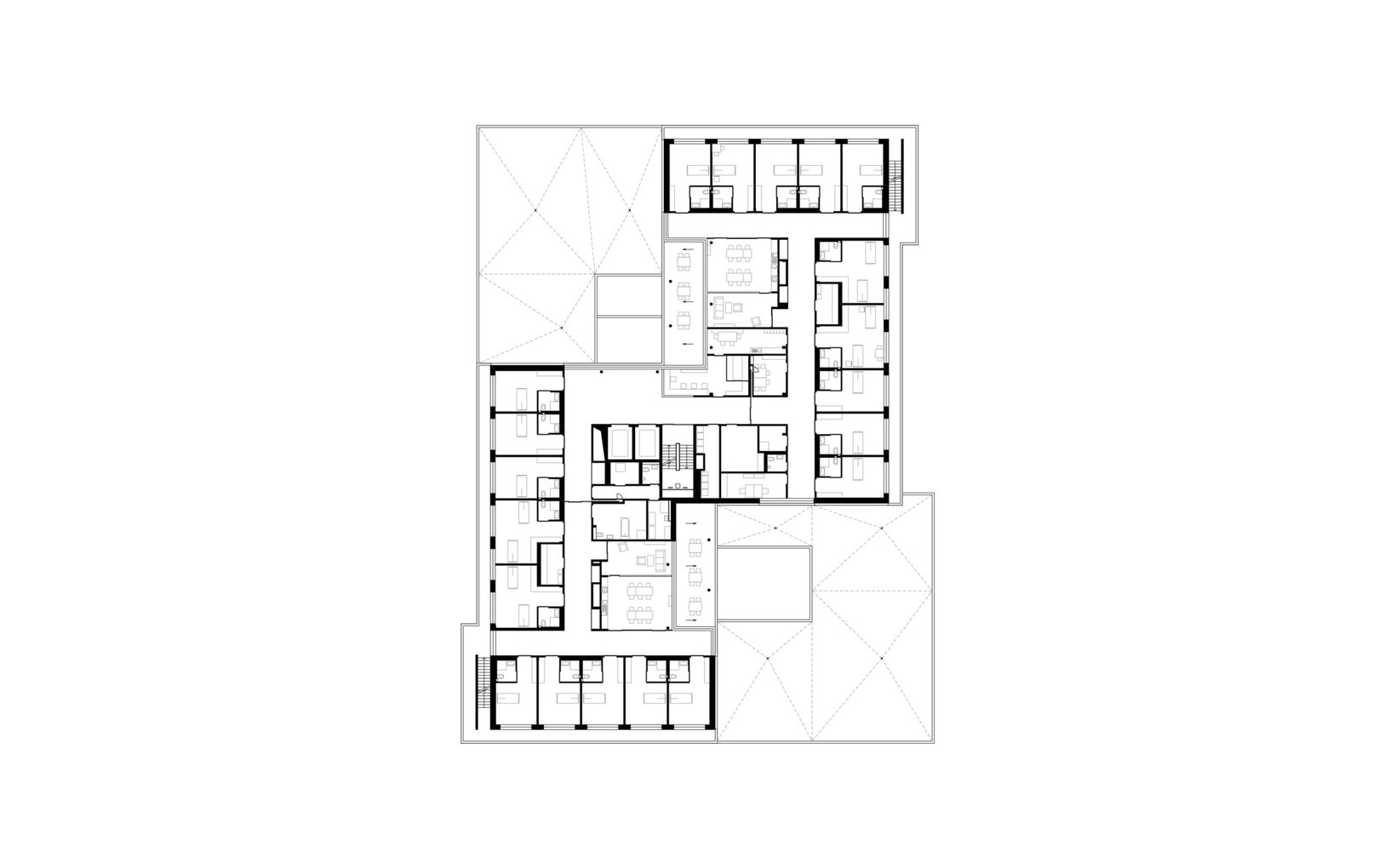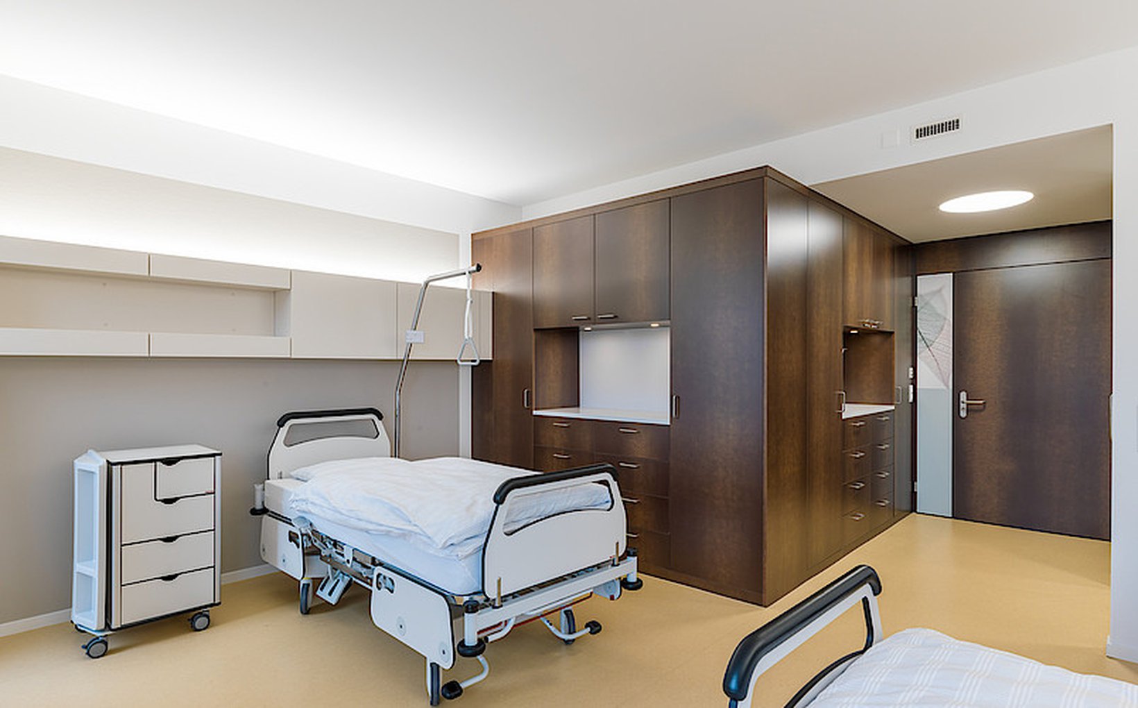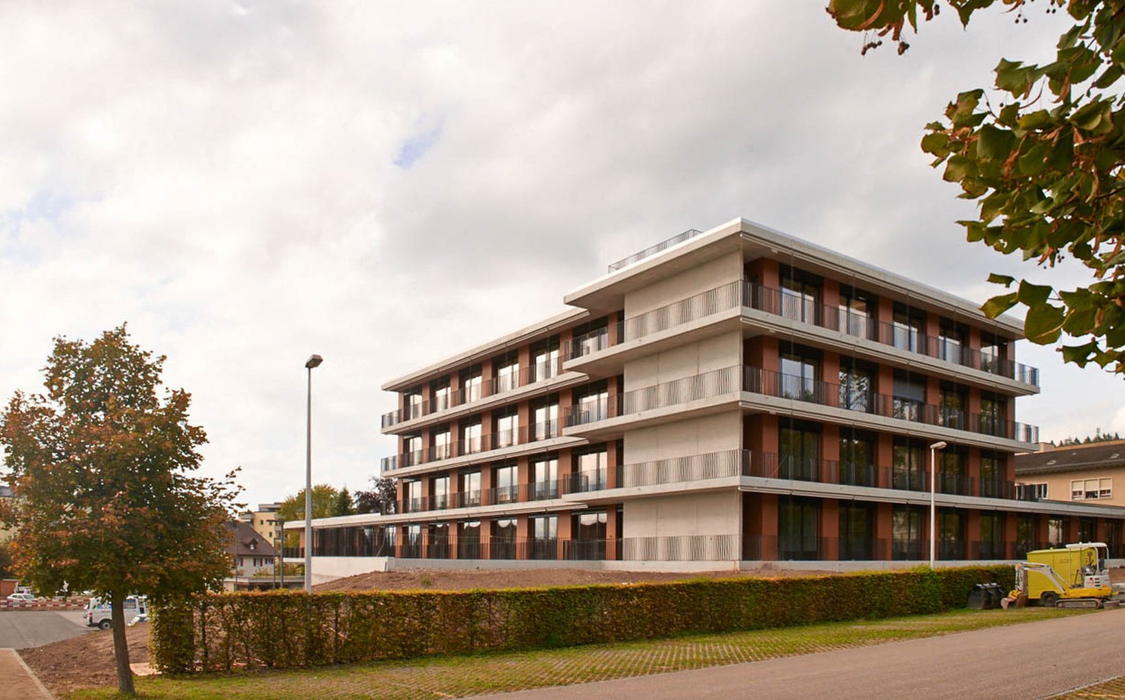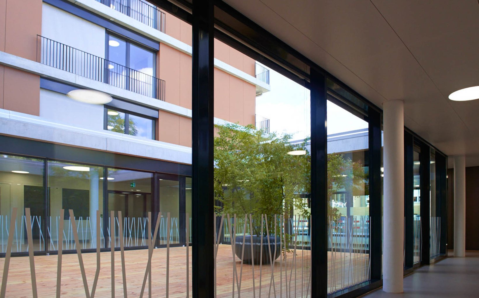 fsp: Die architektonische Gestaltung des Pflegezentrums hebt sich bewusst von der des Akutspitals ab. Der Baukörper besteht aus einem Eingangsgeschoss und vier darüber liegenden Vollgeschossen. Diese bilden in der Z-förmig gegliederten Grundfigur die Organisation der Pflegeabteilung ab. Das Gebäude wird durch umlaufende, auskragende Deckenplatten als vorgelagerte Balkonschicht horizontal gegliedert. In den Obergeschossen befindet sich pro Geschoss eine Pflegestation. Die z-förmig versetzte Grundrissfigur unterstützt die Gruppenbildung. Die Zimmer jeder Gruppe orientieren sich um den zentral gelegenen Aufenthaltsbereich. Allgemein genutzte Räume befinden sich im Zentrum der Station bei der Haupterschliessung.