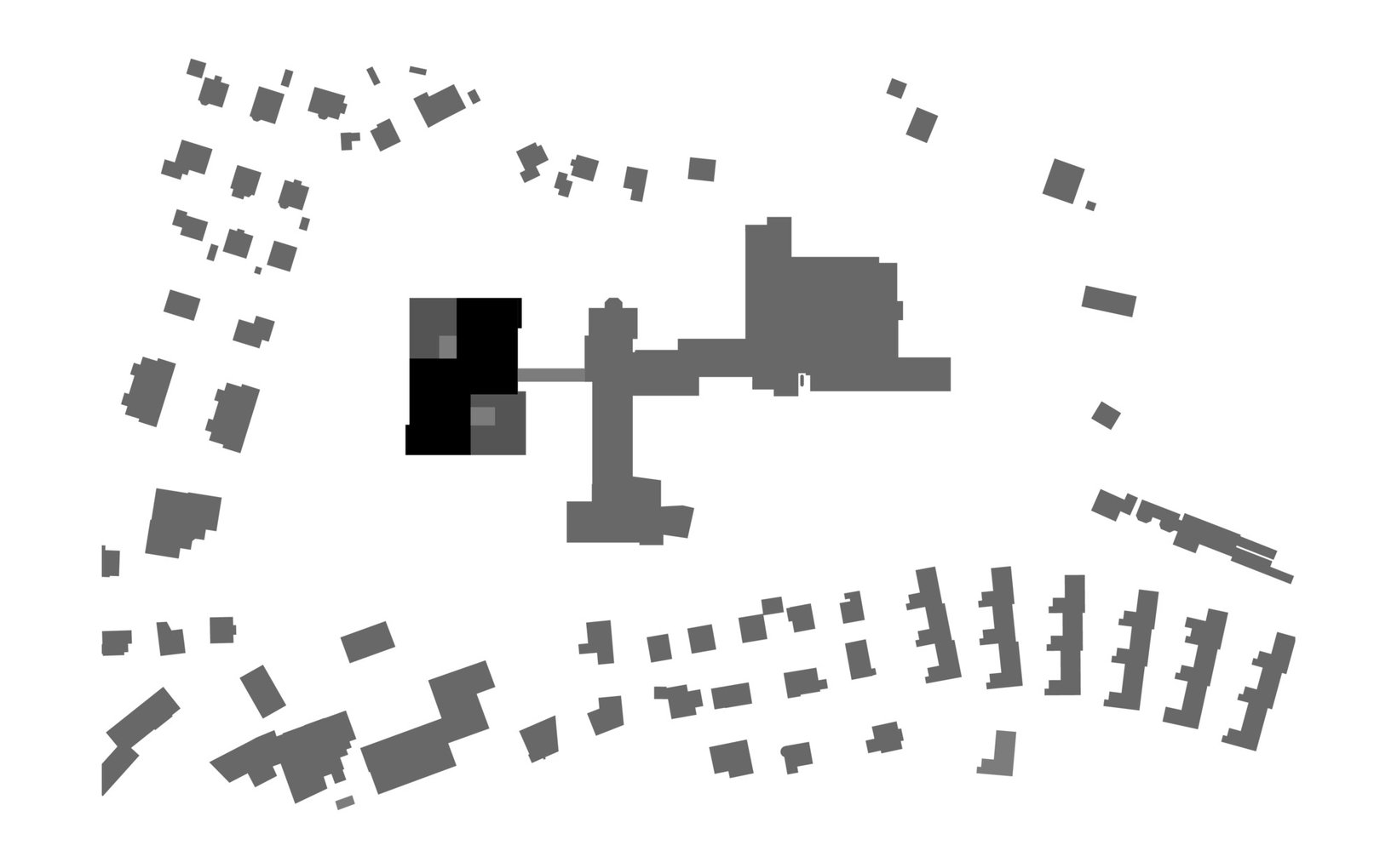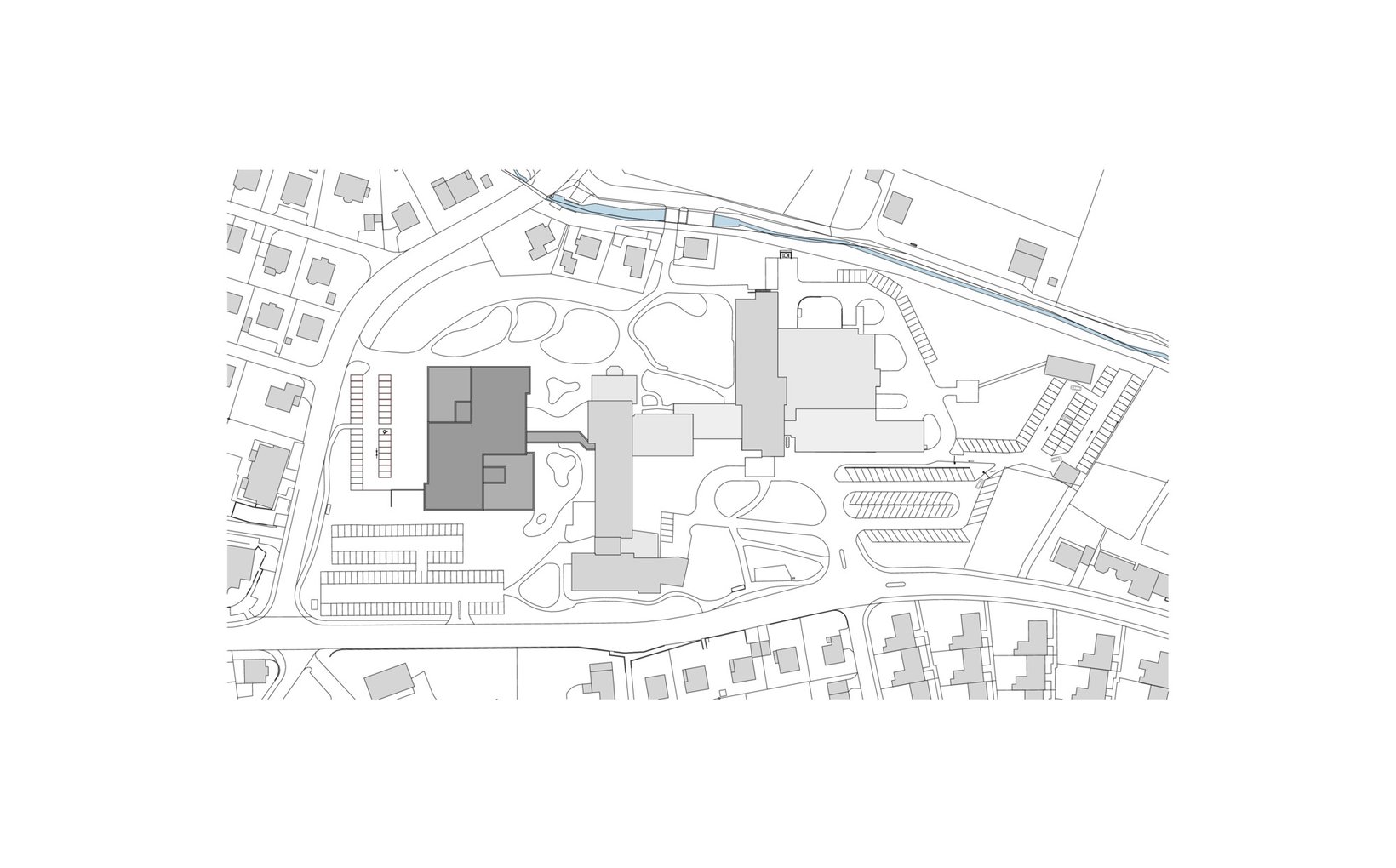 Problemstellung: Situierung des 4-geschossig in Erscheinung tretenden Neubaus im westlichen Grundstücksteil des Spitalareals, parallel zum geplanten Bettenhausneubau ausgerichtet.