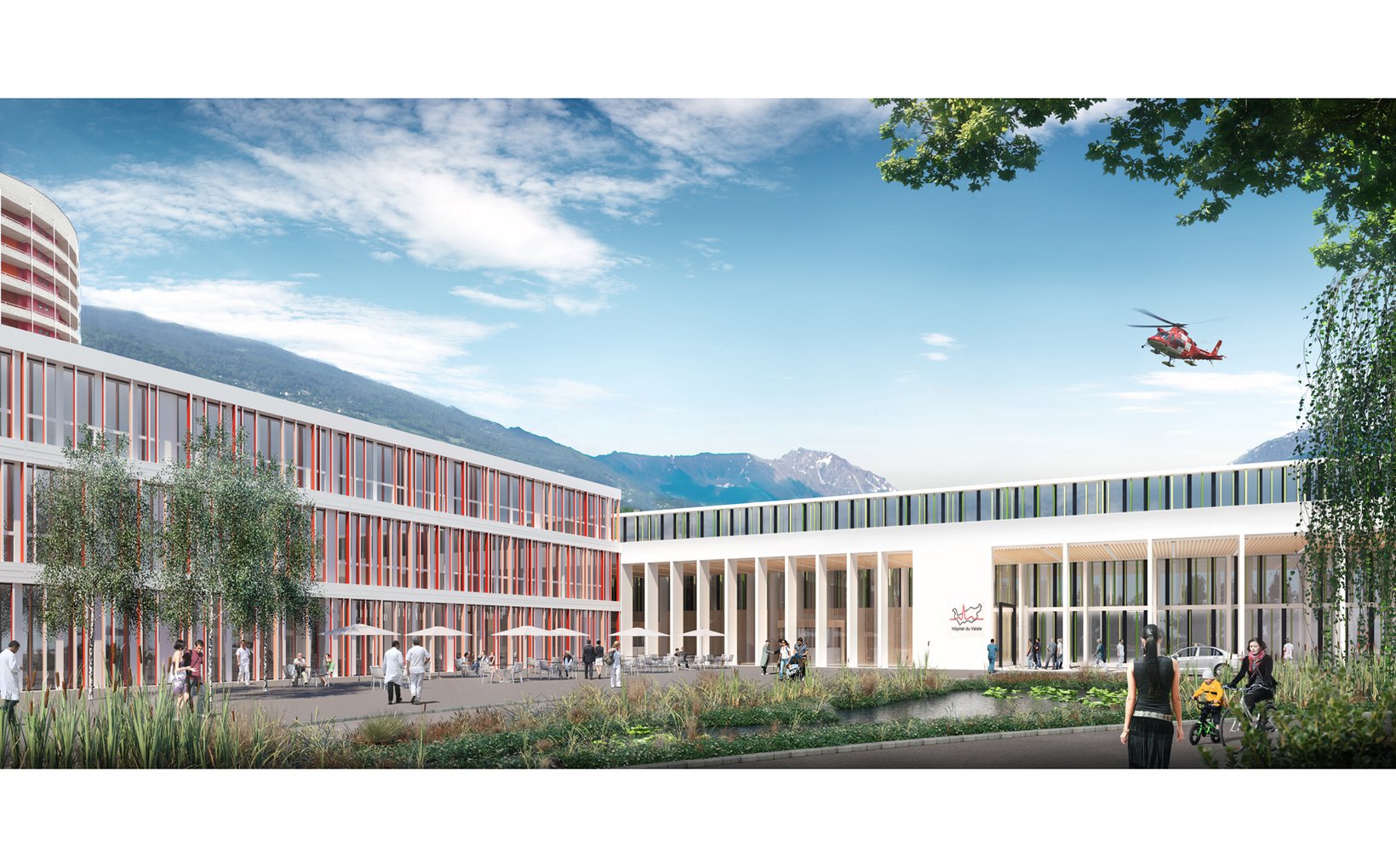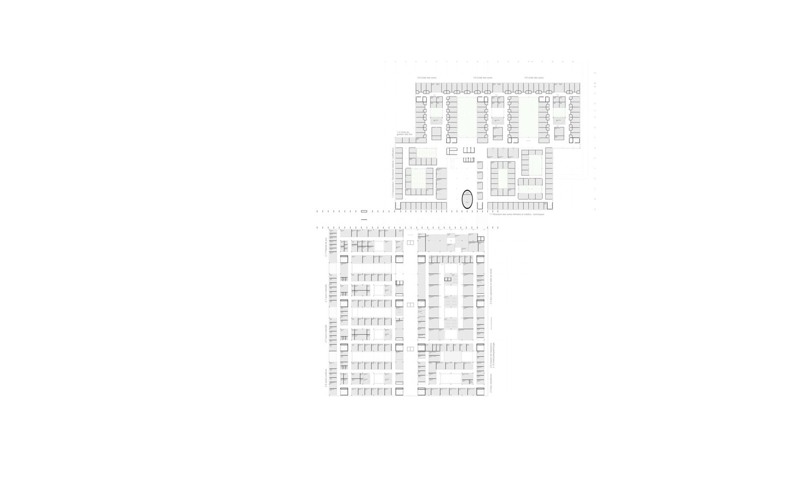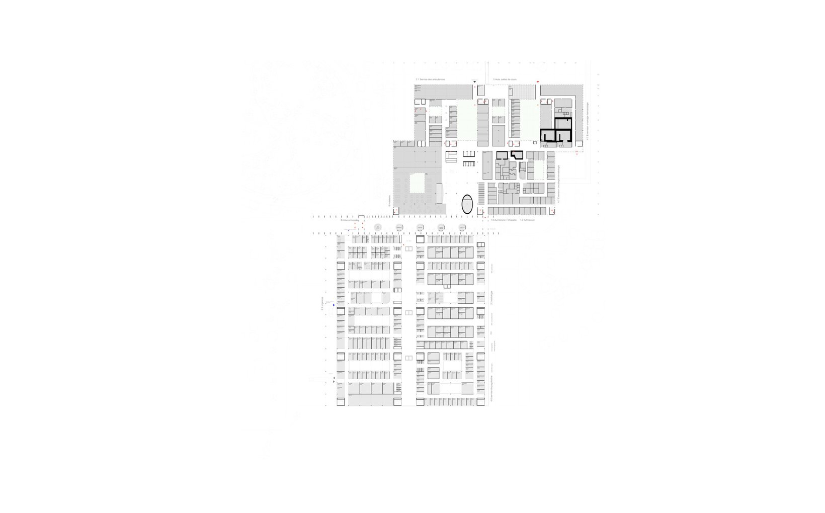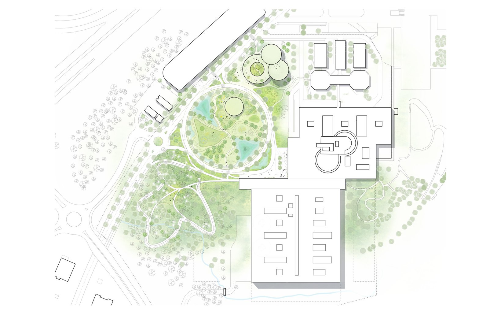 fsp: Der Neubaukörper entwickelt sich südlich auf der Basis eines orthogonalen, funktionalen Grids, welches die Patienten- und Besucherflüsse voneinander getrennt organisiert. Zwischen die Gebäude wird in Ost-West-Richtung eine Besuchermagistrale mit neuem Haupteingang gelegt. Eine kreisförmige Parkanlage mit äusserer Ringerschliessung führt als gestalterisches und multifunktionales Element den Publikumsverkehr vom Parkhaus zum neuen Haupteingang und zur Notaufnahme.