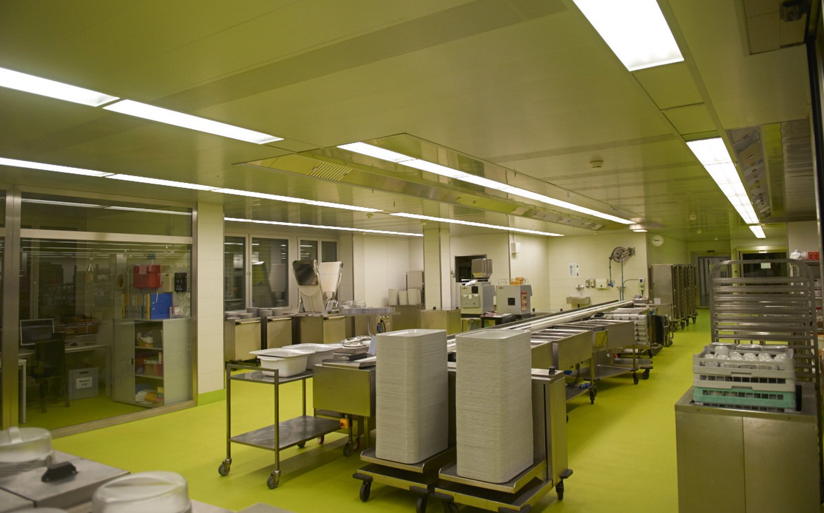 fsp: Das Wirtschaftsgebäude wurde 1970 erstellt. Mit einem Umbau und einer Erweiterung sollten die aktuellen Bedürfnisse und neue gesetzliche Vorschriften erfüllt werden. Ein Studienauftrag unter fünf Generalplaner-Teams führte zum einstimmigen Juryentscheid, unser Projekt weiter zu bearbeiten und zu realisieren. Das bestehende Wirtschaftsgebäude wird von der Heizzentrale getrennt und nach Osten linear erweitert. Mit dieser Massnahme konnte die bestehende Küche so lange in Betrieb bleiben, bis die neue Küche bezugsbereit war. Es brauchte kein Küchenprovisorium. Dank der additiven Erweiterung parallel zum Hang wird der Wirtschaftstrakt zum Rückgrat und das vorangestellte “Kanzel-Restaurant“ erhält damit einen kubischen Halt und wird in seiner Lage architektonisch aufgewertet. Die langfristige Möglichkeit für die Erweiterung des Wirtschaftstraktes auf der Ostseite wird damit geschaffen. Die Trennung der Ver- und Entsorgung, der Spitalgutanlieferung und der Küchenanlieferung ist somit gewährleistet. Das realisierte Nutzungs- und Erschliessungskonzept hat eine klare räumliche Organisation ermöglicht optimierte Betriebsabläufe.