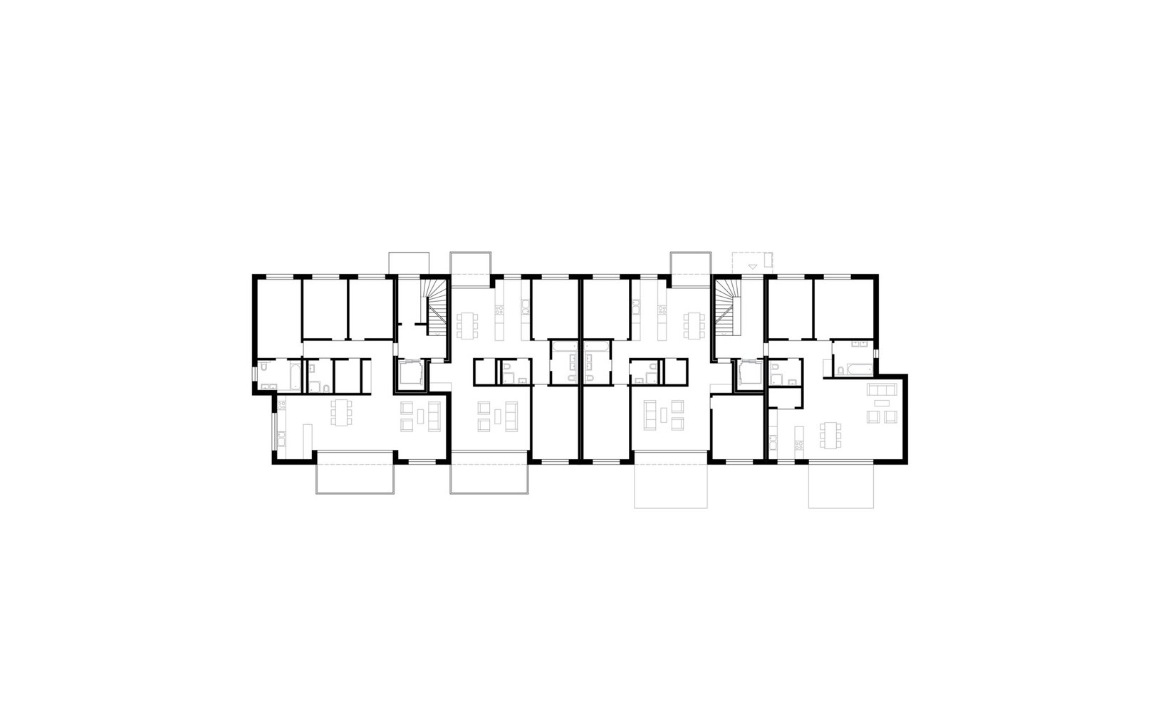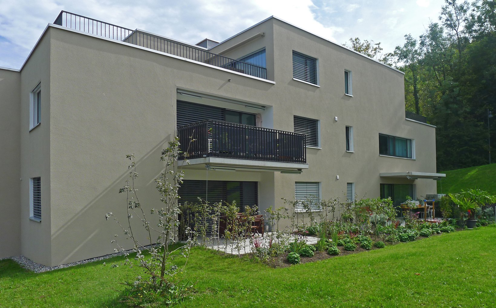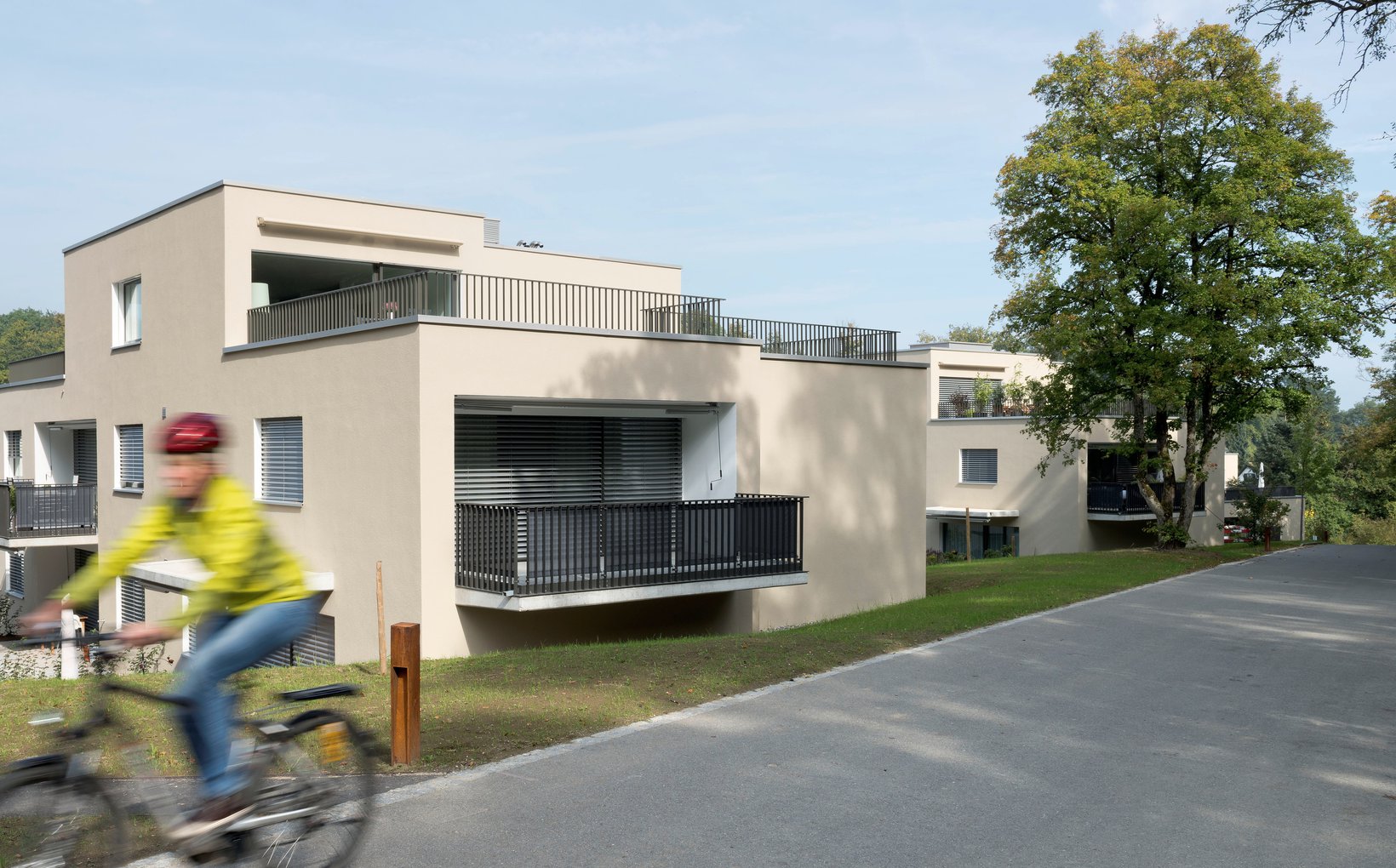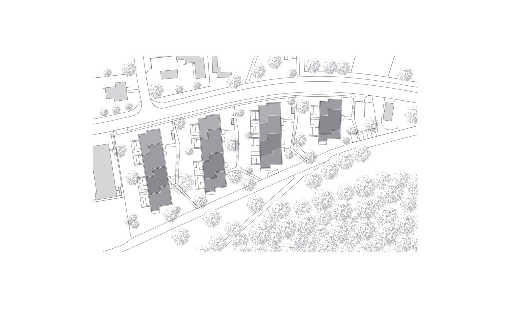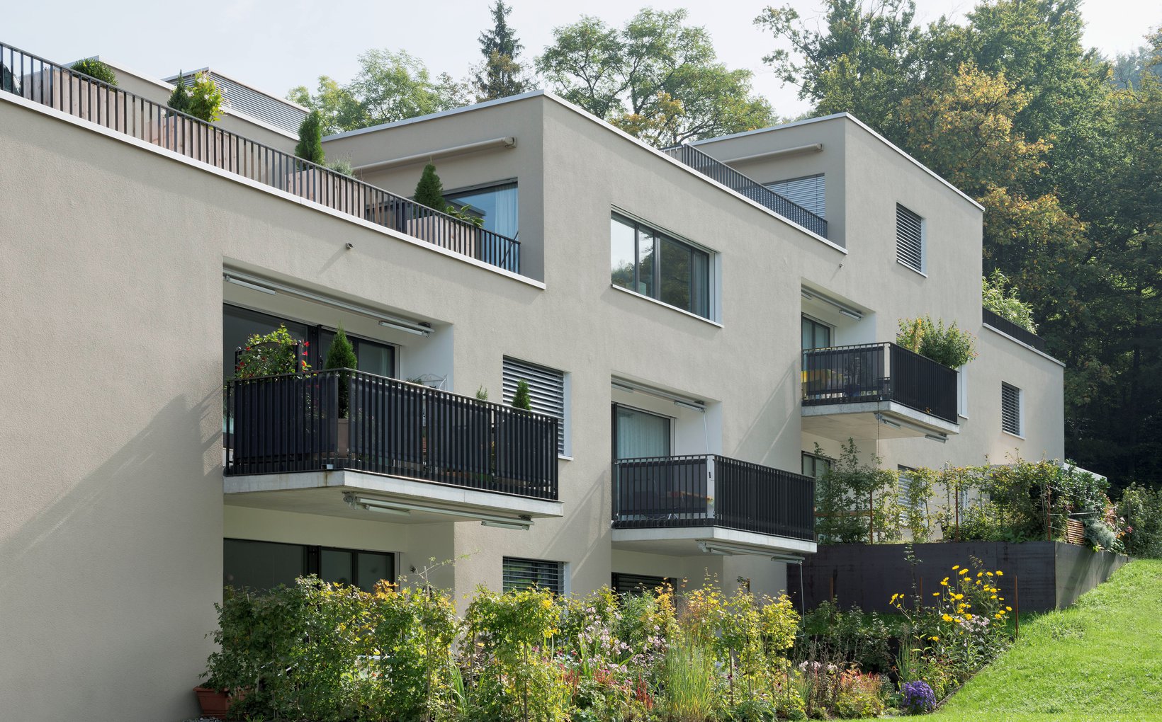 fsp: Vier annähernd parallele, leicht ausgefächerte Baukörper bieten Raum für 35 Wohnungen. Die linearen Baukörper folgen mit ihren Abtreppungen der Neigung des Hanges. Die durchfliessenden Zwischenräume schaffen den Bezug zwischen dem angrenzenden Wald und den bestehenden Bauten der Allmend, gleichzeitig bilden sie interessante Aussenräume für die Bewohner. Alle Wohnungen sind nach mindestens zwei Seiten orientiert und trotz Nordhanglage optimal besonnt.