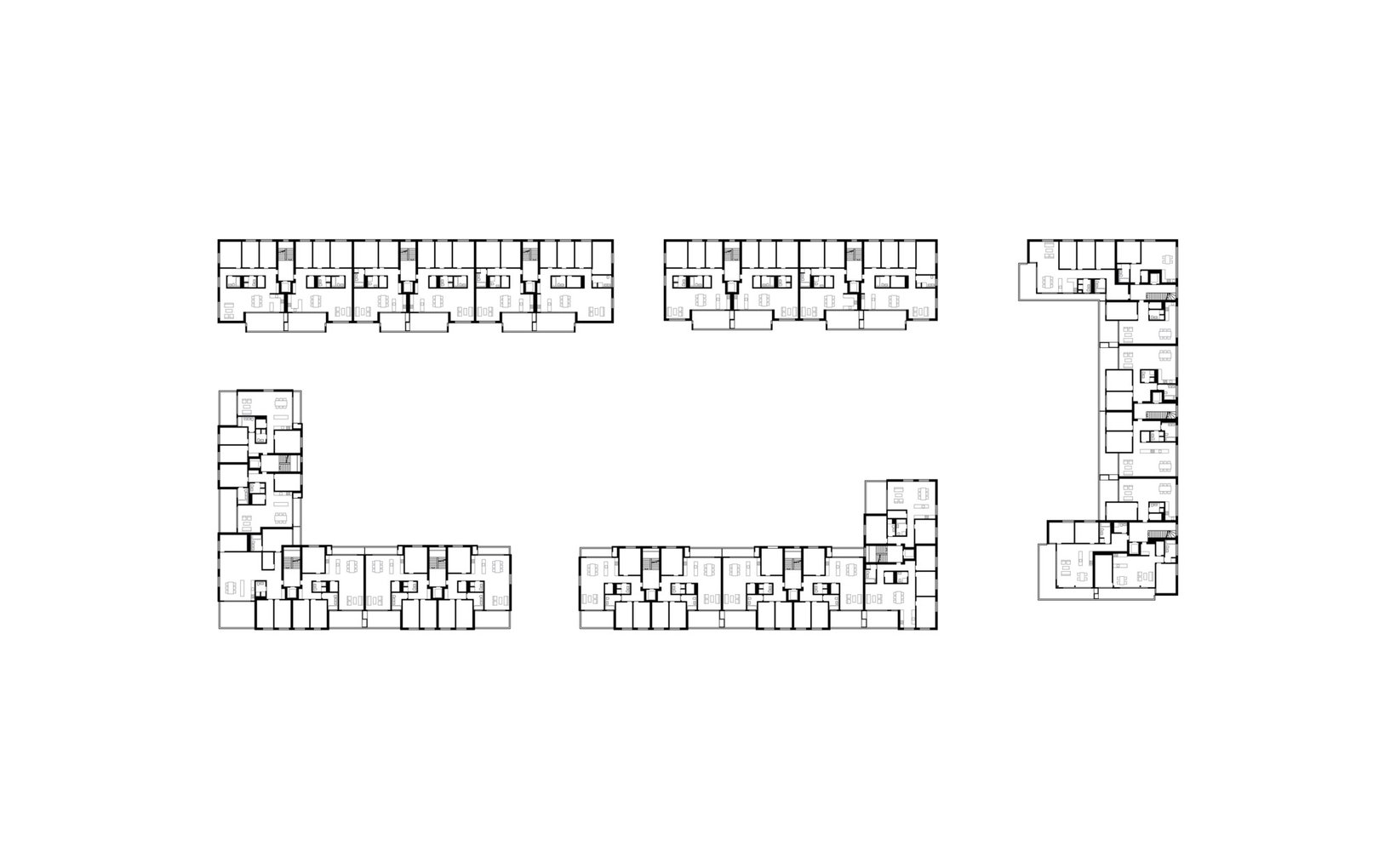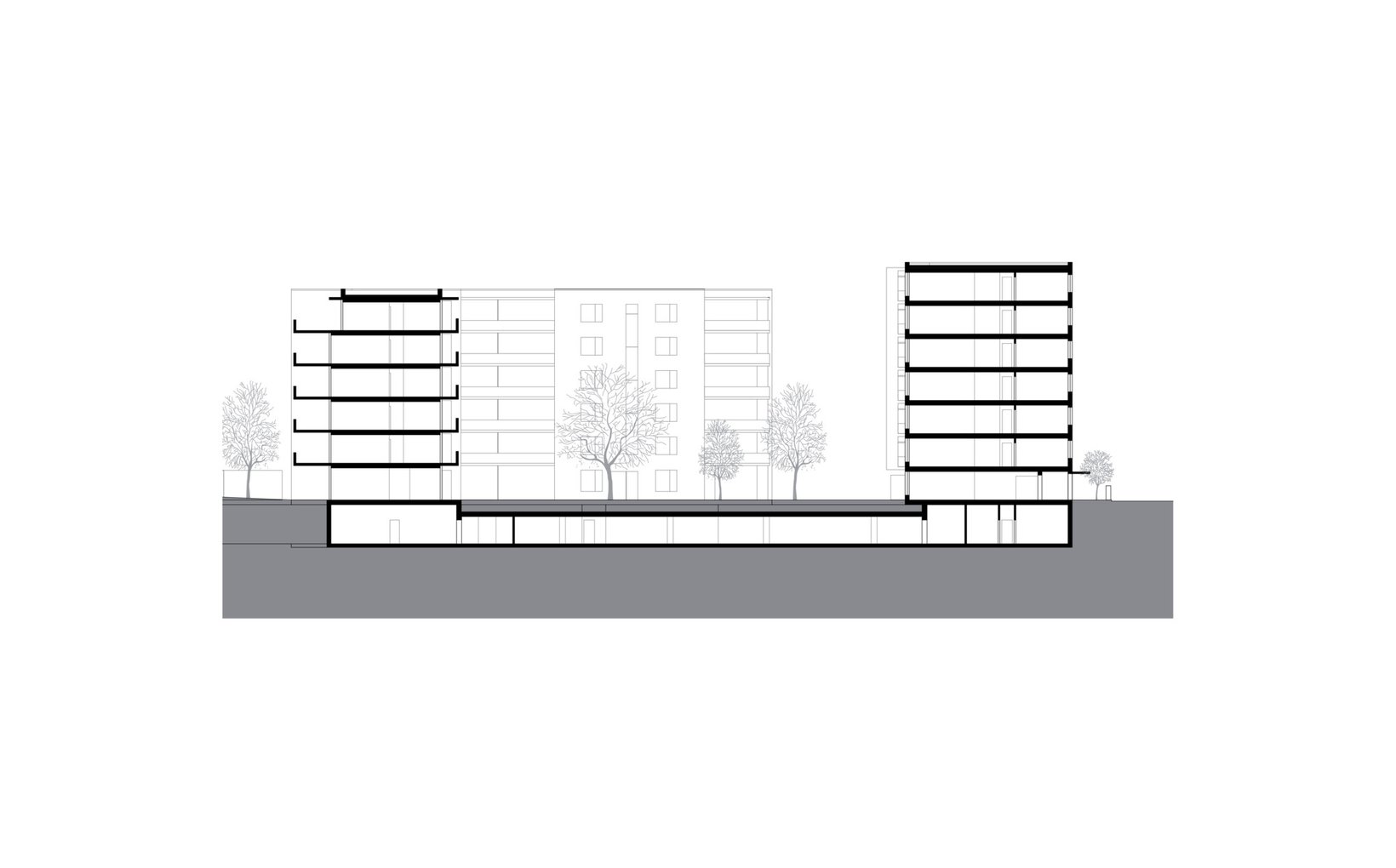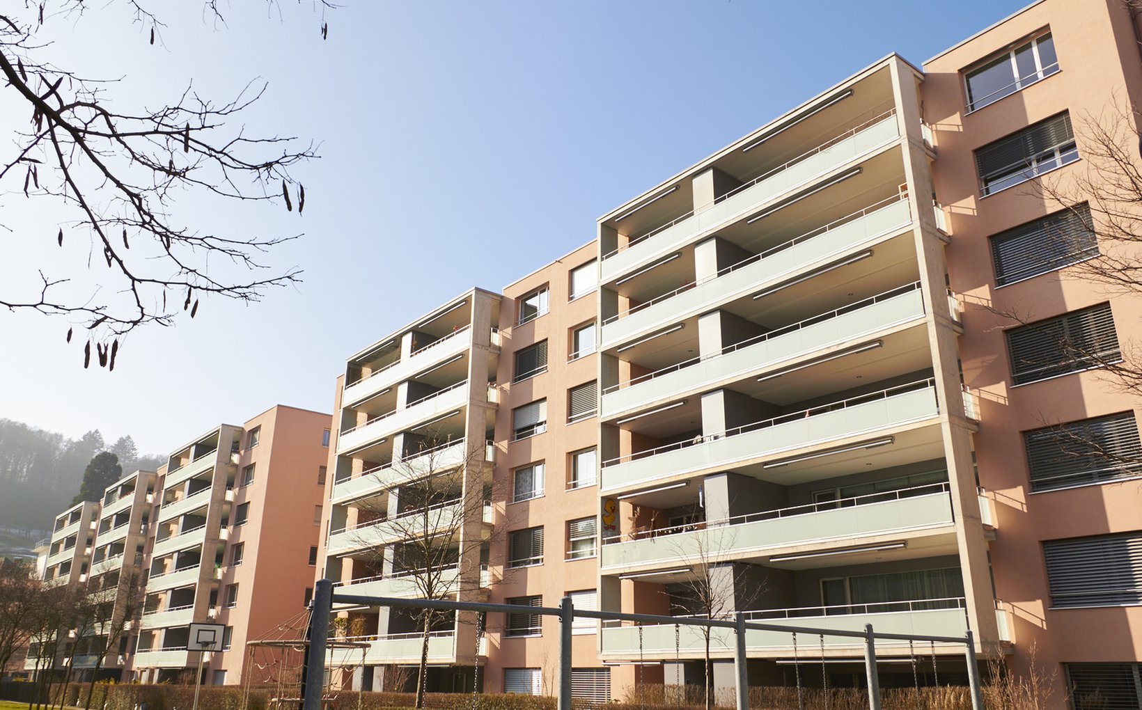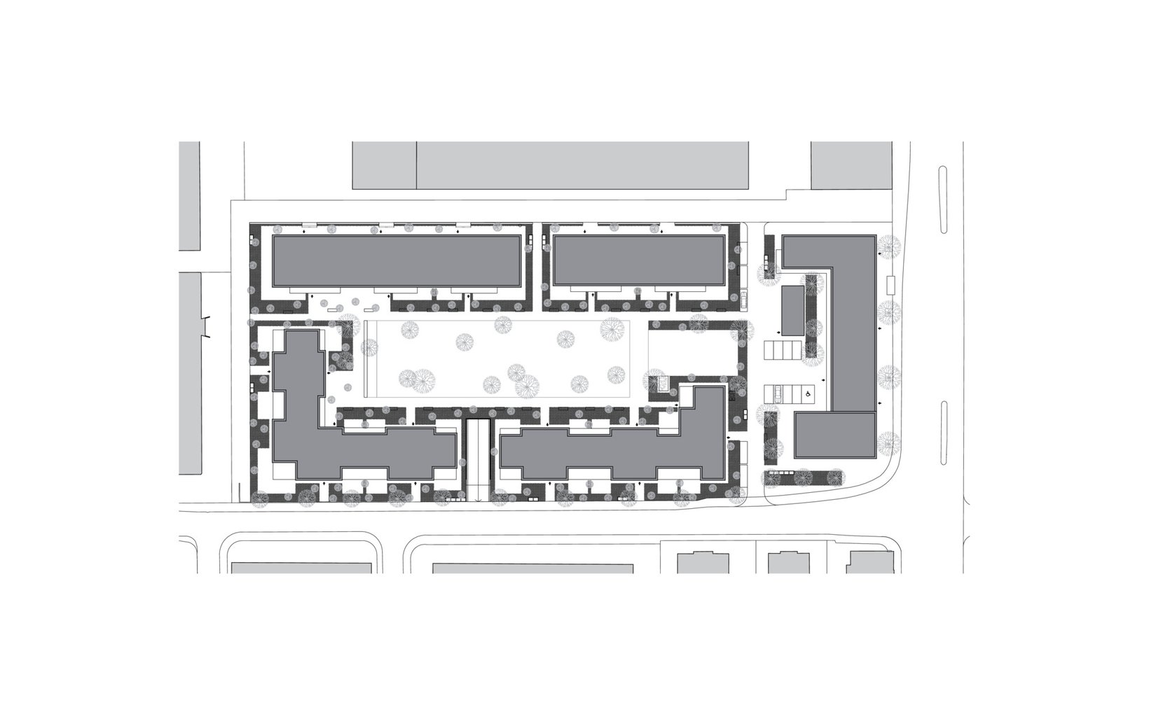 fsp: Fünf markante Wohnhäuser gruppieren sich um einen parkähnlichen Innenraum. Gebäude werden konsequent von aussen erschlossen, so dass die Nutzung des grünen Innenraums mit Sand-Spielplatz und gekiesten Aufenthaltsbereichen den Bewohnern vorbehalten bleibt. Zentrum der weitläufigen Anlage ist eine erhöhte Rasenfläche, die hainartig mit lichten Laubbäumen bepflanzt wurde. Entstanden sind 100 Miet- und 76 Eigentumswohnungen (und 226 Parkplätze) mit grosszügigen, auf den Parkraum bzw. die ruhige Wiesenstrasse ausgerichteten Balkonen.