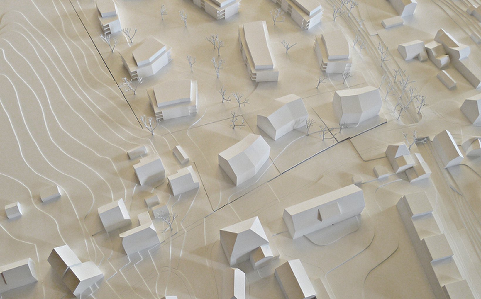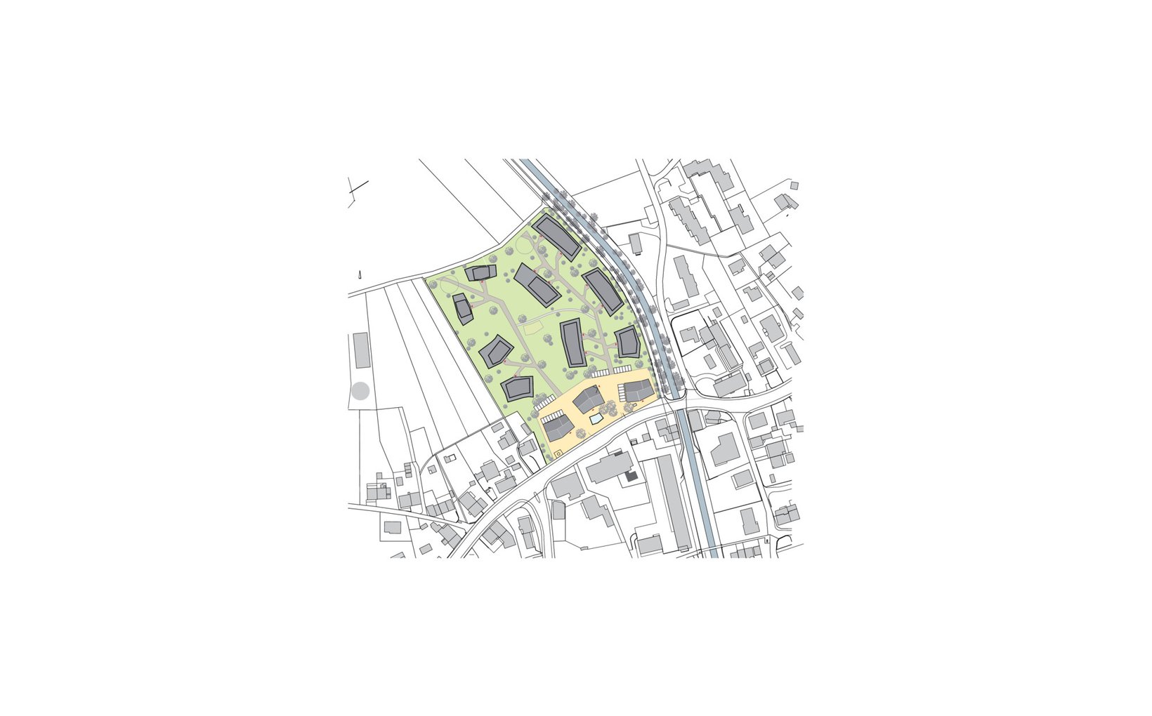 fsp: Den Auftakt zur Siedlung bildet ein öffentlicher Platz an der Kantonsstrasse sowie Gewerbeflächen. Zu den Rändern des Perimeters ist das Konzept allseitig durchlässig. Die Wohnungen sowie die privaten Aussenräume sind mehrseitig orientiert. Der gemeinschaftliche Grünraum umspült die lockere Bebauung. Das mögliche Hochwasser wird entlang des Rückens zur Bünz kanalisiert und kann zwischen der lockeren Bebauung abfliessen.