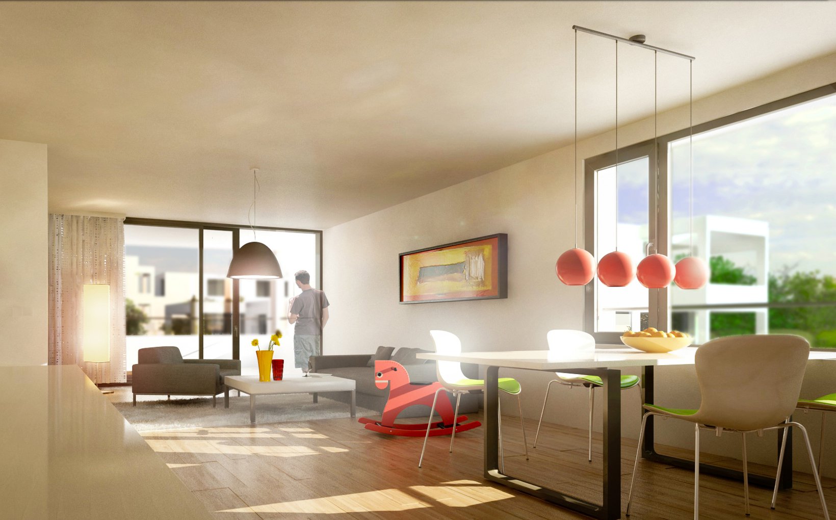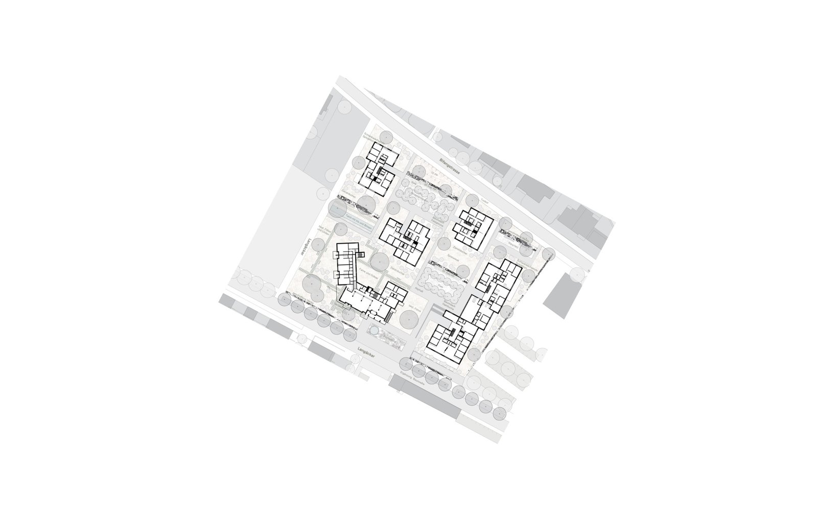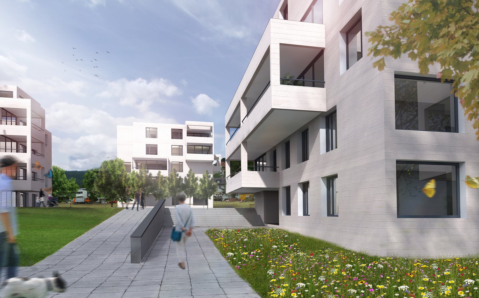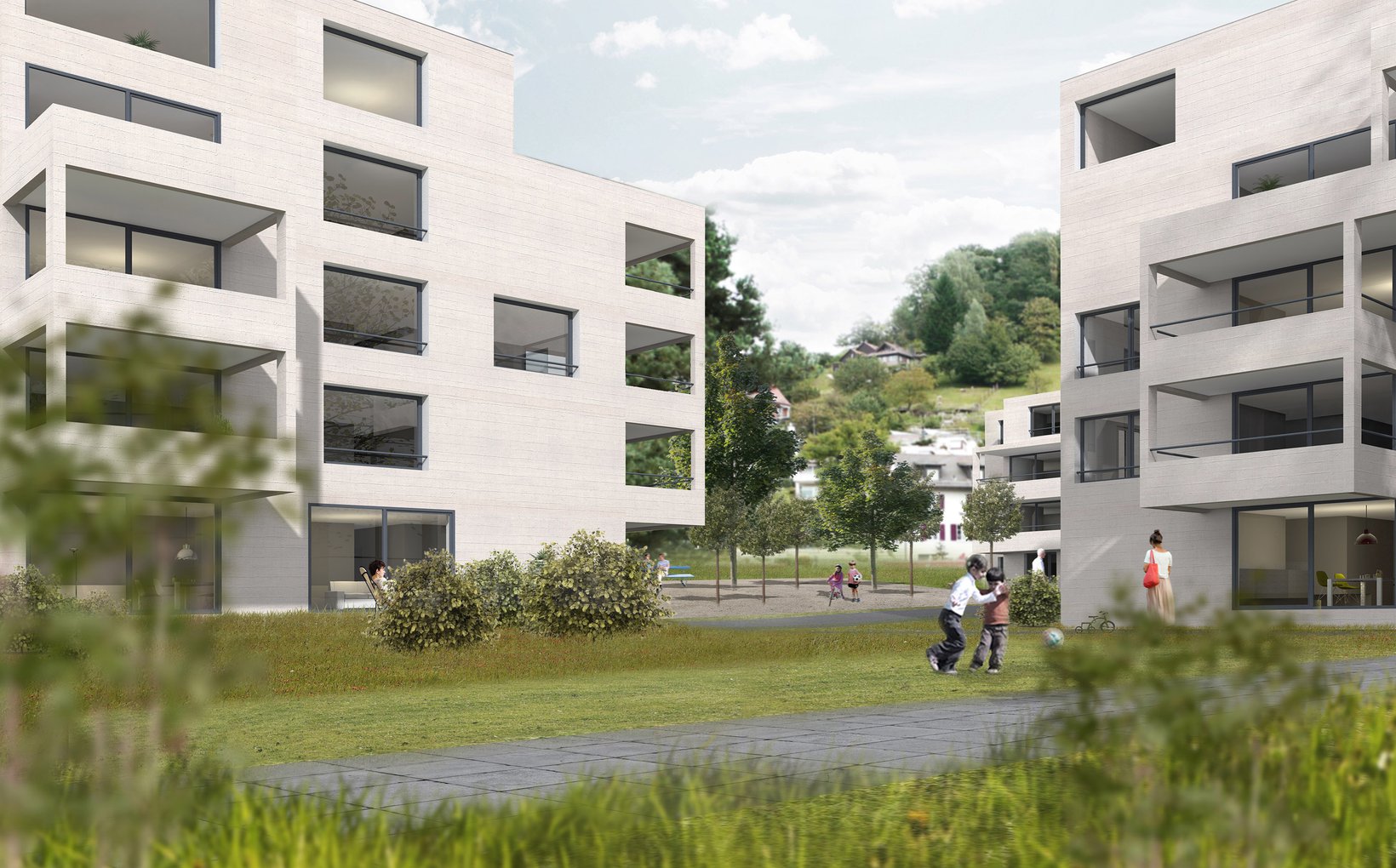 Die drei stark gegliederten Baukörper der Familienwohnungen beziehen sich auf einen gemeinsamen Aussenraum von welchem die Gebäude erschlossen sind. Mit ihren differenziert angeordneten, erkerartig vorspringenden Balkonen ergibt sich eine angenehme räumliche Erlebnisdichte für den Betrachter.