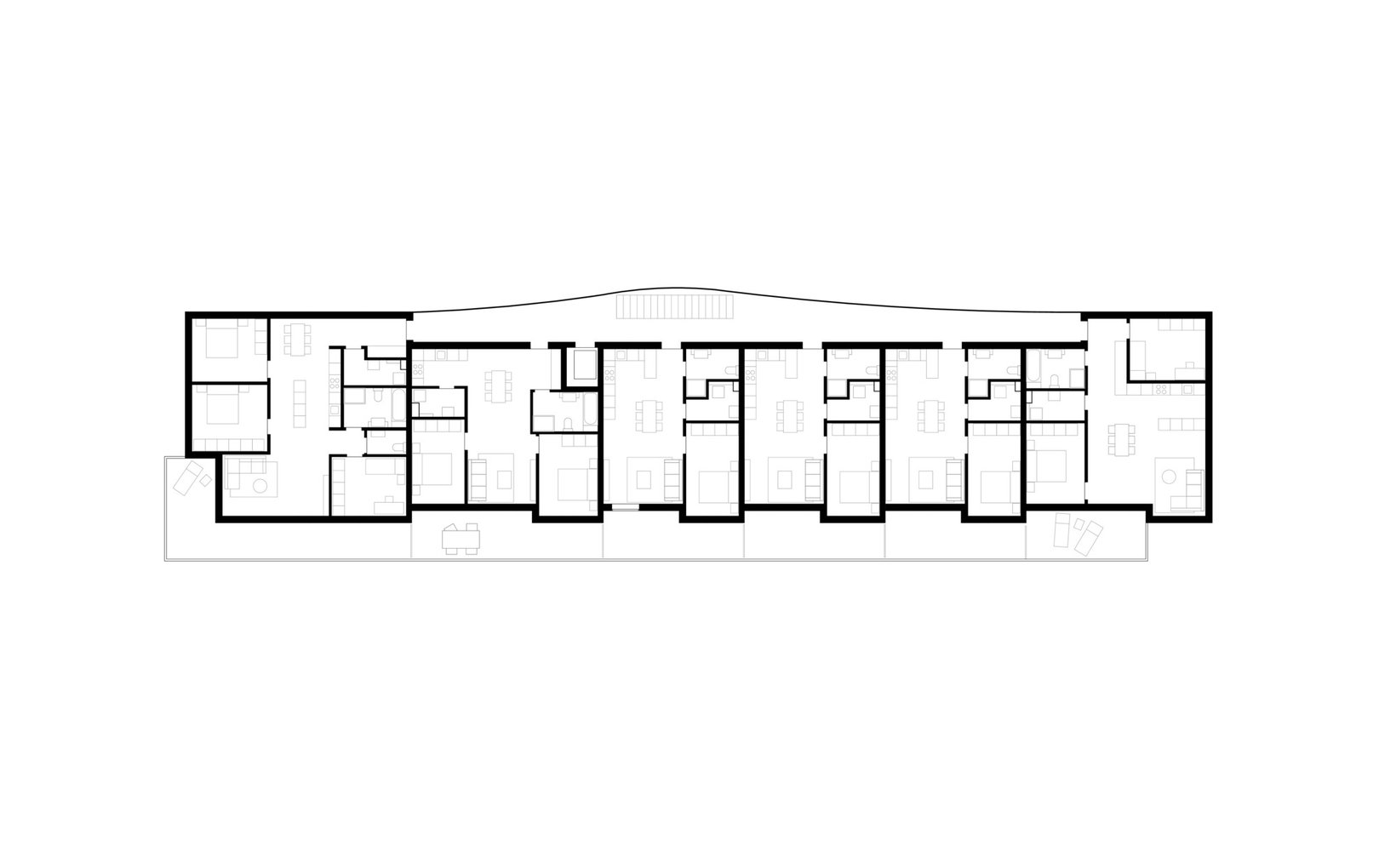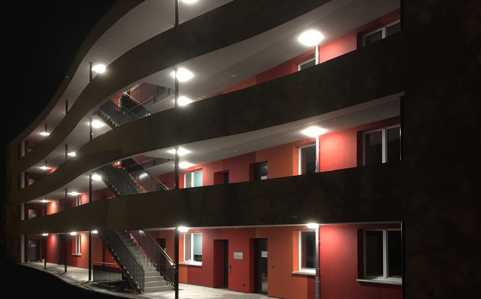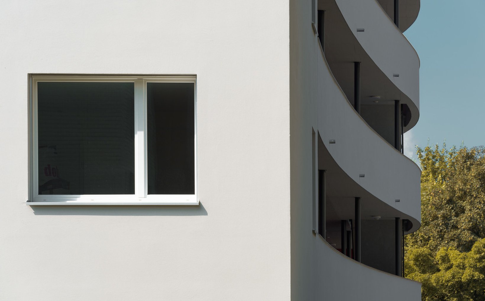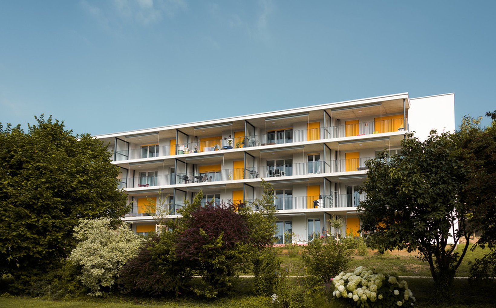 fsp: Der Laubengang wird als Promenadendeck in die ausgebauchte, an einen Schiffsrumpf erinnernde Gebäudehülle eingeschnitten: Das öffentliche Promenadendeck. Der südlich durchlaufende Balkon ist durch Vor- und Rücksprünge des Bauvolumens in Zonen gegliedert: Die privaten Sonnendecks. Die Abstände der Geländerstaketen sind so konfiguriert, dass eine visuelle Wellenbewegung suggeriert wird, welche die Gliederung der Privatzonen abbildet. Verschiebbare, transluzente Panels lassen sich durch die Bewohner individuell als Sicht- oder Sonnenschutz verschieben und ergeben ein lebendiges Erscheinungsbild.
