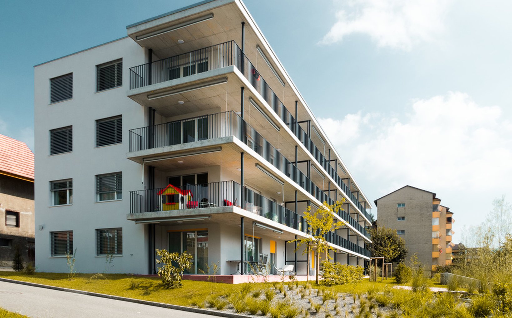 Ziel: Assoziation Schiff: Schlank, langgestreckt, durchgehende Erschliessungszonen und Balkone als Decks, Sonne, Emotionen, Feriengefühle.